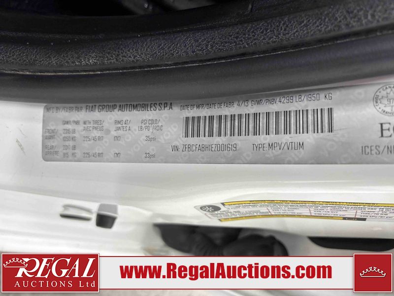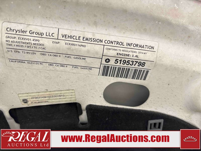 This 2014 FIAT 500L EASY 5D HATCHBACK is powered by a turbocharged 1.4L 4-cylinder gasoline engine and a 6-speed manual transmission. The car has seats for 5 people. The car has low mileage for its age. The vehicle has high-value options including a sunroof, leather upholstery, and heated seats. The vehicle has some mechanical problems. The engine runs rough. (See Footnote 1) The body looks to be in good condition overall. There are chips on the left rear door and rear door. There are scratches on the rear door. There is rust on the right rear fender. There are scratches on on rear bumper. There are very minor chips in many areas around the body. There are very minor scratches in many areas around the body. There is very minor dent damage on the right rear fender. The interior looks to be in good condition overall. The windshield looks to be in good condition. All of the tires have lots of tread remaining. This car is being sold by a private individual. The vehicle will be sold with the following declarations: Claims Total $1000 - $2999 (See Footnote 2) and Mechanical Problems (See Footnote 1). Footnotes: 1) We've identified some mechanical problems with the vehicle. However, the vehicle has not undergone a mechanical inspection and our findings are not to be considered a complete evaluation of the vehicle's mechanical condition. Review our Buyer Protection Policy to see how Regal Auctions protects you from undisclosed mechanical problems. 2) The vehicle's total recorded insurance claims history is between $1,000 - $2,999. This is the amount of money that was paid out by an insurance company for repairs to cover claims against the vehicle's insurance policy. This information is provided by CarFax. Regal Auctions Ltd. makes no guarantee or warranty, either express or implied, with respect to the data provided in this report. The information has been provided from the consignor and from sources generally believed to be reliable, however the accuracy of this information cannot be guaranteed by Regal Auctions.