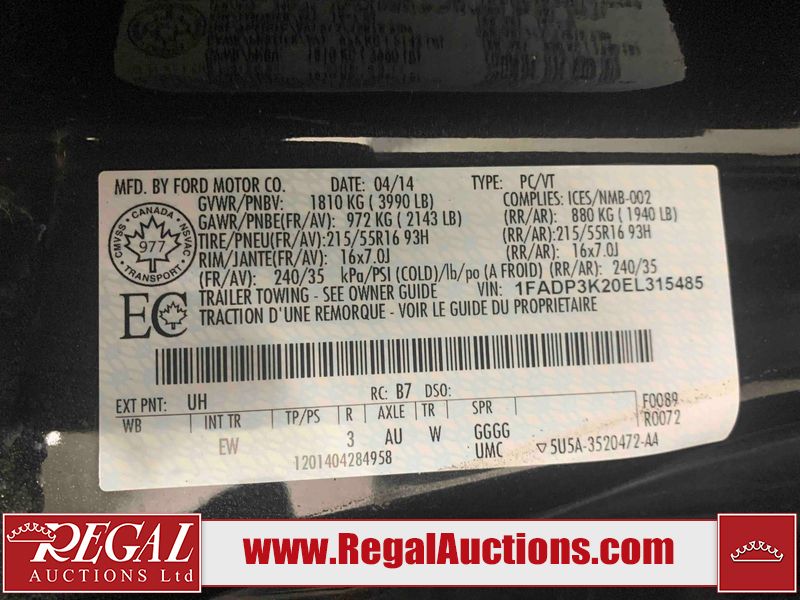 This 2014 FORD FOCUS SE 4D HATCHBACK is powered by a 2.0L 4-cylinder gasoline engine and an automatic transmission. The car has seats for 5 people. The mileage is average considering the car's age. The body looks to be in fair condition overall. There are minimal scratches on the front bumper and rear bumper. There is slight dent damage on the left rear door and right rear door. There are very minor chips in many areas around the body. There are very minor scratches in many areas around the body. The interior looks to be in fair condition overall. The dashboard and doors are worn. The windshield looks to be in good condition. All of the tires have lots of tread remaining. This car is being sold by an automotive broker. The vehicle will be sold with the following declarations: Rebuilt Status (See Footnote 1) and Out of Province - BC (See Footnote 2). Footnotes: 1) This vehicle has been rebuilt from salvage. 2) The vehicle's last registered jurisdiction is British Columbia. The purchaser must have the vehicle undergo and pass an Out of Province inspection before it can be registered in Alberta. Regal Auctions Ltd. makes no guarantee or warranty, either express or implied, with respect to the data provided in this report. The information has been provided from the consignor and from sources generally believed to be reliable, however the accuracy of this information cannot be guaranteed by Regal Auctions.