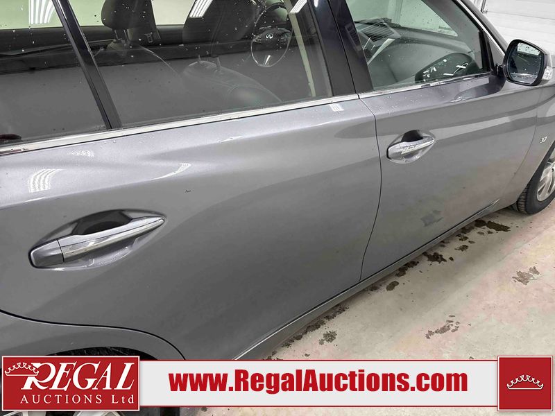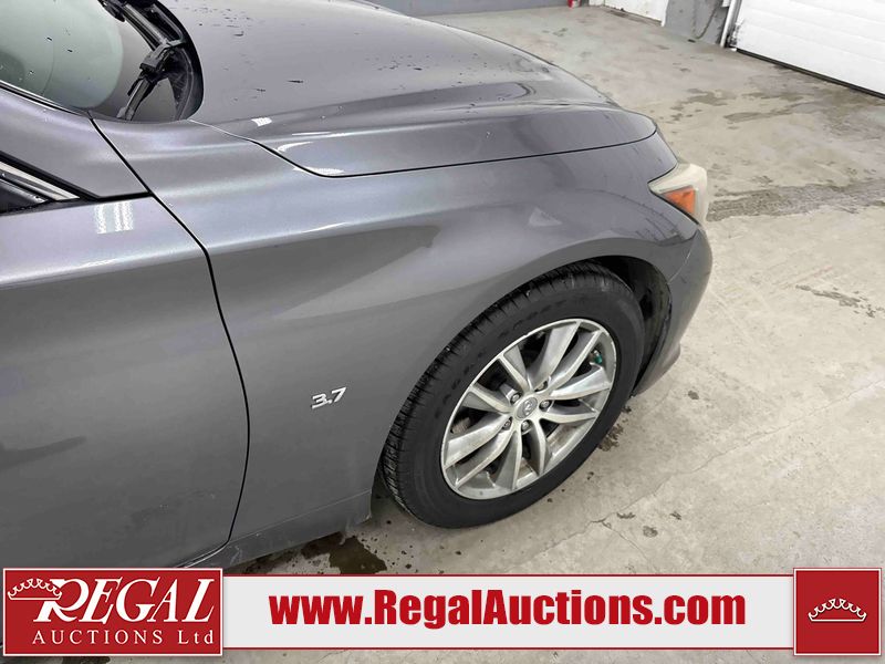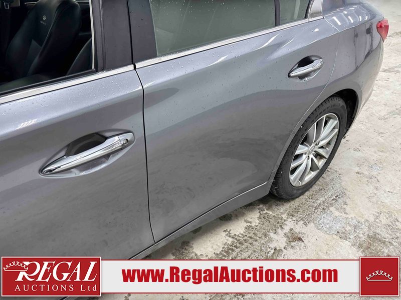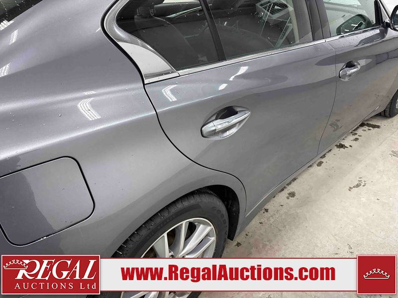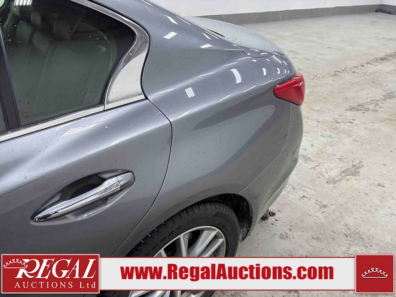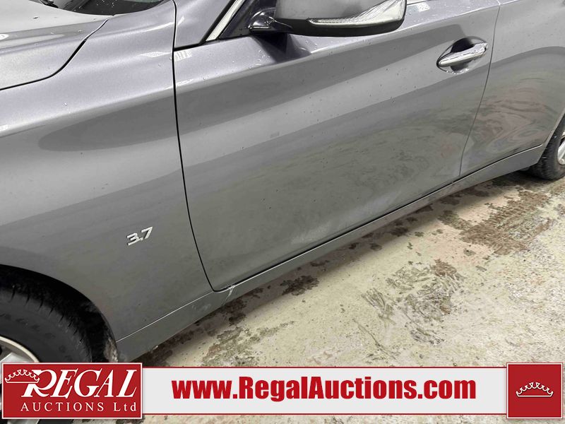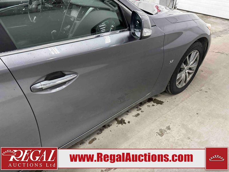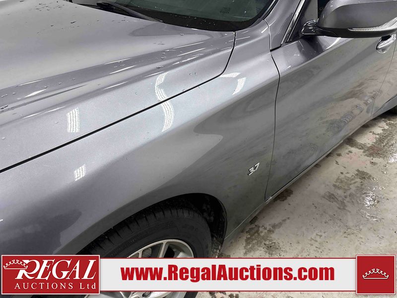 This 2014 INFINITI Q50 4D SEDAN AWD is powered by a 3.7 liter 6 cylinder gasoline engine and an automatic transmission. It is equipped with four wheel drive. The car has seats for 5 people. The mileage is average considering the car's age. The vehicle has high value options including a sunroof, leather upholstery, power seats, heated seats, navigation, and a backup camera. The body looks to be in fair condition overall. There is a fair amount of hail on the hood and roof. There is hail on the trunk lid and right rear fender. There are chips in many areas around the body. There are scratches in many areas around the body. The interior looks to be in good condition overall. The windshield looks to be in good condition. All of the tires have lots of tread remaining. This car is being sold by an automotive broker. The vehicle will be sold with the following declarations: Hail Damage (See Footnote 1). Footnotes: 1) This vehicle shows signs of damage from a hail storm. Hail damage is not always clearly visible in photographs. Regal Auctions Ltd. makes no guarantee or warranty, either express or implied, with respect to the data provided in this report. The information has been provided from the consignor and from sources generally believed to be reliable, however the accuracy of this information cannot be guaranteed by Regal Auctions.