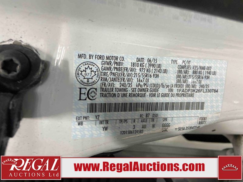 This 2015 FORD FOCUS SE 4D HATCHBACK FWD 2.0L is powered by a 160HP 2.0L 4 cylinder gasoline engine and an automatic transmission. The car has seats for 5 people. The car has low mileage for its age. The vehicle has high value options including heated seats and a backup camera. The body looks to be in fair condition overall. The front bumper is cracked. The right rear door has been repainted poorly. There are incidental chips on the hood and rear bumper. There are minimal scratches on the left front fender and right front door. There is slight dent damage on the right rear door and right front door. There is minor paint peeling on the right rear door. There are very minor chips in many areas around the body. There are very minor scratches in many areas around the body. There is very minor dent damage on the left front door. The interior looks to be in good condition overall. The windshield looks to be in good condition. All of the tires are nearly bald and should be replaced. Footnotes: 1) The vehicle's last registered jurisdiction is British Columbia. The purchaser must have the vehicle undergo and pass an Out of Province inspection before it can be registered in Alberta. 2) The vehicle has pased an out of province inspection and can be registered in Alberta Regal Auctions Ltd. makes no guarantee or warranty, either express or implied, with respect to the data provided in this report. The information has been provided from the consignor and from sources generally believed to be reliable, however the accuracy of this information cannot be guaranteed by Regal Auctions.