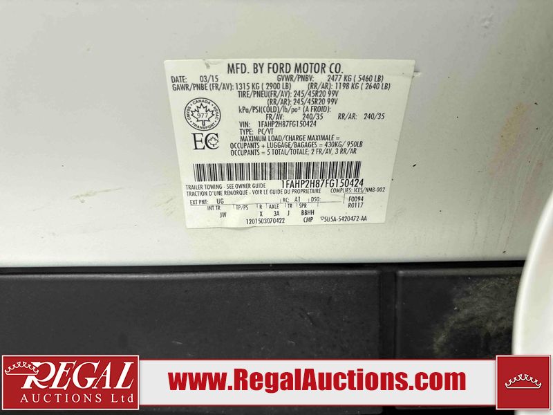 This 2015 FORD TAURUS SEL 4D SEDAN AWD is powered by a 3.5L V6 gasoline engine and an automatic transmission. It is equipped with all-wheel drive. The car has seats for 5 people. The mileage is average considering the car's age. The vehicle has high-value options including a sunroof, leather upholstery, power seats, navigation, and a backup camera. The Stability Control light is on. The body looks to be in fair condition overall. The rear bumper is cracked. There is rust on the roof and right front fender. There are minor scratches on the left front door. There are very minor chips in many areas around the body. There are very minor scratches in many areas around the body. The interior looks to be in good condition overall. The windshield is cracked. The front tires are both worn. The rear tires both have lots of tread remaining. This car is being sold by an automotive broker. The vehicle will be sold with the following declarations: Claims Total $3000 - $4999 (See Footnote 1). Footnotes: 1) The vehicle's total recorded insurance claims history is between $3,000 - $4,999. This is the amount of money that was paid out by an insurance company for repairs to cover claims against the vehicle's insurance policy. This information is provided by CarFax. Regal Auctions Ltd. makes no guarantee or warranty, either express or implied, with respect to the data provided in this report. The information has been provided from the consignor and from sources generally believed to be reliable, however the accuracy of this information cannot be guaranteed by Regal Auctions.