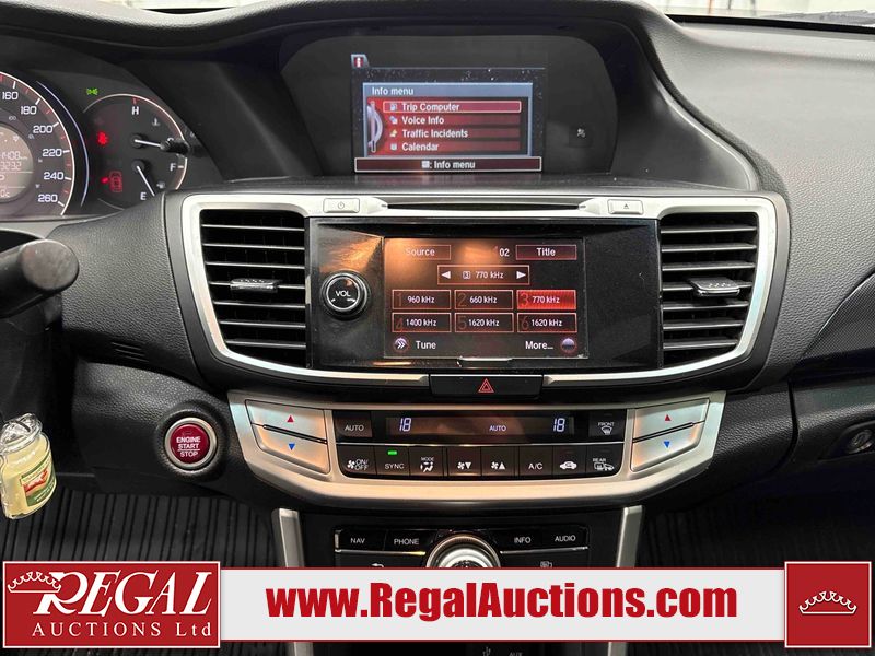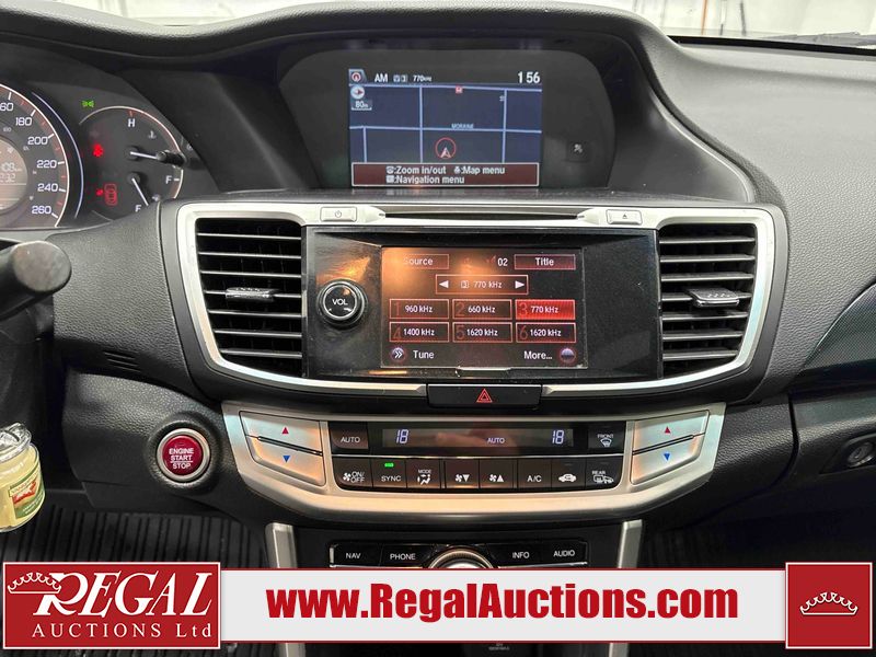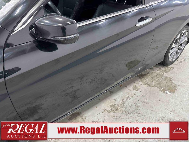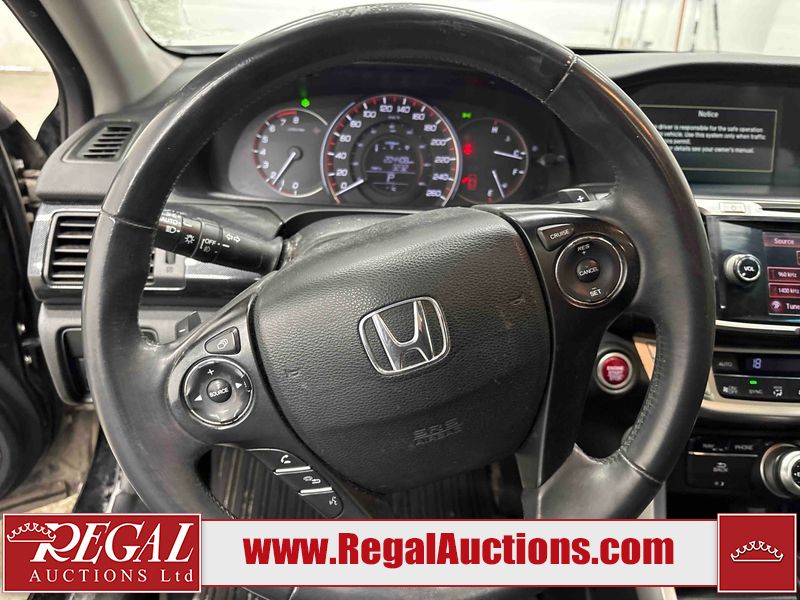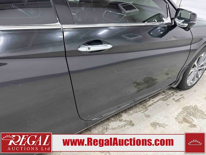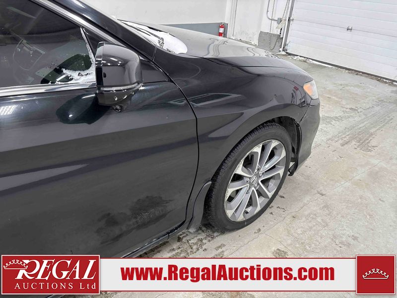 This 2015 HONDA ACCORD 4D SEDAN is powered by a 3.5 liter 6-cylinder gasoline engine and an automatic transmission. The car has seats for 5 people. The mileage is average considering the car's age. The vehicle has high-value options, including a sunroof, leather upholstery, power seats, heated seats, and navigation. The body looks to be in fair condition overall. The front bumper is broken. There are scratches on the roof, right rear fender, and right front door. There is minor dent damage on the roof, rear bumper, and trunk lid. There is rust on the roof. There are chips in many areas around the body. There are scratches in many areas around the body. There is dent damage in a few areas around the body. The fog lights are broken. The interior looks to be in good condition overall. The windshield is cracked. The front tires are both worn. The rear tires both have lots of tread remaining. This car is being sold by an automotive broker. Regal Auctions Ltd. makes no guarantee or warranty, either express or implied, with respect to the data provided in this report. The information has been provided from the consignor and from sources generally believed to be reliable, however the accuracy of this information cannot be guaranteed by Regal Auctions.