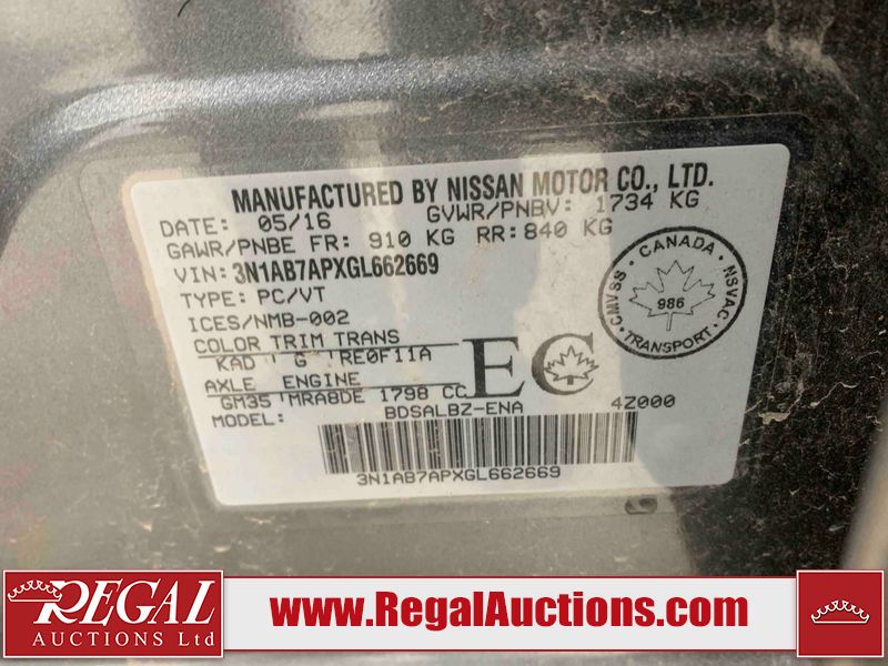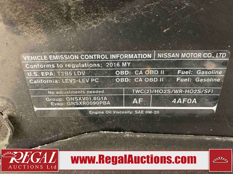 This 2016 NISSAN SENTRA 4D SEDAN is powered by a 1.8 liter 4 cylinder gasoline engine and an automatic transmission. The car has seats for 5 people. The car has low mileage for its age. The body looks to be in good condition overall. There is minor dent damage on the left front door, right rear fender, and right rear door. There are minor scratches on the left front door, right rear fender, and right rear door. There is rust on the left front door. There are chips in a few areas around the body. There are scratches in many areas around the body. The interior looks to be in good condition overall. The windshield looks to be in good condition. All of the tires have lots of tread remaining. This car is being sold by an automotive broker. The vehicle will be sold with the following declarations: Claims Total $10,000 - $14,999 (See Footnote 1), Out of Province - BC (See Footnote 2), and Out of Province - AB OVERRIDE (See Footnote 3). Footnotes: 1) The vehicle's total recorded insurance claims history is between $10,000 - $14,999. This is the amount of money that was paid out by an insurance company for repairs to cover claims against the vehicle's insurance policy. This information is provided by CarFax. 2) The vehicle's last registered jurisdiction is British Columbia. The purchaser must have the vehicle undergo and pass an Out of Province inspection before it can be registered in Alberta. 3) Out of province inspection for registering the vehicle in Alberta has been completed. Regal Auctions Ltd. makes no guarantee or warranty, either express or implied, with respect to the data provided in this report. The information has been provided from the consignor and from sources generally believed to be reliable, however the accuracy of this information cannot be guaranteed by Regal Auctions.