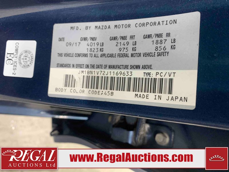 This 2018 MAZDA MAZDA3 TOURING 4D SEDAN is powered by a 2.0L 4-cylinder gasoline engine and an automatic transmission. The car has seats for 5 people. The car has low mileage for its age. The vehicle has high-value options including heated seats and a backup camera. The body looks to be in good condition overall. The front bumper has parts missing. There is minor dent damage on the trunk lid and right front door. There are very minor chips in many areas around the body. There are very minor scratches in many areas around the body. The interior looks to be in good condition overall. There are moderate stains on the driver's seat. The windshield is cracked. All of the tires have lots of tread remaining. This car is being sold by an automotive broker. Regal Auctions Ltd. makes no guarantee or warranty, either express or implied, with respect to the data provided in this report. The information has been provided from the consignor and from sources generally believed to be reliable, however the accuracy of this information cannot be guaranteed by Regal Auctions.