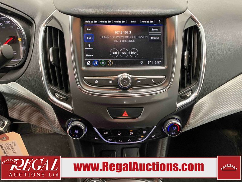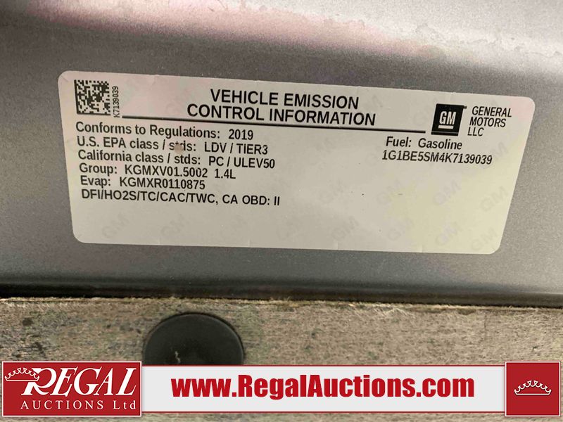 This 2019 CHEVROLET CRUZE LT 4 SPORT UTILITY is powered by a turbocharged 1.4L 4-cylinder gasoline engine and an automatic transmission. The car has seats for 5 people. The mileage is average considering the car's age. The vehicle has high-value options, including heated seats and a backup camera. The Tire Pressure light is on. The body looks to be in good condition overall. There is minor hail damage on the hood and trunk. There is a dent on the hood. There are slight chips on the front bumper and hood. There is a dent on the trunk lid. There are scratches on the rear bumper. There are very minor chips in some areas around the body. There are very minor scratches in many areas around the body. The interior looks to be in fair condition overall. There are pronounced stains on the passenger seat and rear seats. There are cigarette burns on the driver's seat. The carpet is dirty. The windshield looks to be in good condition. Both rear tires and the passenger side front tire are worn. The driver's side front tire has lots of tread remaining. This car is being sold by an automotive broker. The vehicle will be sold with the following declarations: Hail Damage (See Footnote 1). Footnotes: 1) This vehicle shows signs of damage from a hail storm. Hail damage is not always clearly visible in photographs. Regal Auctions Ltd. makes no guarantee or warranty, either express or implied, with respect to the data provided in this report. The information has been provided from the consignor and from sources generally believed to be reliable, however the accuracy of this information cannot be guaranteed by Regal Auctions.