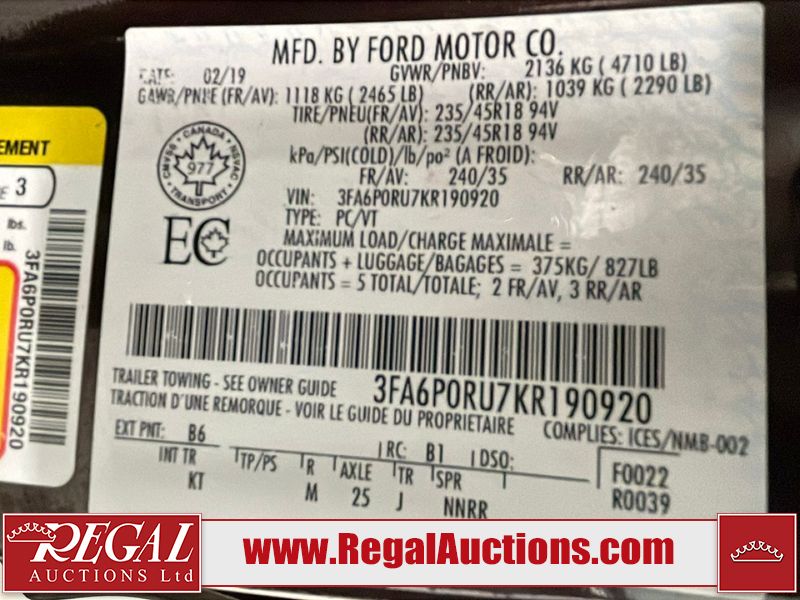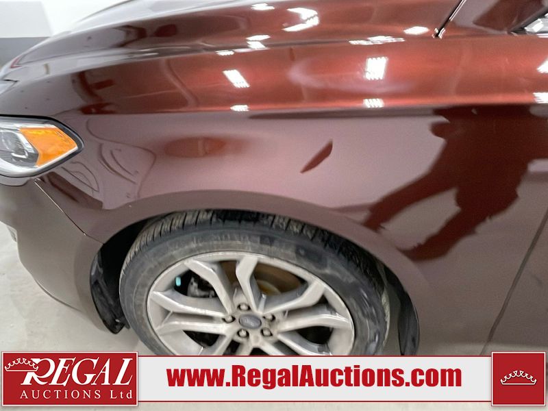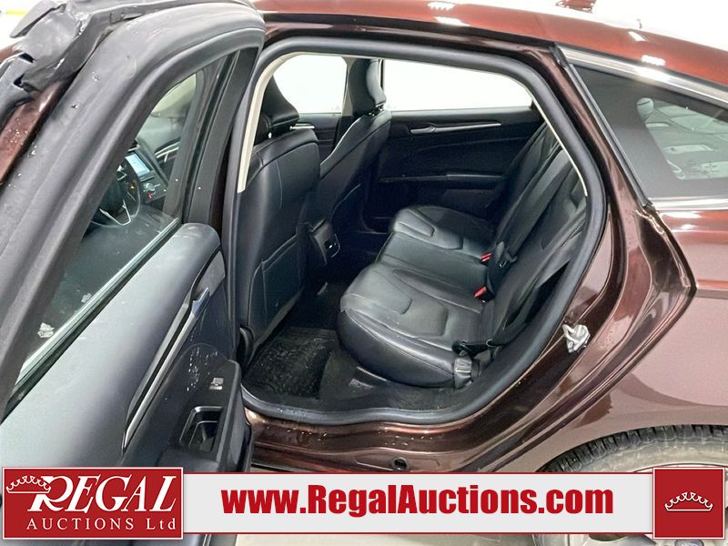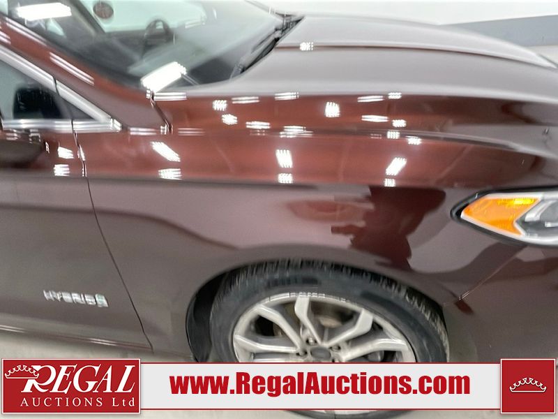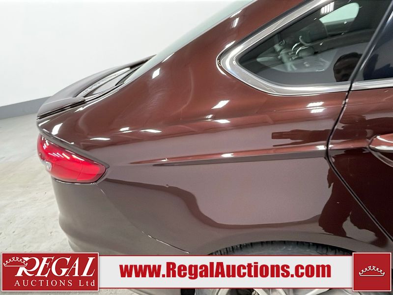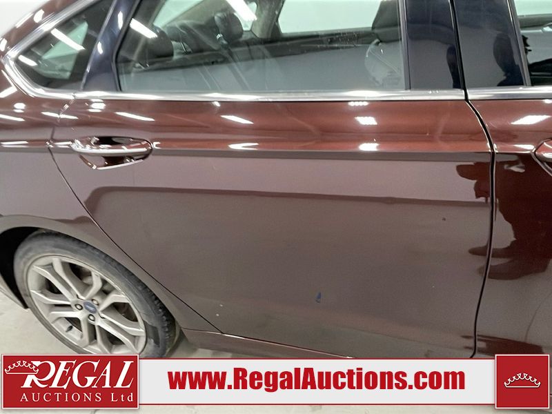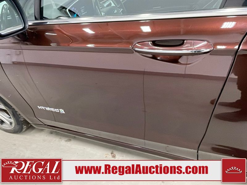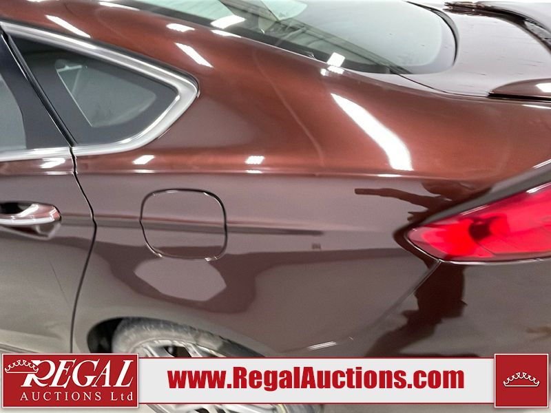 This 2019 FORD FUSION HYBRID TITANIUM HEV 4D SEDAN AWD 2.0L is powered by a 4 cylinder hybrid engine and an automatic transmission. It is equipped with four wheel drive. The car has seats for 5 people. The mileage is average considering the car's age. The vehicle has high value options including a sunroof, leather upholstery, power seats, heated seats, navigation, and a backup camera. The body looks to be in fair condition overall. There is substantial hail on the hood. The fascia is broken on the front bumper. There is conspicuous paint peeling on the trunk lid. There are slight chips on the front bumper, hood, left front fender, and right front fender. There are incidental scratches on the rear bumper. There is incidental hail on the right front fender. There are very minor scratches in many areas around the body. There are very minor chips in many areas around the body. There is very minor dent damage in a few areas around the body. The interior looks to be in good condition overall. The carpet is dirty. The windshield looks to be in good condition. All of the tires have lots of tread remaining.