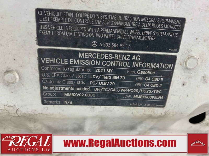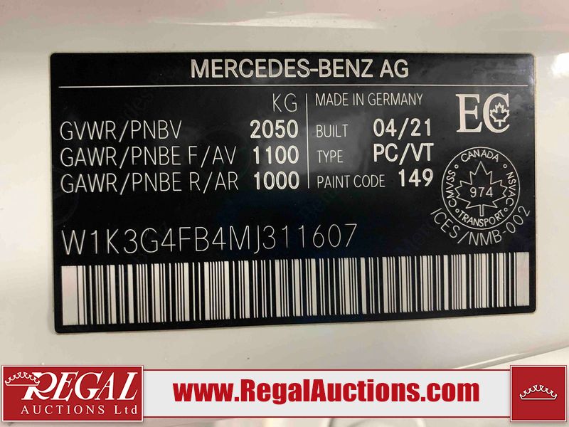 This 2021 MERCEDES-BENZ A220 4D SEDAN is powered by a turbocharged 2.0L 4-cylinder gasoline engine and an automatic transmission. The car has seats for 5 people. The car has high mileage for its age. The vehicle has high value options including a sunroof, leather upholstery, power seats, navigation, and a backup camera. The body looks to be in good condition overall. There are chips on the hood and left front fender. There are very minor chips in many areas around the body. There are very minor scratches in many areas around the body. The interior looks to be in good condition overall. The windshield looks to be in good condition. The front tires are nearly bald and should be replaced. The rear tires have lots of tread. This car is being sold by a franchise dealership. The vehicle will be sold with the following declarations: Dealership Trade-In (See Footnote 1). Footnotes: 1) This vehicle is being sold on behalf of a franchise dealership. Franchise Dealerships are automotive sales companies who are directly connected to an automotive manufacturer like Ford, Tesla, Honda, BMW, or similar. Regal Auctions Ltd. makes no guarantee or warranty, either express or implied, with respect to the data provided in this report. The information has been provided from the consignor and from sources generally believed to be reliable, however the accuracy of this information cannot be guaranteed by Regal Auctions.