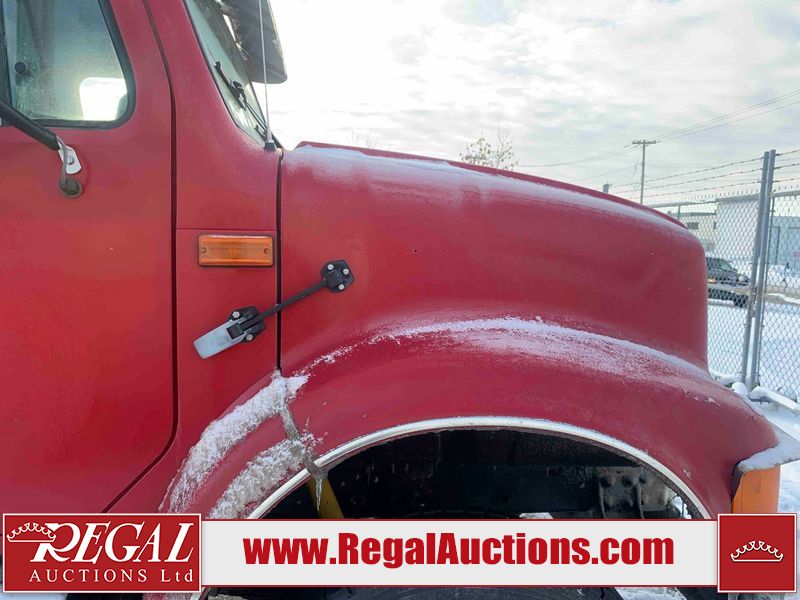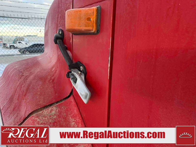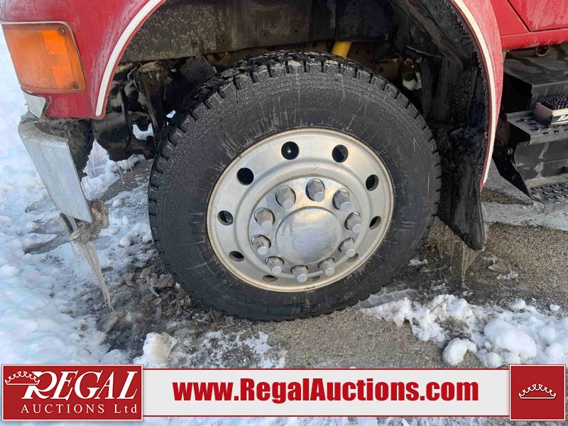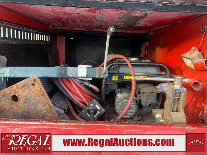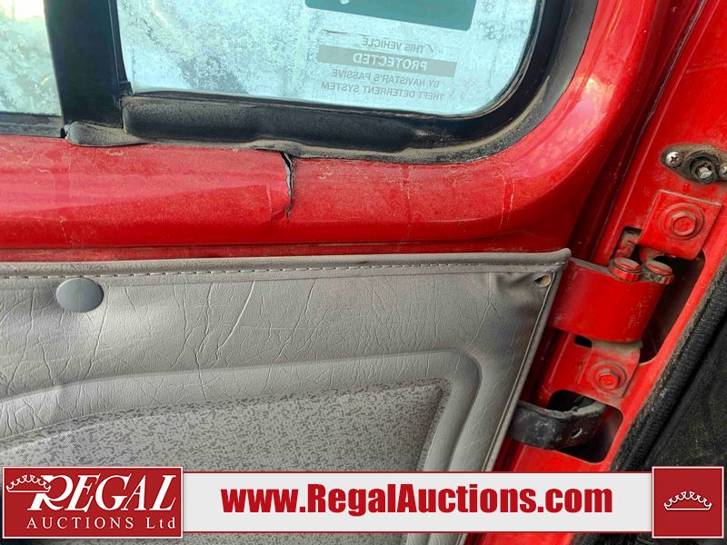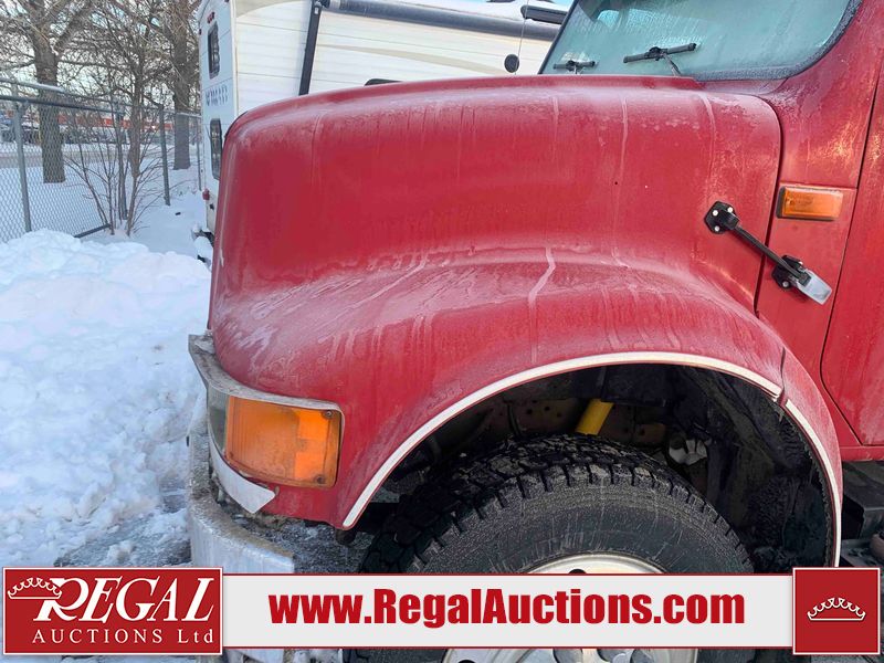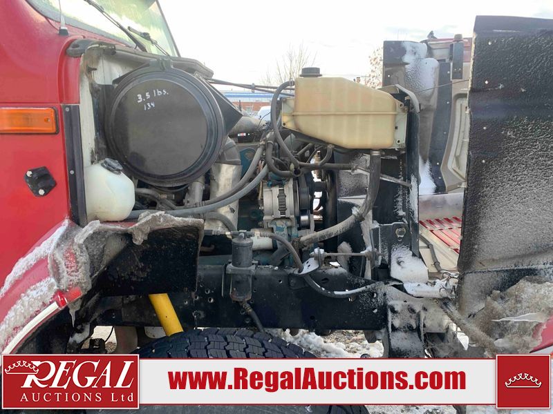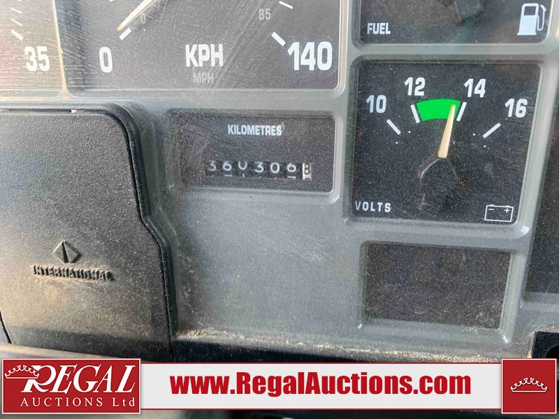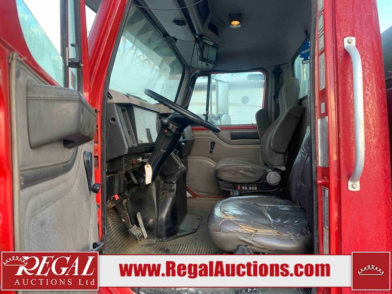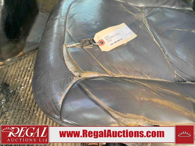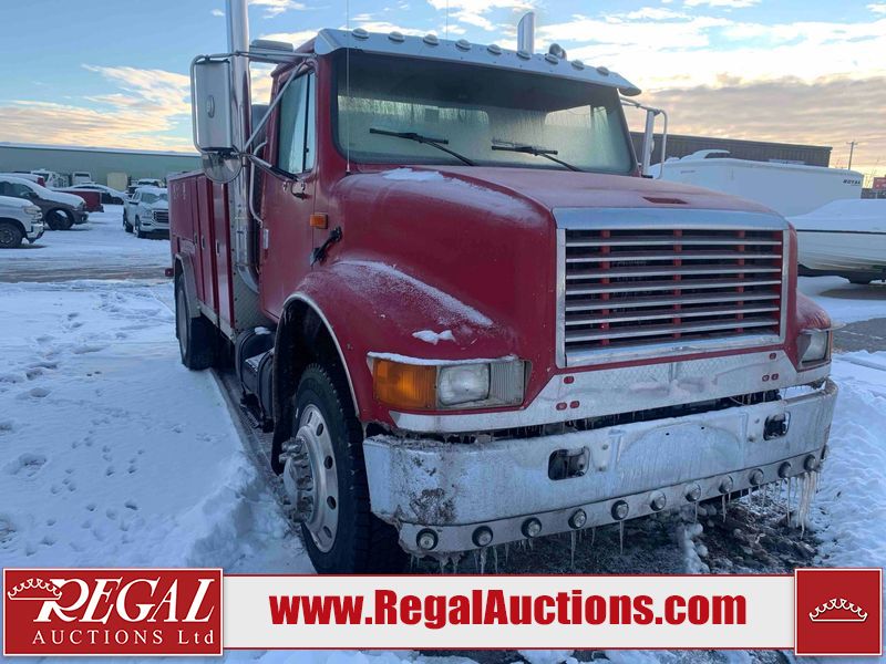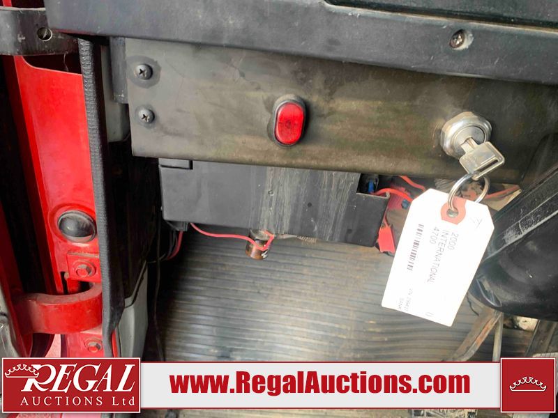 This unit is a 2000 International 4700 day cab single axle service truck. The odometer shows 360,306 km. It has a GVWR of 30,000lbs. Its CVIP is 10/2024. The interior is dirty. The seats are worn. The dash has scratches and scuffs, the whole interior is showing its age. The driver’s door is cracked from the interior. This unit is equipped with a aftermarket stereo system, and a back up camera. The backup camera and stereo system is inoperable. The front end is showing chips, scratches, and stops. The grill has a dent. The engine cover has peeling paint. Both doors are are chipped. The left front utility door is cracked. Both rear fenders has peeling paint. The rear bumper has penetrating rust. The left rear refractor lamp is broken. All the rear utility panels are showing scratches and scuffs. This unit starts and runs with a boost. This unit is powered by a DT466E 7.6 L in-line six cylinder turbo diesel engine and an automatic transmission. There is no emissions sticker. The tires have been mounted to steel rims and appear to be good enough condition for use. This unit is equipped with air brakes, and an engine shut down switch. It has a front axle of 10,000 pounds and a rear axle of 20,000 pounds.