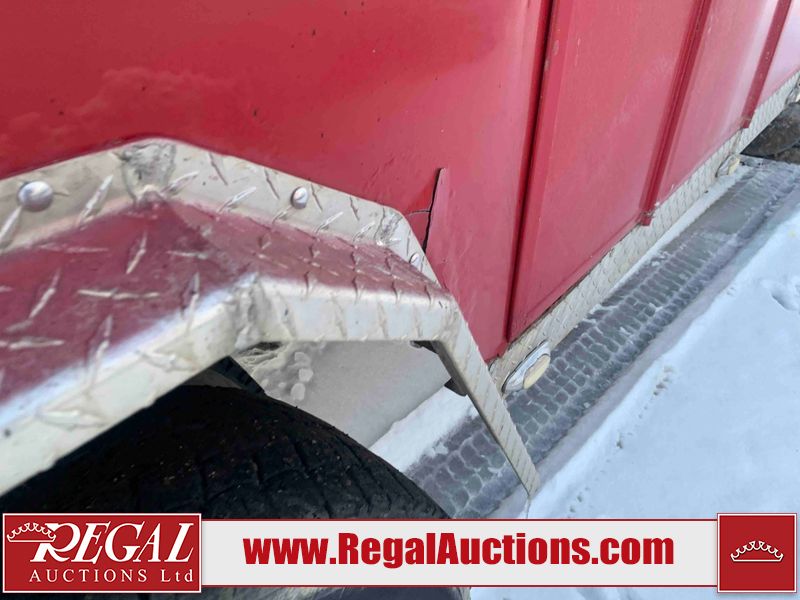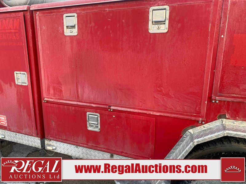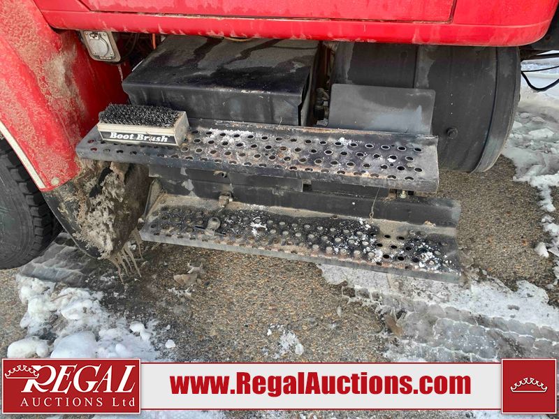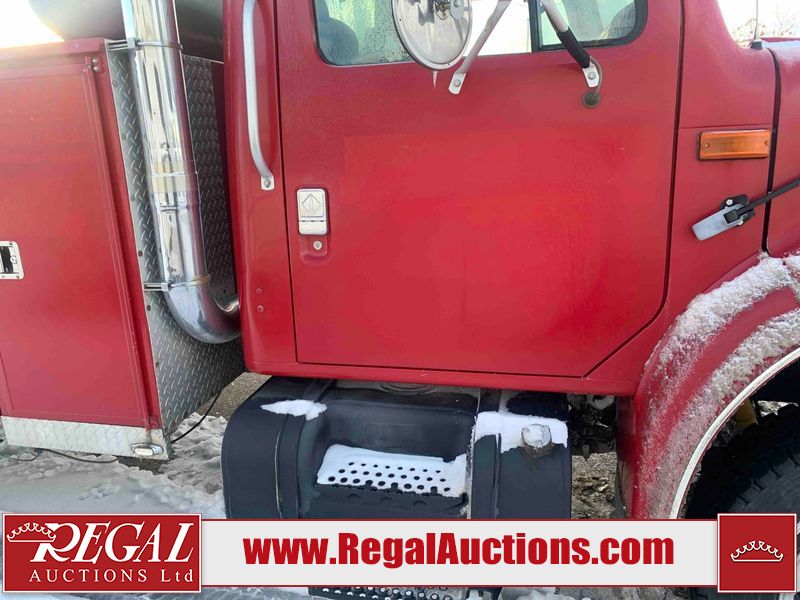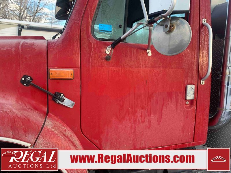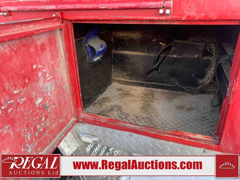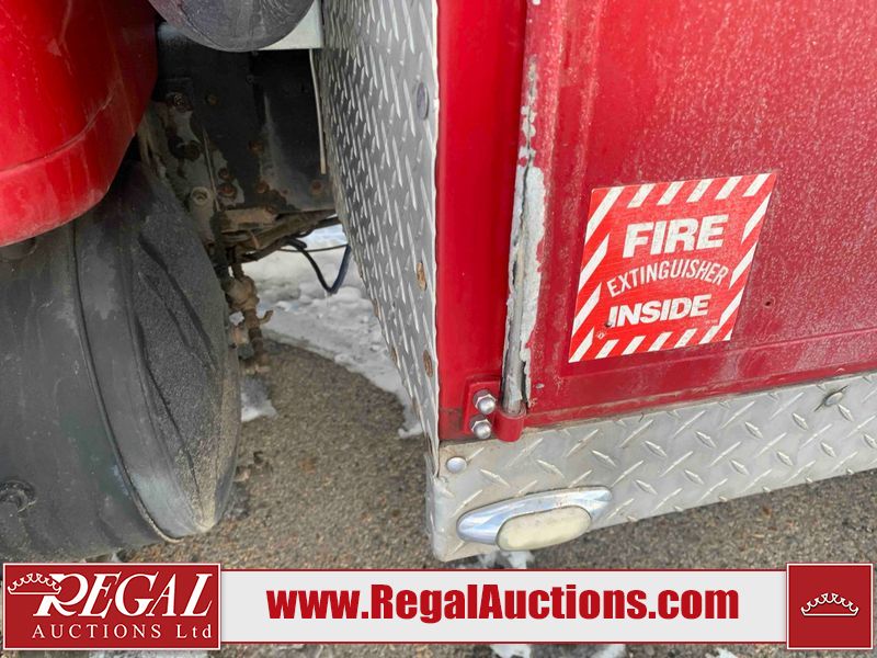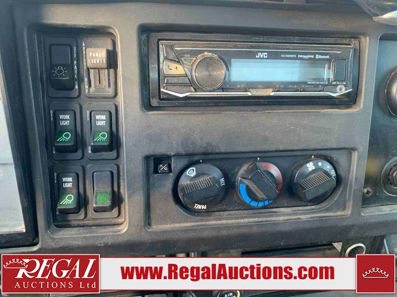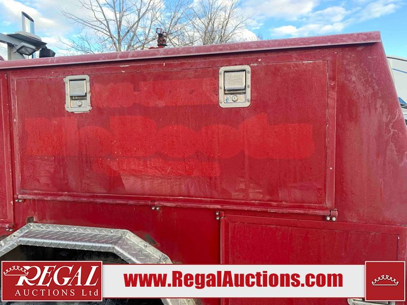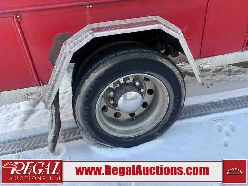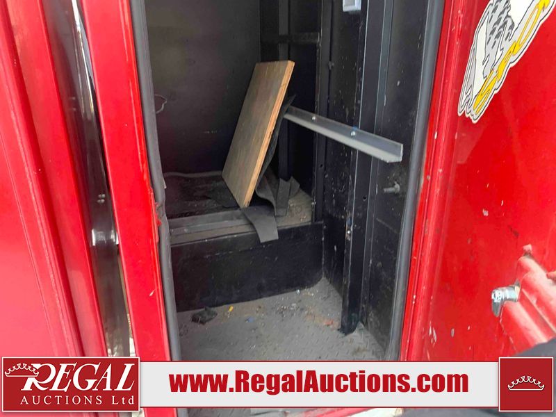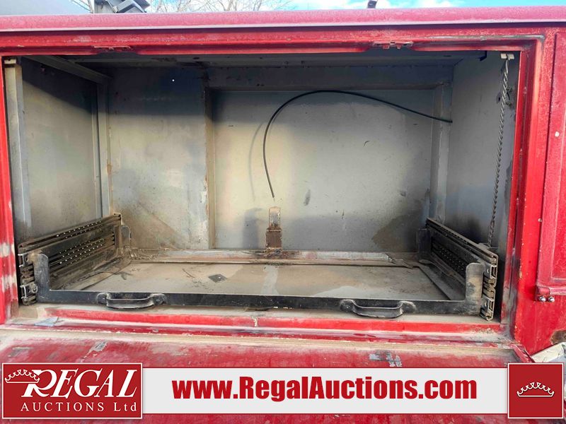 This unit is a 2000 International 4700 day cab single axle service truck. The odometer shows 360,306 km. It has a GVWR of 30,000lbs. Its CVIP is 10/2024. The interior is dirty. The seats are worn. The dash has scratches and scuffs, the whole interior is showing its age. The driver’s door is cracked from the interior. This unit is equipped with a aftermarket stereo system, and a back up camera. The backup camera and stereo system is inoperable. The front end is showing chips, scratches, and stops. The grill has a dent. The engine cover has peeling paint. Both doors are are chipped. The left front utility door is cracked. Both rear fenders has peeling paint. The rear bumper has penetrating rust. The left rear refractor lamp is broken. All the rear utility panels are showing scratches and scuffs. This unit starts and runs with a boost. This unit is powered by a DT466E 7.6 L in-line six cylinder turbo diesel engine and an automatic transmission. There is no emissions sticker. The tires have been mounted to steel rims and appear to be good enough condition for use. This unit is equipped with air brakes, and an engine shut down switch. It has a front axle of 10,000 pounds and a rear axle of 20,000 pounds.