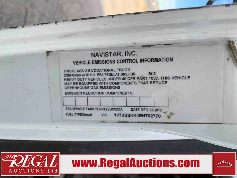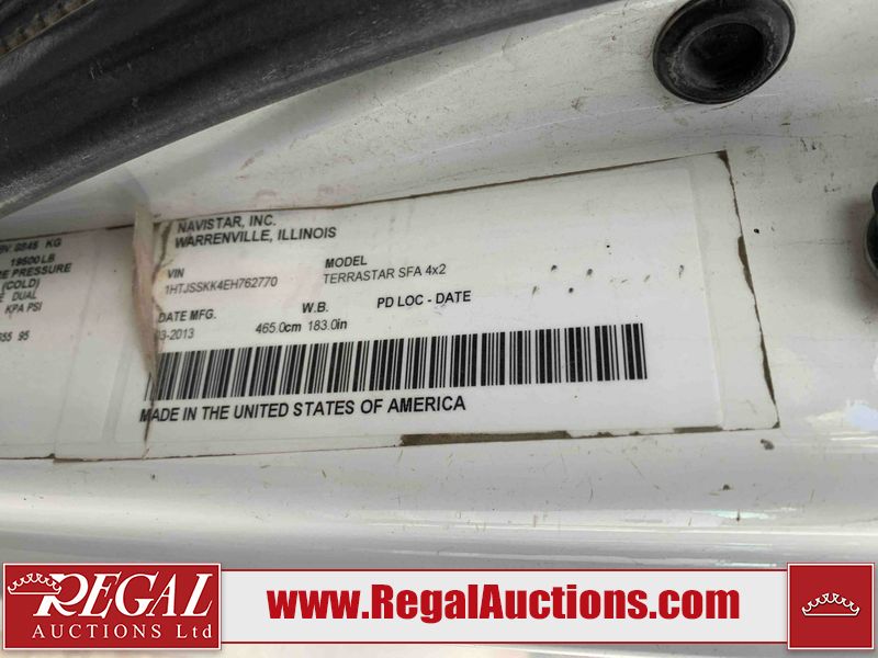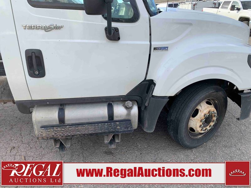 This unit is a 2014 international terra star SFA 4x2 model. the odometer reads 121,070 km and 4740 engine hours. This unit has a CVIP expiry of 01/2026. The GVWR is 20,500 LBS. The interior is dirty. Both seats are torn. The headliner has stains. The doors have scratches. The front bumper is bent. The engine cover is broken/cracked. The engine cover has chips and scratches. The roof has peeling paint. Both doors have scratches and surface rust. The windshield is cracked. The engine starts and runs with without a boost. This unit is powered by 6.4 Litre eight cylinder, max force, turbo diesel engine and an automatic transmission. This unit is equipped with a stereo.