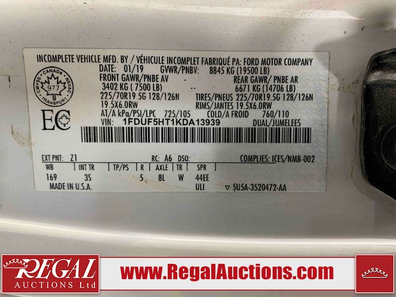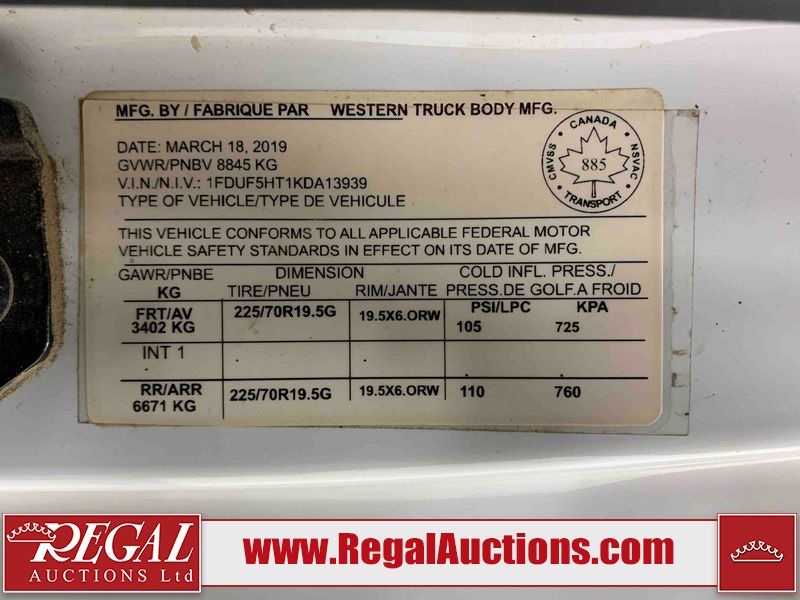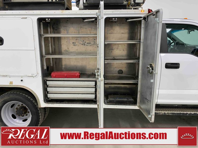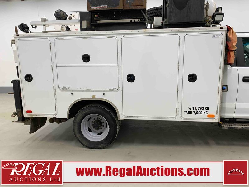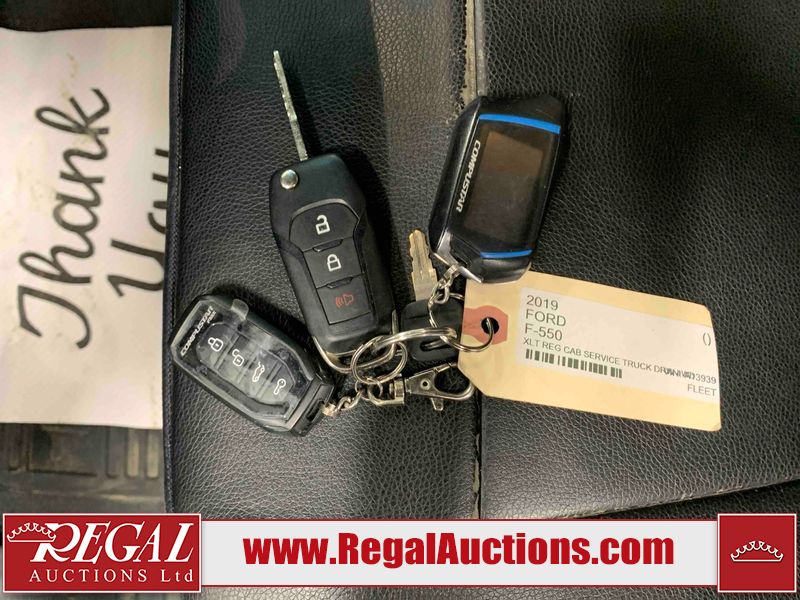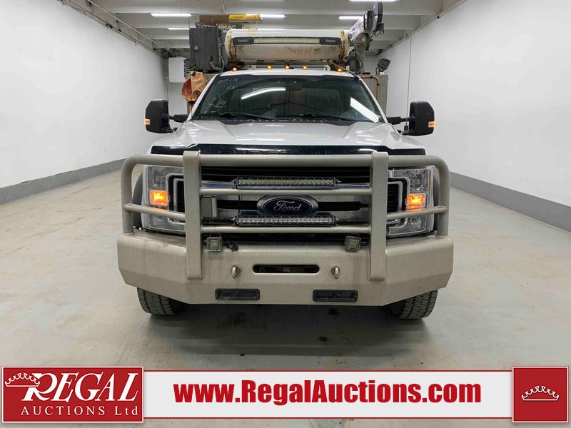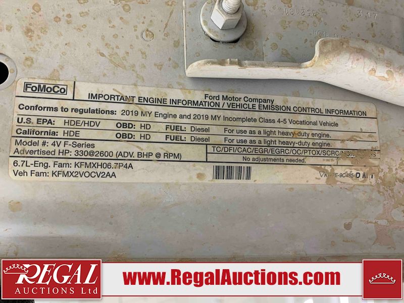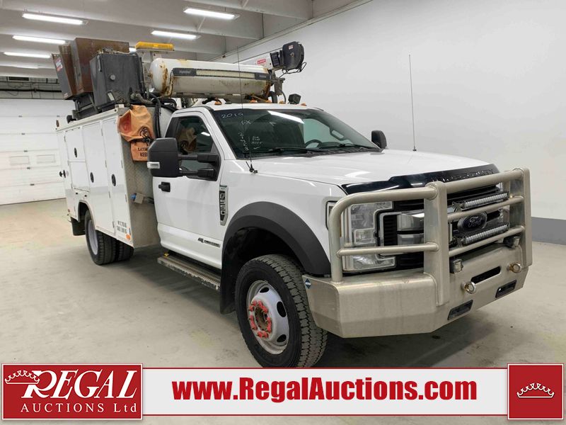 This 2019 FORD F-550 REG CAB SERVICE TRUCK DRW 4WD is powered by a 6.7 liter 8-cylinder engine and an automatic transmission. It is equipped with four-wheel drive. The truck has seats for 3 people. The truck has high mileage for its age. The vehicle has high-value options, including a backup camera. The body looks to be in fair condition overall. There is substantial hail on the hood. There is moderate rust on the rear bumper. There are slight chips on the front bumper. There are incidental scratches on the front bumper. There is minor dent damage on the left front fender. There are scratches in a few areas around the body. There are chips in a few areas around the body. The interior looks to be in good condition overall. The roofliner is dirty. The windshield is chipped. The driver side mirror is broken. All of the tires have lots of tread remaining. This equipment - heavy truck is being sold by the fleet department of a corporation or government body. The vehicle will be sold with the following declarations: Fleet Vehicle (See Footnote 1) and Hail Damage (See Footnote 2). Footnotes: 1) This vehicle is a commercially owned work vehicle. 2) This vehicle shows signs of damage from a hail storm. Hail damage is not always clearly visible in photographs. Regal Auctions Ltd. makes no guarantee or warranty, either express or implied, with respect to the data provided in this report. The information has been provided from the consignor and from sources generally believed to be reliable, however the accuracy of this information cannot be guaranteed by Regal Auctions.