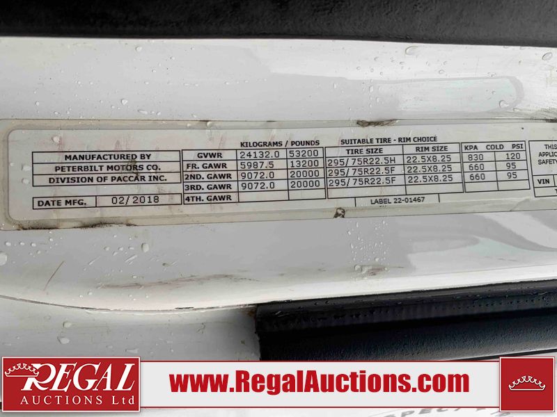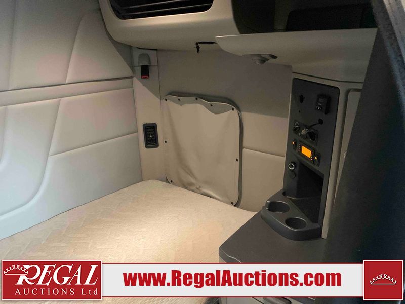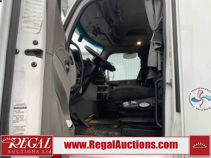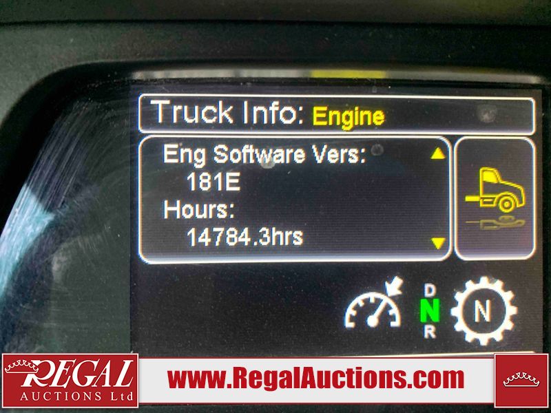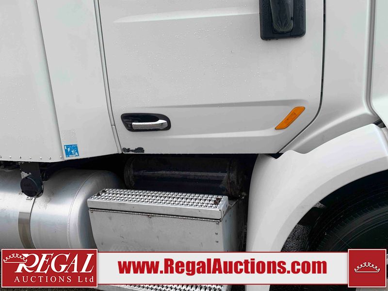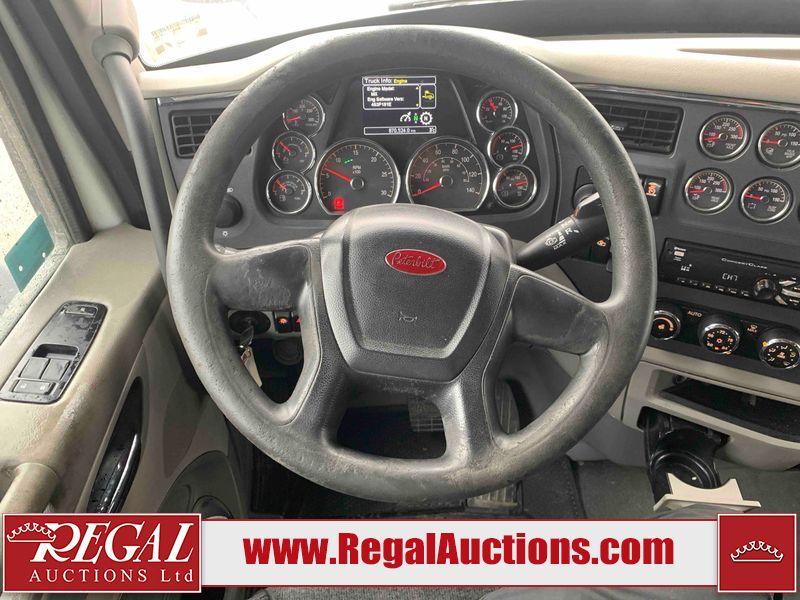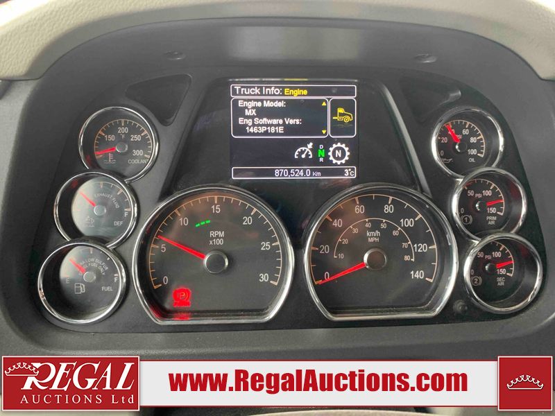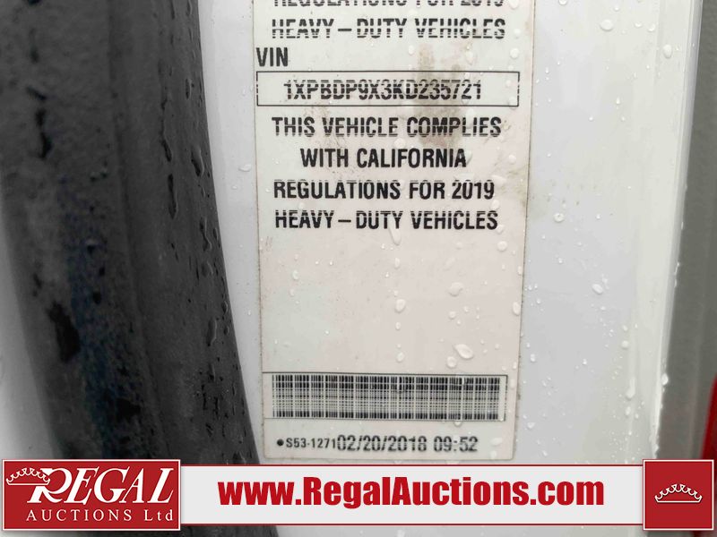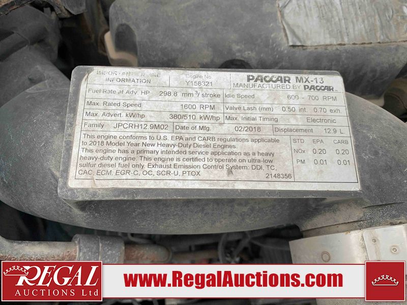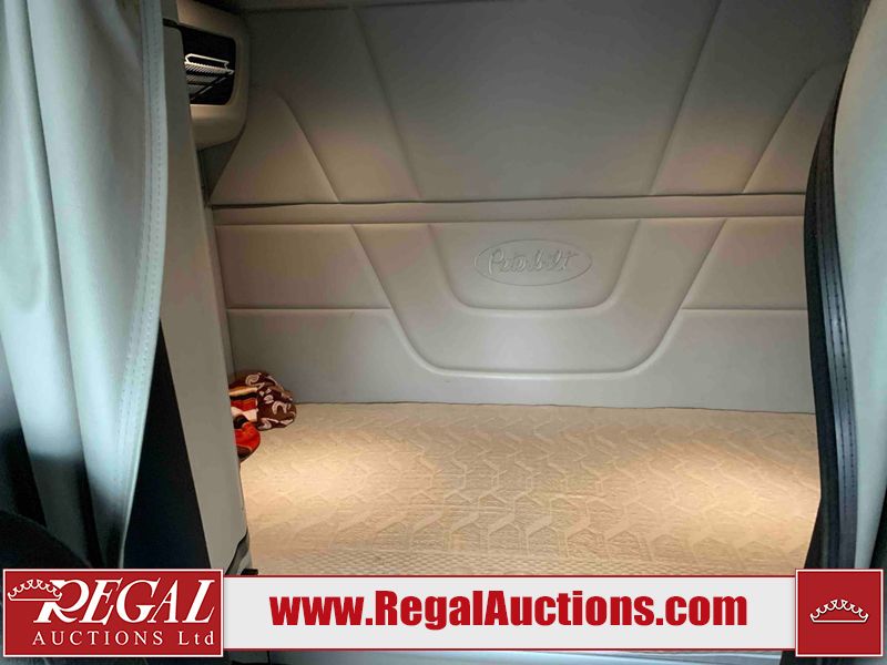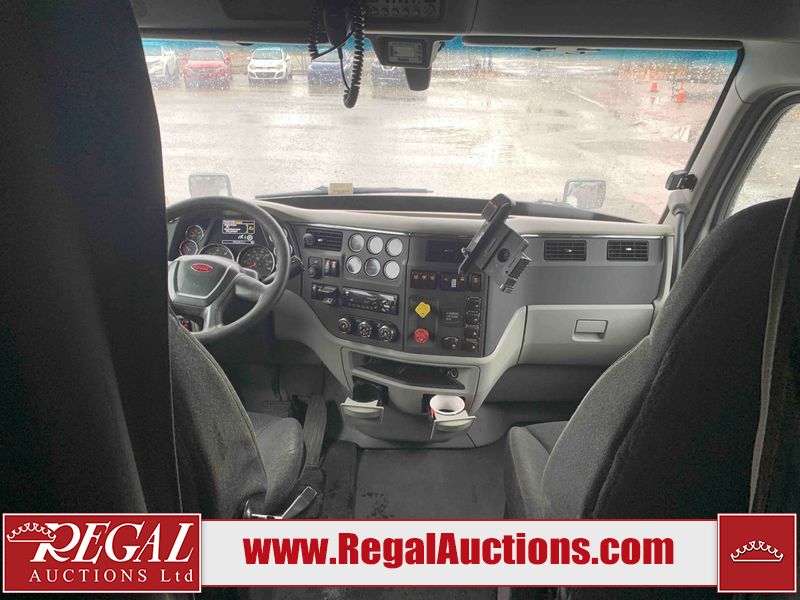 This unit is a 2019 Peterbuilt 579 single sleeper tandem axle Highway tractor. The odometer shows 870,524 km and 14,784 engine hours. It’s GVWR is 53,200 pounds. It’s CV is 04/2026. The interior is dirty. The driver and passenger seat are worn. Both the driver and passenger seat armrest are disconnected and missing. The steering wheel is worn. The bed is stained. The left cab light is missing. There are scratches and scuffs on most panels. It is equipped with a bed, refrigerator, rear climate control, stereo system, and a CB radio. The front end is showing scratches and scuffs. The front bumper has a piece missing. The engine cover has peeling paint. Both front doors, side and rear cab are showing scratches, scuffs, and dents. The rear part of the frame has a dent. This unit starts and runs without a boost. This unit is power by a Paccar MX13 12.9 L six cylinder turbo diesel engine and an automatic transmission. the tires are mounted to steel rims and appear to be in good enough condition for use. This unit is equipped with air brakes, air suspension, rear locking axles, and a PTO kit. It has a front axle of 13,200 pounds and a rear axle of 40,000 pounds.