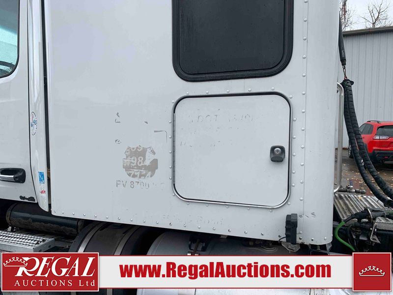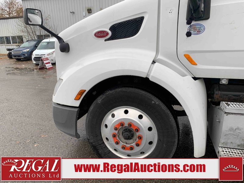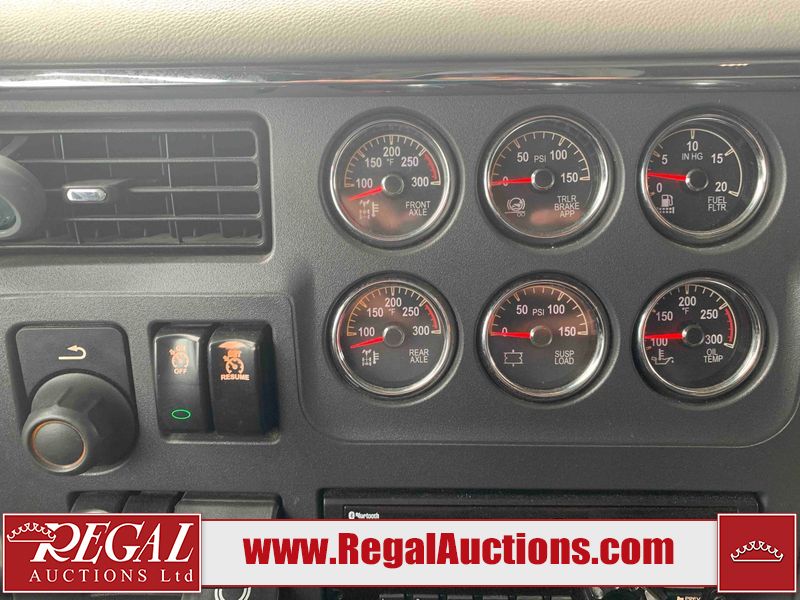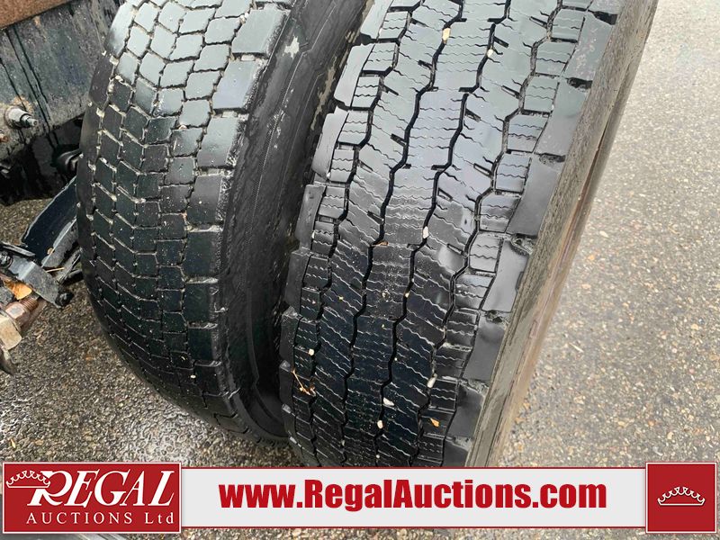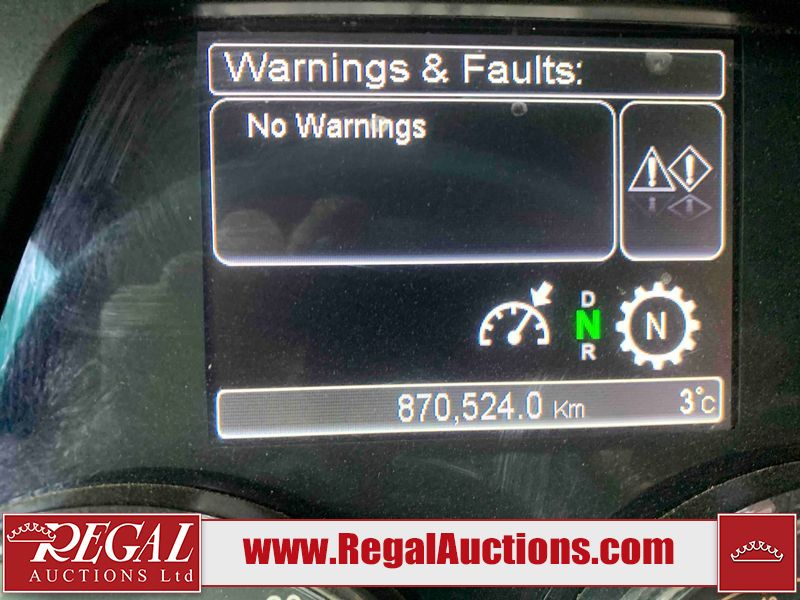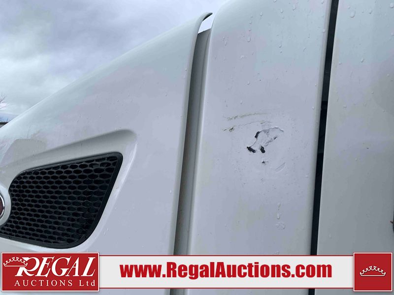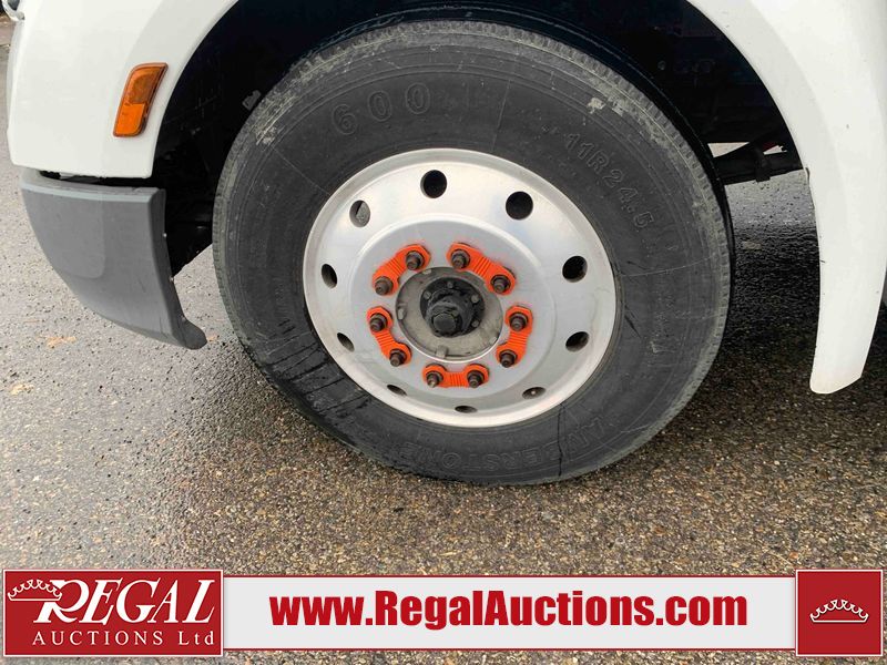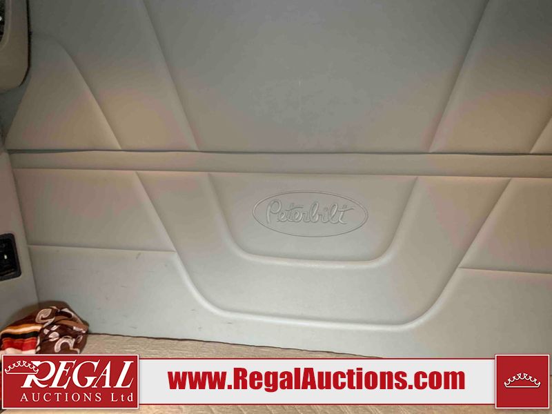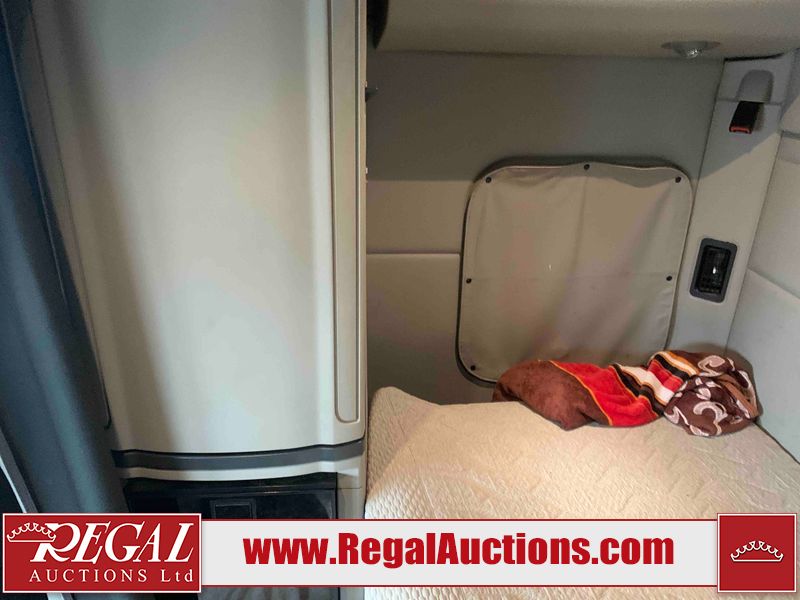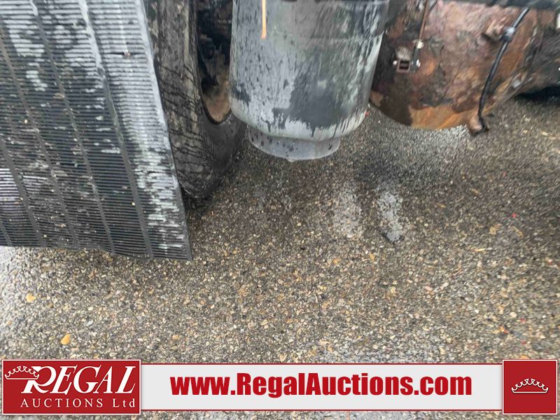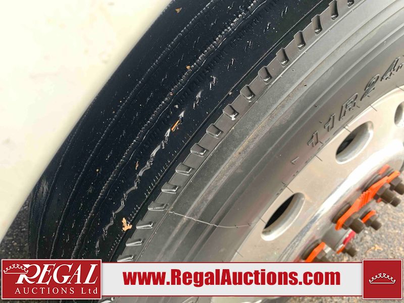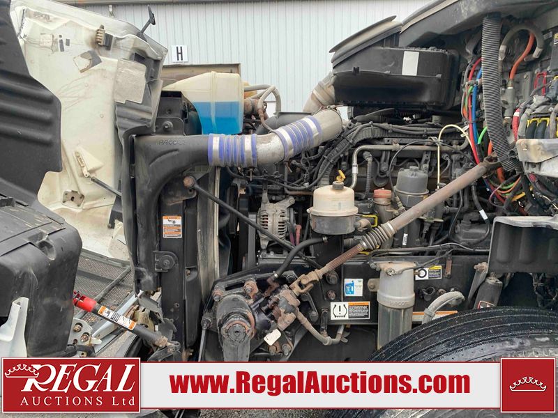 This unit is a 2019 Peterbuilt 579 single sleeper tandem axle Highway tractor. The odometer shows 870,524 km and 14,784 engine hours. It’s GVWR is 53,200 pounds. It’s CV is 04/2026. The interior is dirty. The driver and passenger seat are worn. Both the driver and passenger seat armrest are disconnected and missing. The steering wheel is worn. The bed is stained. The left cab light is missing. There are scratches and scuffs on most panels. It is equipped with a bed, refrigerator, rear climate control, stereo system, and a CB radio. The front end is showing scratches and scuffs. The front bumper has a piece missing. The engine cover has peeling paint. Both front doors, side and rear cab are showing scratches, scuffs, and dents. The rear part of the frame has a dent. This unit starts and runs without a boost. This unit is power by a Paccar MX13 12.9 L six cylinder turbo diesel engine and an automatic transmission. the tires are mounted to steel rims and appear to be in good enough condition for use. This unit is equipped with air brakes, air suspension, rear locking axles, and a PTO kit. It has a front axle of 13,200 pounds and a rear axle of 40,000 pounds.