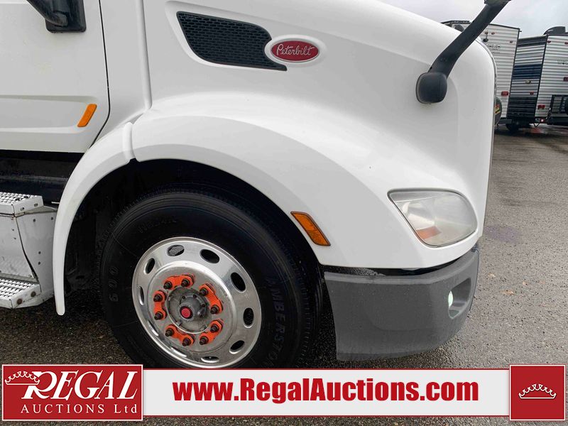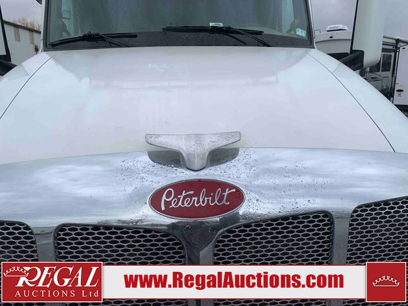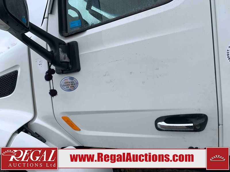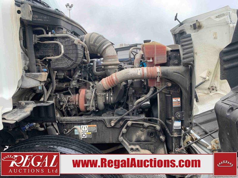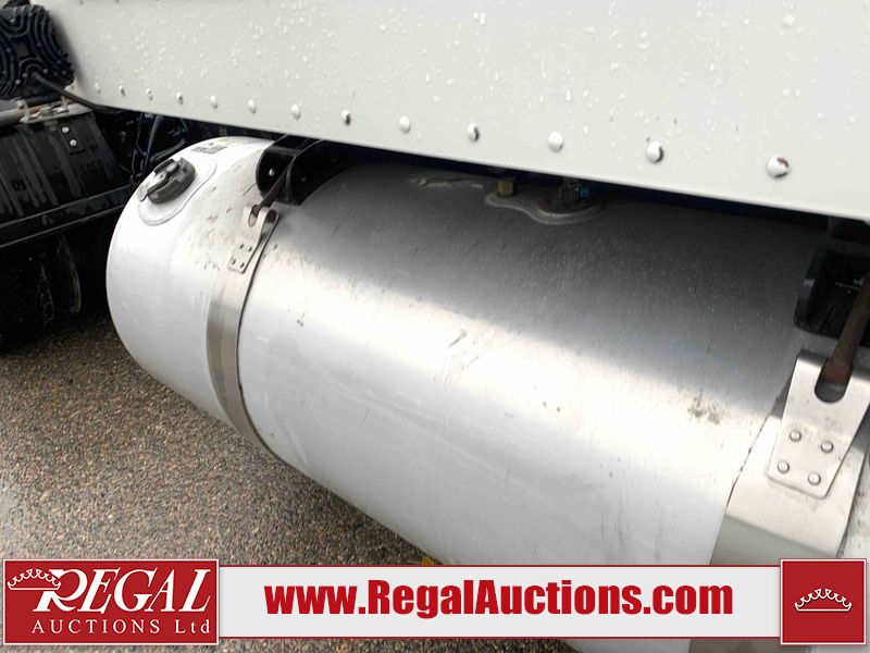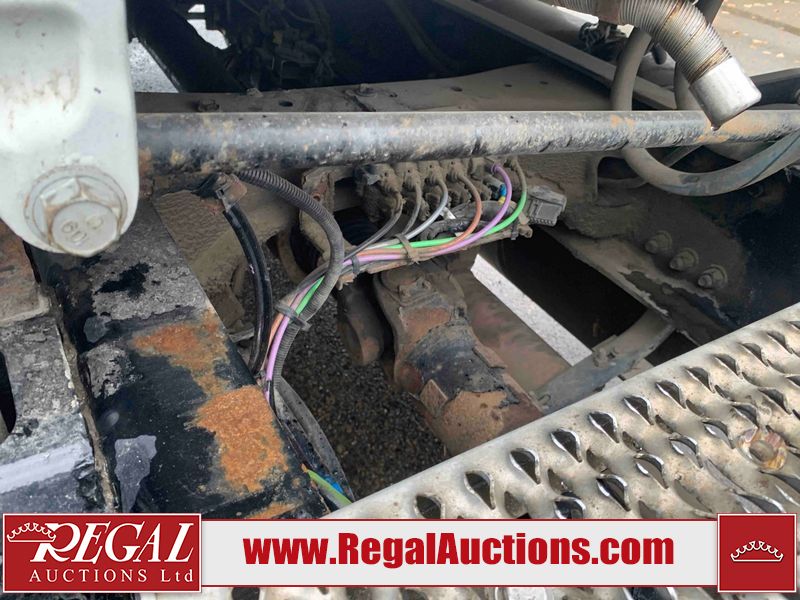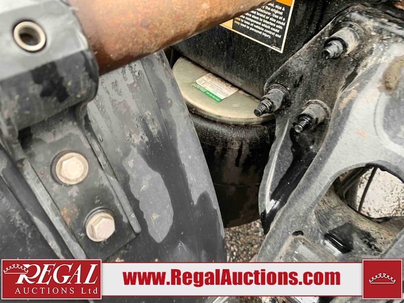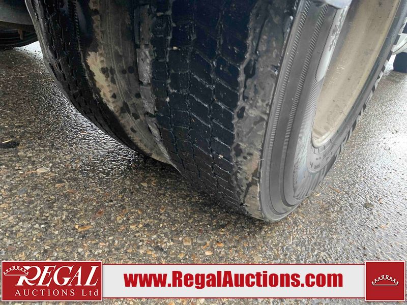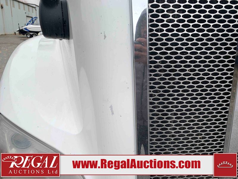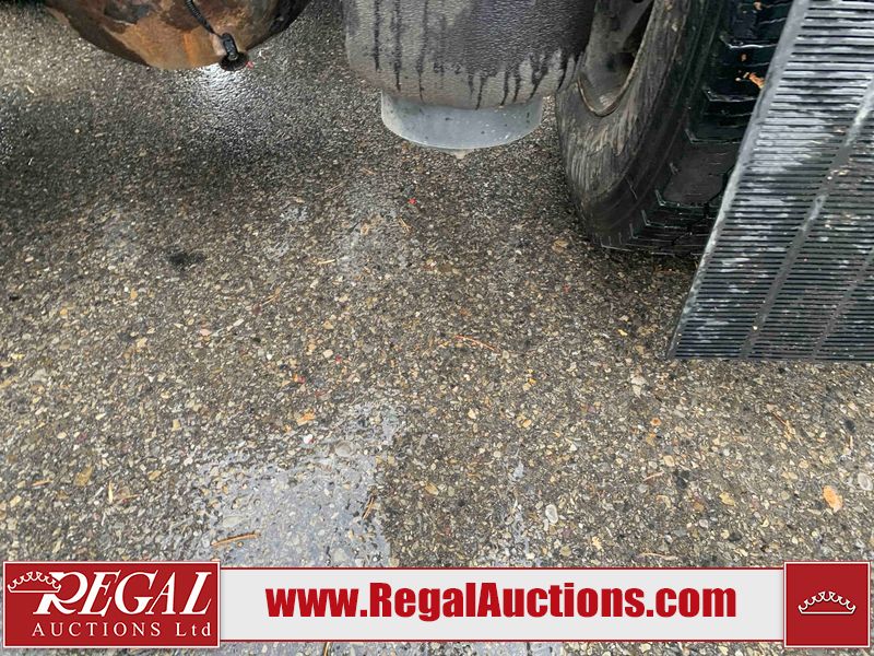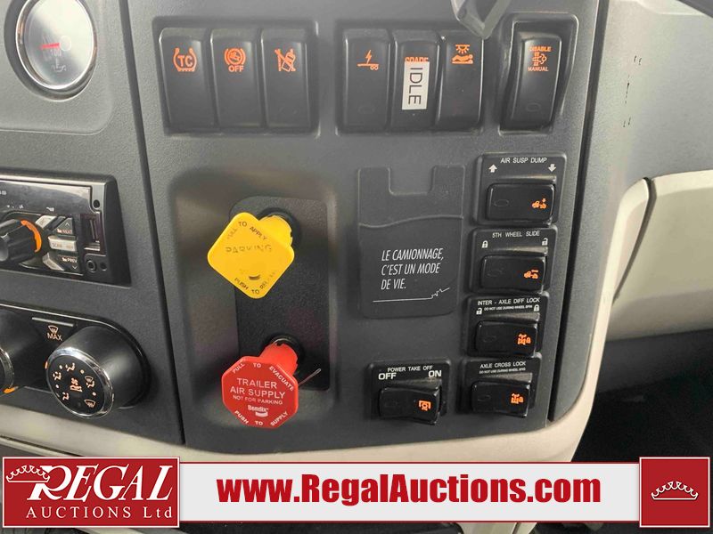 This unit is a 2019 Peterbuilt 579 single sleeper tandem axle Highway tractor. The odometer shows 870,524 km and 14,784 engine hours. It’s GVWR is 53,200 pounds. It’s CV is 04/2026. The interior is dirty. The driver and passenger seat are worn. Both the driver and passenger seat armrest are disconnected and missing. The steering wheel is worn. The bed is stained. The left cab light is missing. There are scratches and scuffs on most panels. It is equipped with a bed, refrigerator, rear climate control, stereo system, and a CB radio. The front end is showing scratches and scuffs. The front bumper has a piece missing. The engine cover has peeling paint. Both front doors, side and rear cab are showing scratches, scuffs, and dents. The rear part of the frame has a dent. This unit starts and runs without a boost. This unit is power by a Paccar MX13 12.9 L six cylinder turbo diesel engine and an automatic transmission. the tires are mounted to steel rims and appear to be in good enough condition for use. This unit is equipped with air brakes, air suspension, rear locking axles, and a PTO kit. It has a front axle of 13,200 pounds and a rear axle of 40,000 pounds.