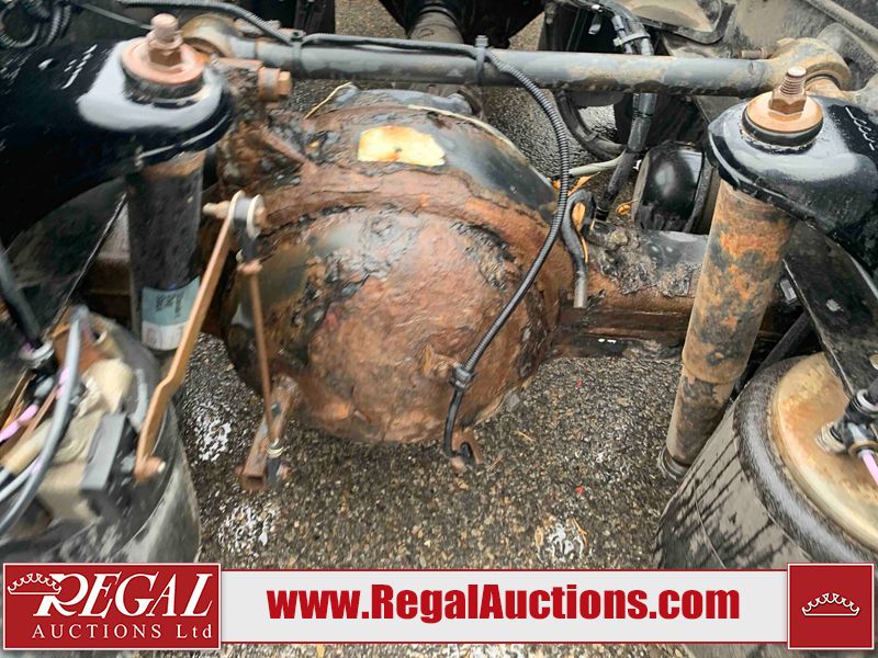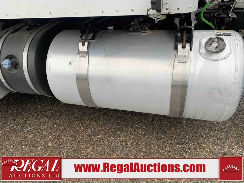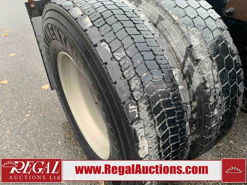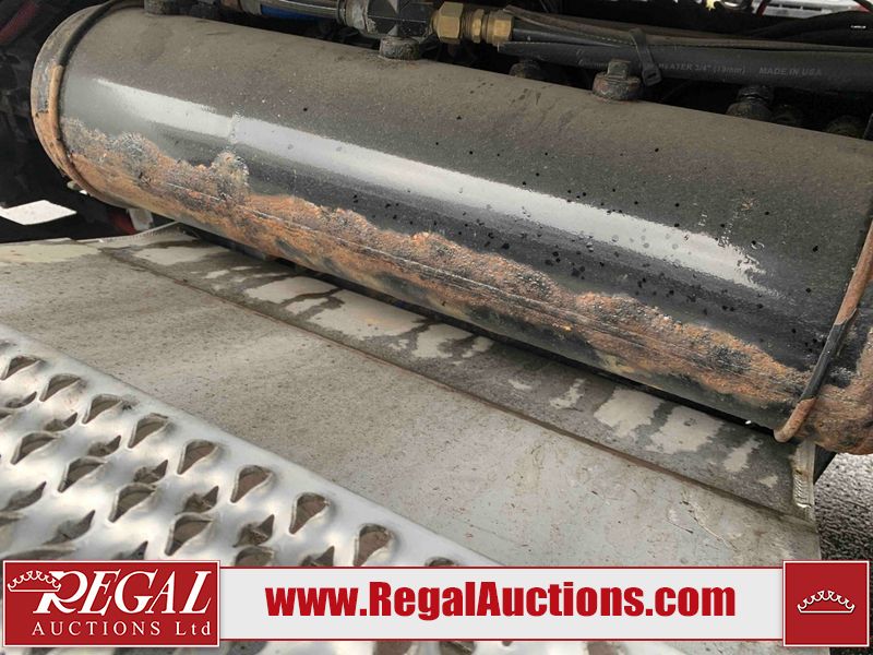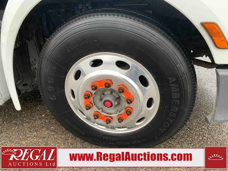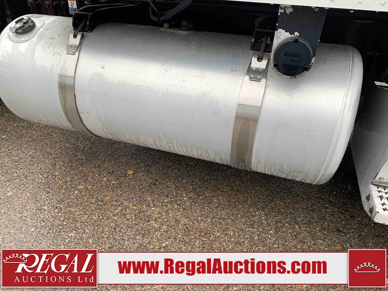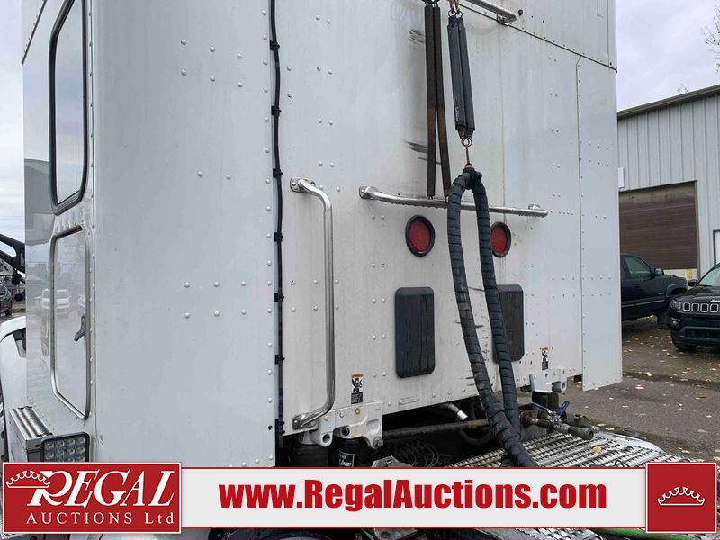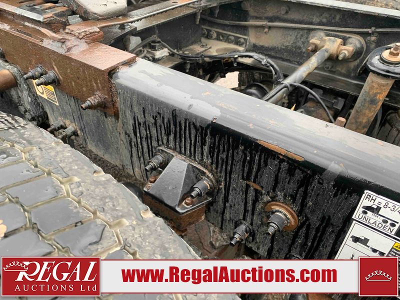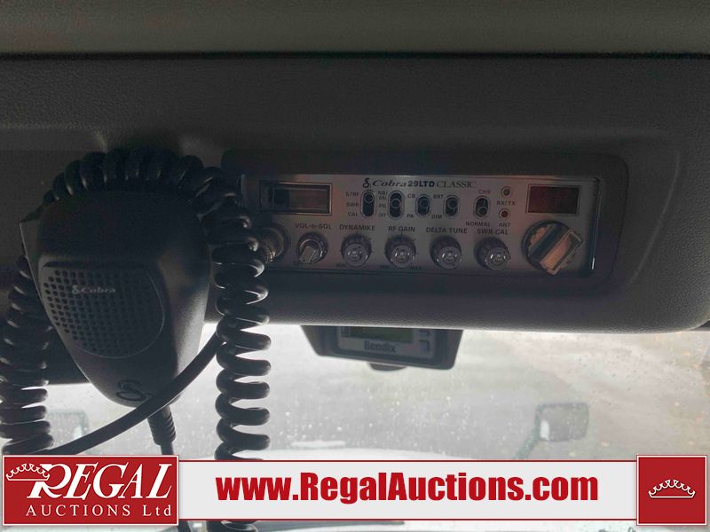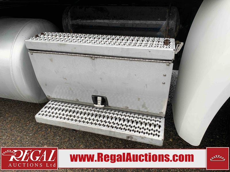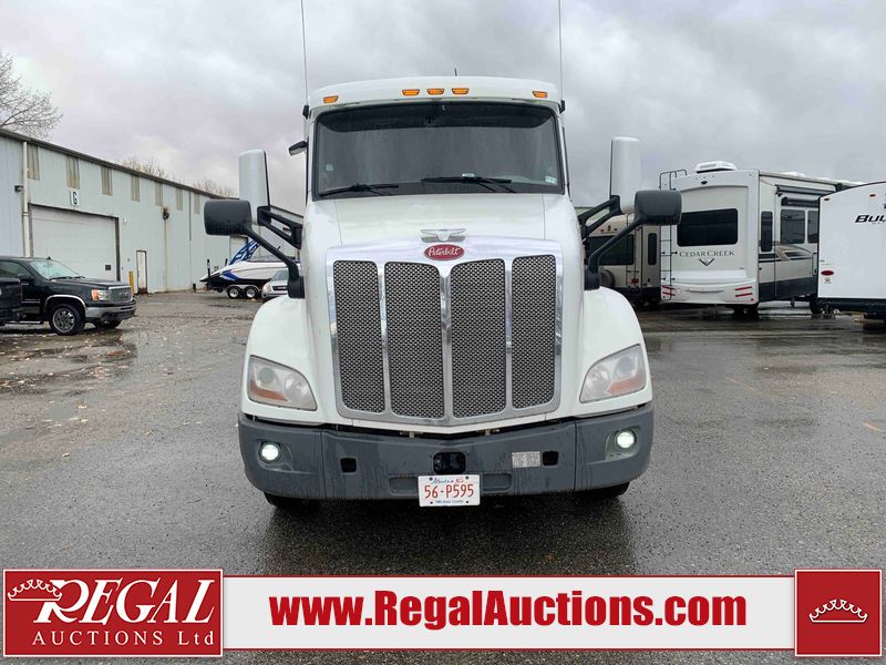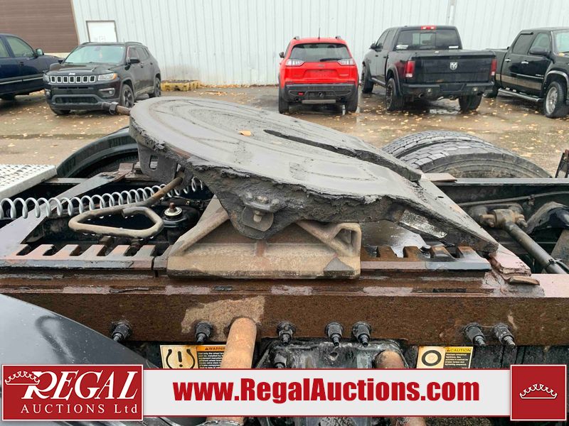 This unit is a 2019 Peterbuilt 579 single sleeper tandem axle Highway tractor. The odometer shows 870,524 km and 14,784 engine hours. It’s GVWR is 53,200 pounds. It’s CV is 04/2026. The interior is dirty. The driver and passenger seat are worn. Both the driver and passenger seat armrest are disconnected and missing. The steering wheel is worn. The bed is stained. The left cab light is missing. There are scratches and scuffs on most panels. It is equipped with a bed, refrigerator, rear climate control, stereo system, and a CB radio. The front end is showing scratches and scuffs. The front bumper has a piece missing. The engine cover has peeling paint. Both front doors, side and rear cab are showing scratches, scuffs, and dents. The rear part of the frame has a dent. This unit starts and runs without a boost. This unit is power by a Paccar MX13 12.9 L six cylinder turbo diesel engine and an automatic transmission. the tires are mounted to steel rims and appear to be in good enough condition for use. This unit is equipped with air brakes, air suspension, rear locking axles, and a PTO kit. It has a front axle of 13,200 pounds and a rear axle of 40,000 pounds.