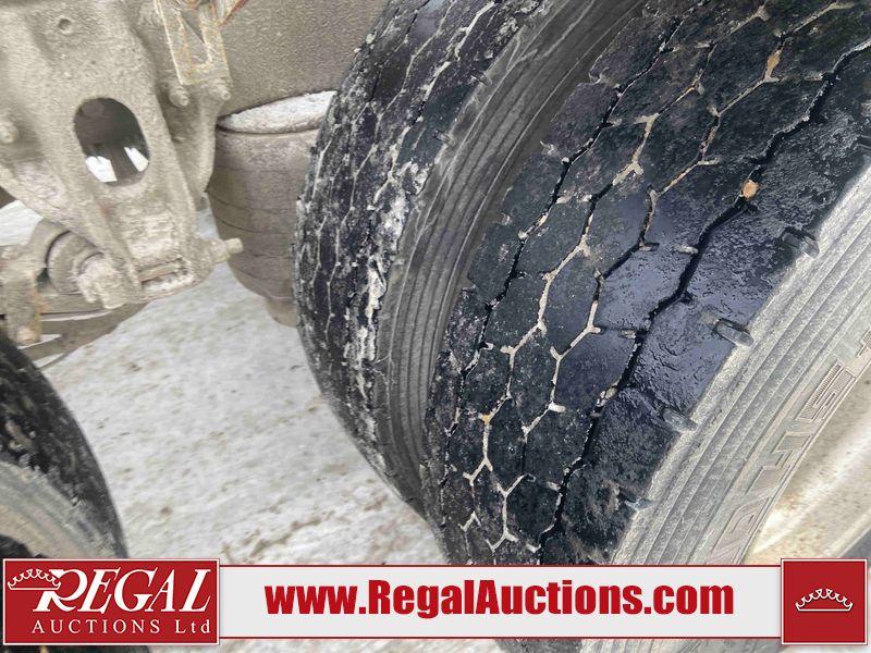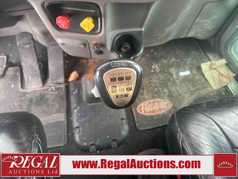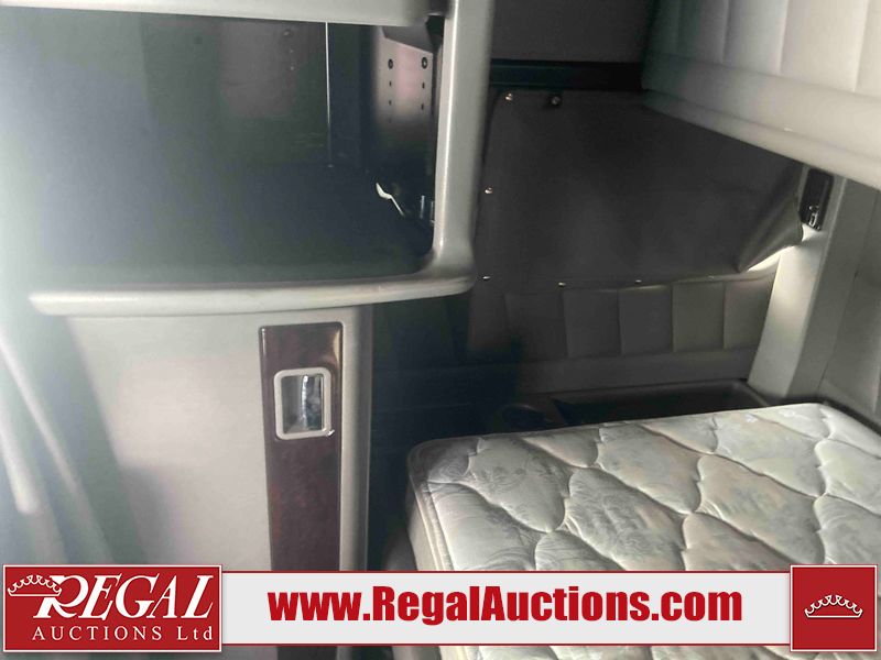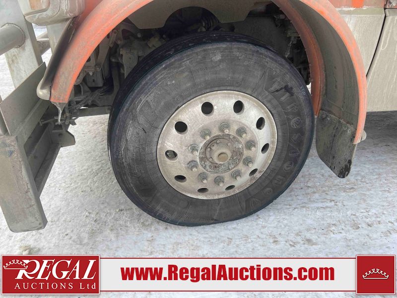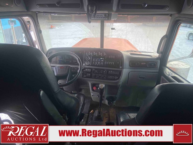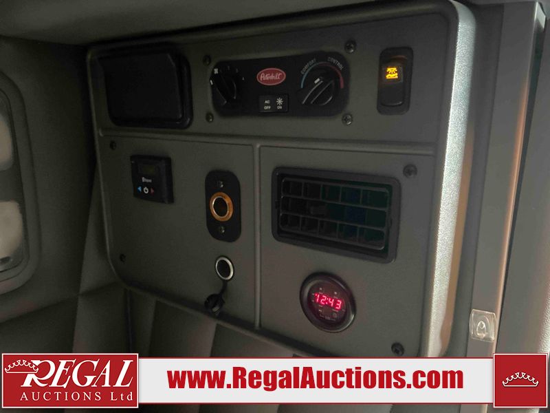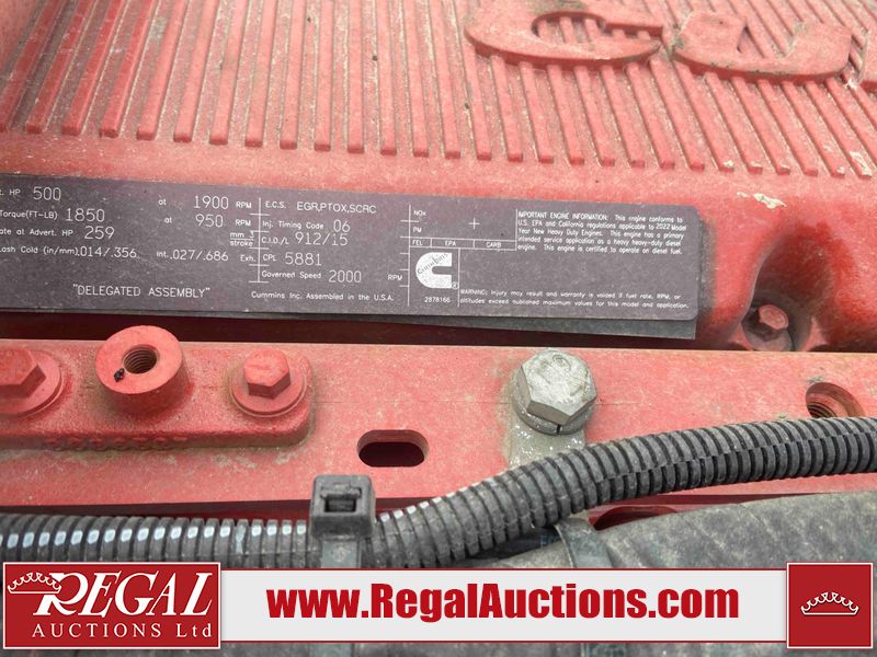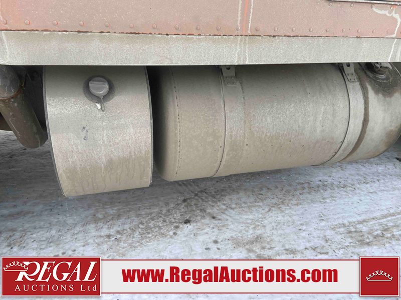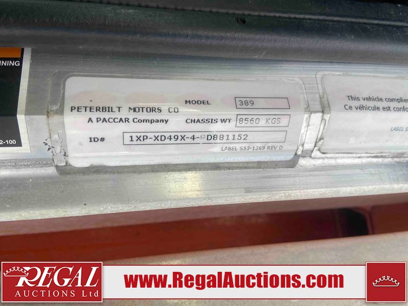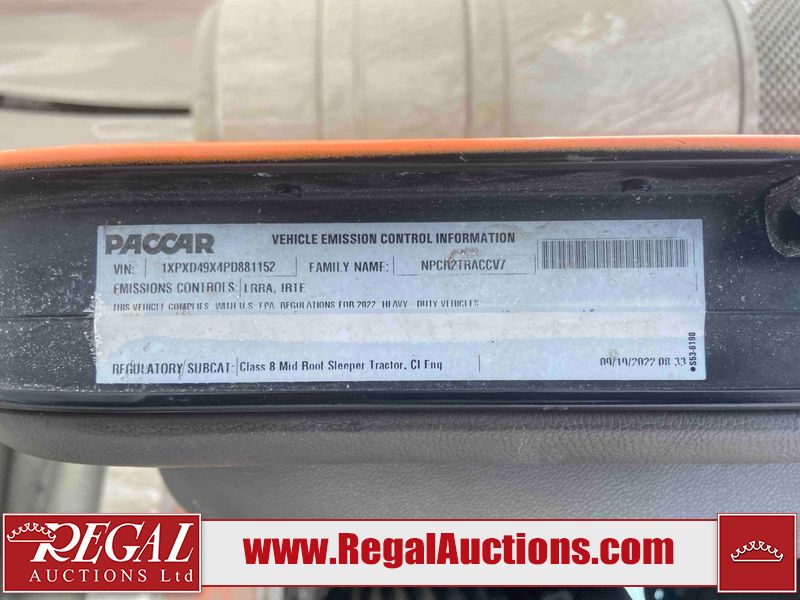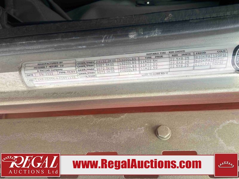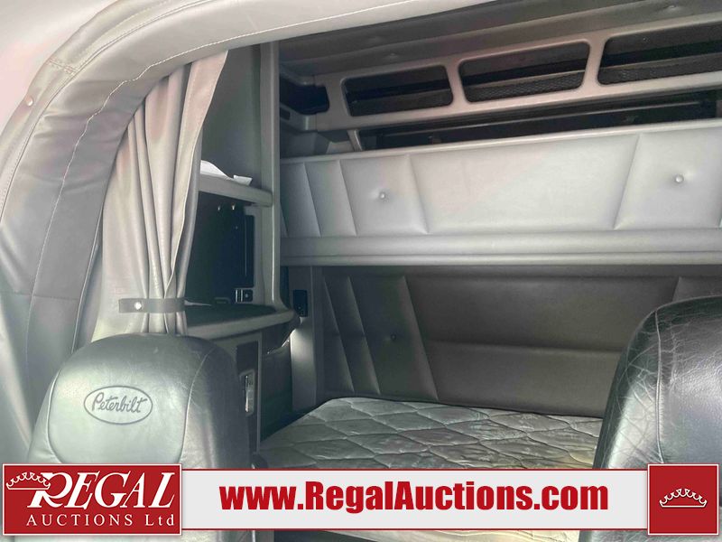 This unit is a 2023 Peterbilt 389 mid roof dual sleeper highway tractor. The odometer reads 528,674 km and 8256 engine hours. It’s GWR is 53,200 pounds. It has a CVP of 05/2026. The interior is dirty. The driver seat is torn. The bed is stained and worn. Some plastics are scuffed. This unit is equipped with rear climate control, refrigerator, and ACB radio. This unit is dirty, not all damages can be determined. The front crash bar is chipped. All panels are showing scratches and scuffs. The cab guard is cracked and dented. The left rear fender is cracked. This unit starts and runs without a boost. This unit is powered by a Cummins X15 14.9L 6 cylinder turbo diesel engine with a 18 speed Eaton transmission. The tires are mounted to alloy rims and appear to be in good enough condition for use. This unit is equipped with Air suspension, air, brakes, and rear sliding axles. It has a 13,200 pound front axle and a 40,000 pound rear axles.