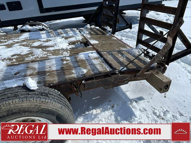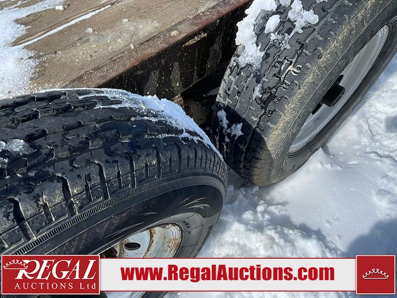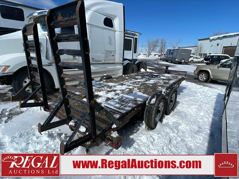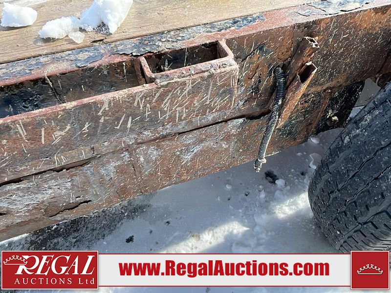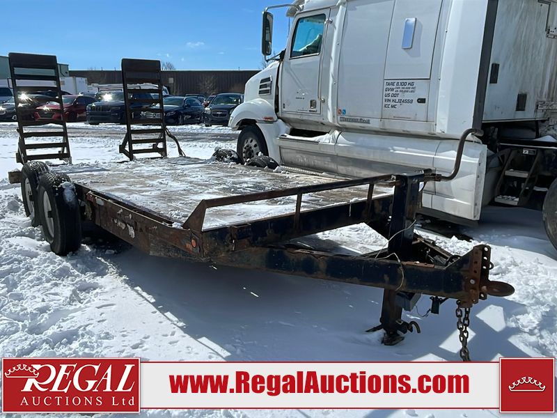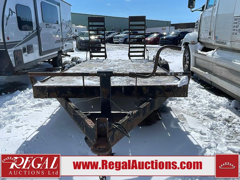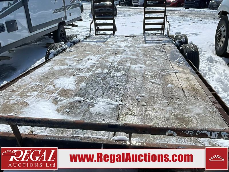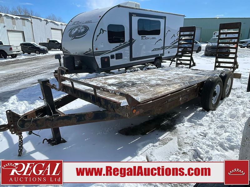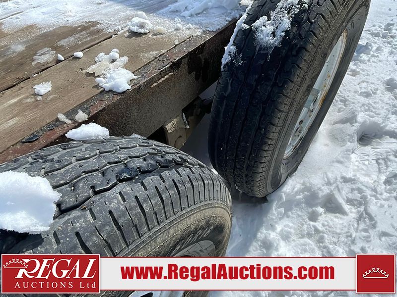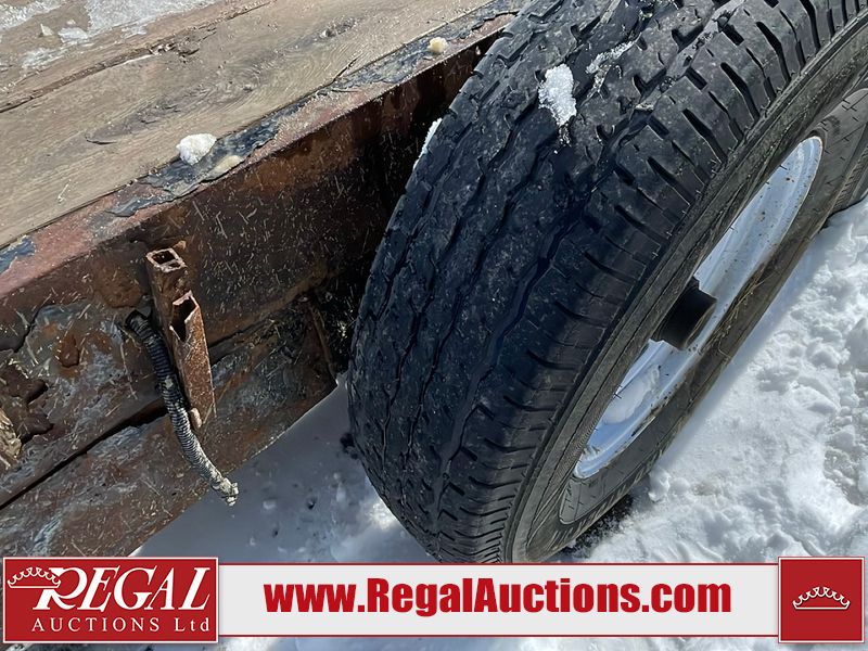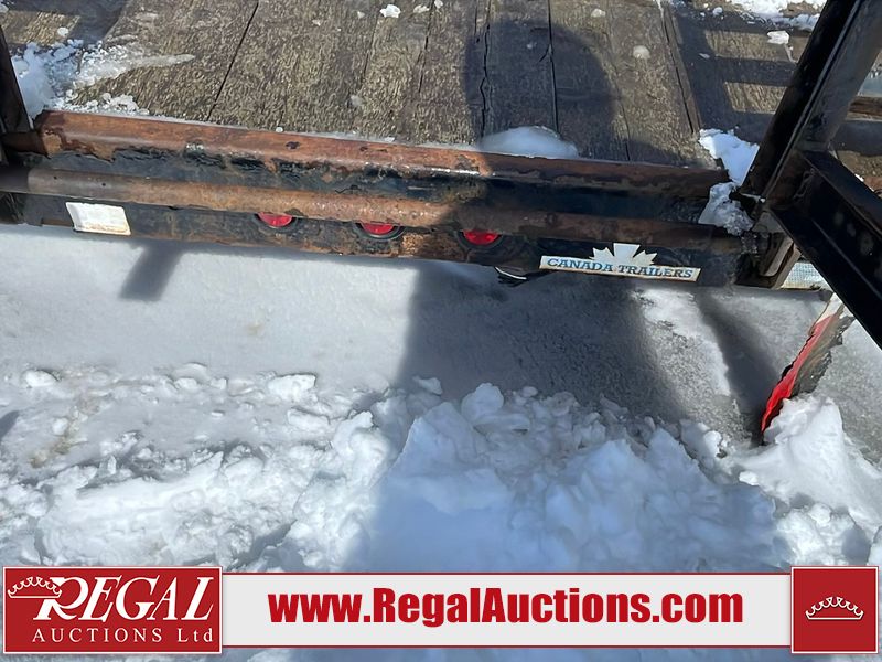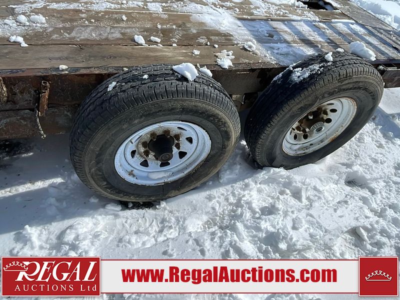 This unit is a 16FT Canada trailers homemade model Tandem axle flatbed utility trailer. Its GVWR is 11,308 pounds. The V.I.N cannot be made displayed, one will need to be assigned. The deck is made of wooden boards. All panels have peeling paint. Both the left and right side have loose wiring. The left rear brake light bracket is gouged, both rear brake lights are missing. This unit is equipped with leaf spring suspension. The tires are mounted to alloy rims and be good enough condition for use. This unit is equipped with fold down ramps.