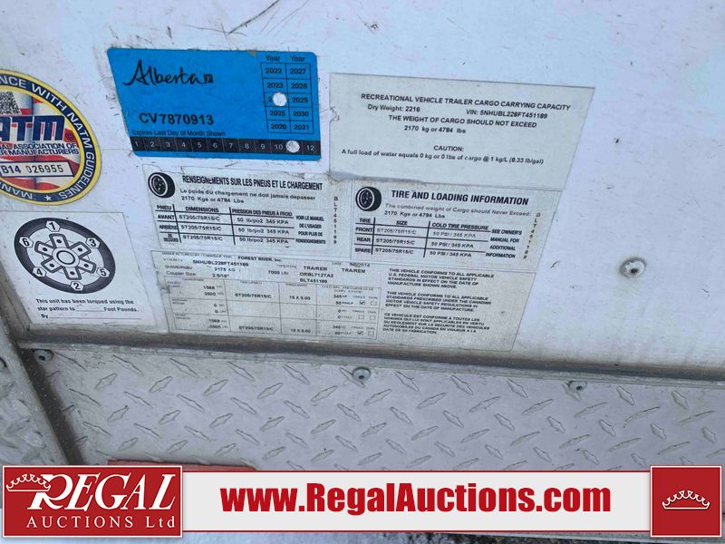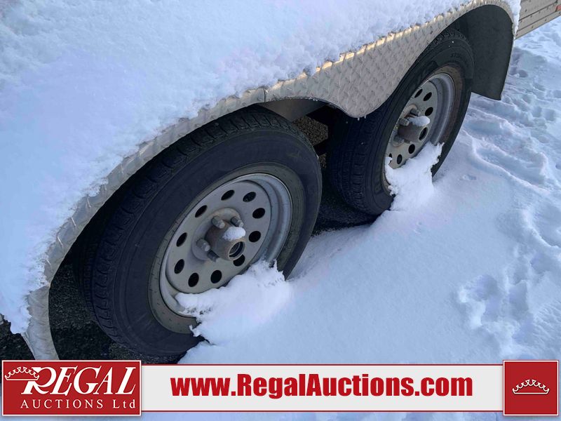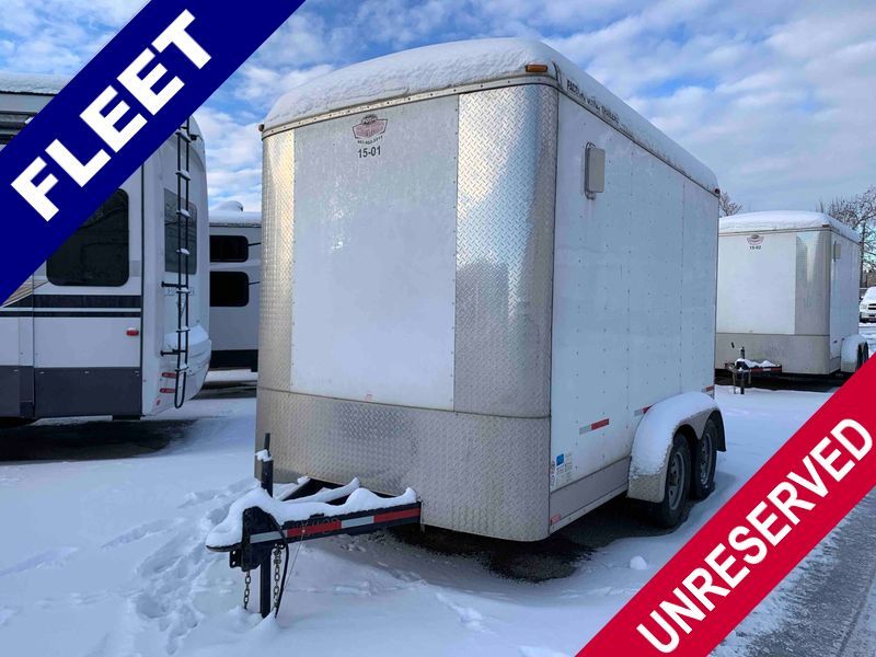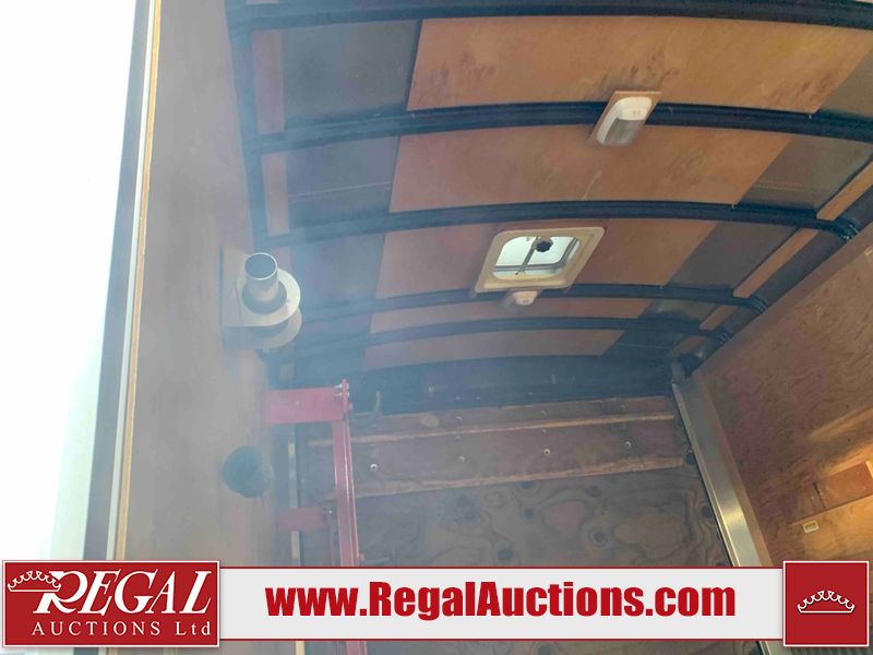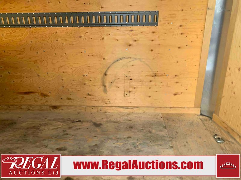 This unit is a 2019 Cargo Mate Blazer model tandem axle enclosed cargo trailer. The interior flooring and sidewalls are made of plywood. The ramp has scratches. The floor has scratches. The front checker plate is bent. The fenders are bent. There are chips across the front end. Both sidewalls have scratches and dents. Steel rims are mounted, the tires have plenty of tread remaining. This unit is equipped with a rear ramp style door. The interior walls have mounting racks and E tracks. This unit is equipped with a pintle hitch.