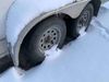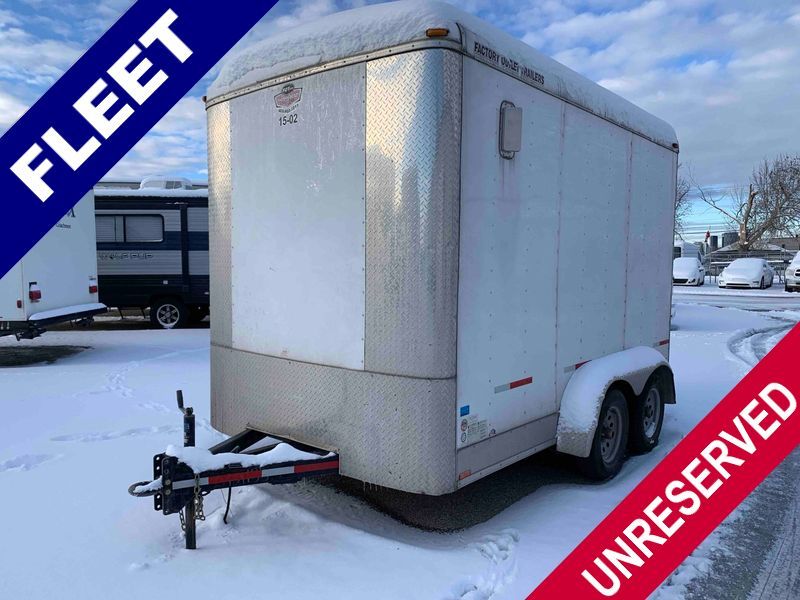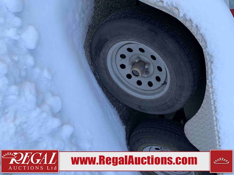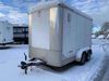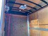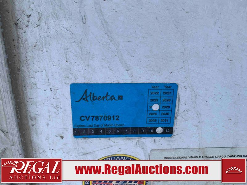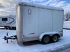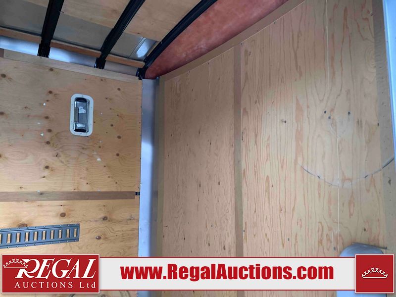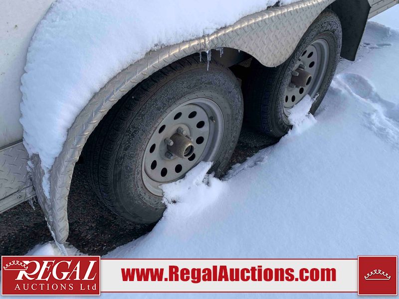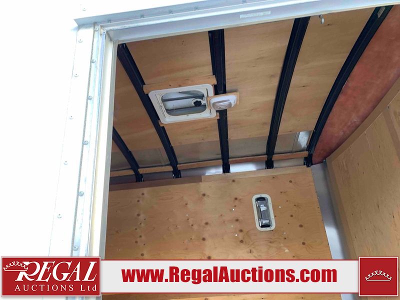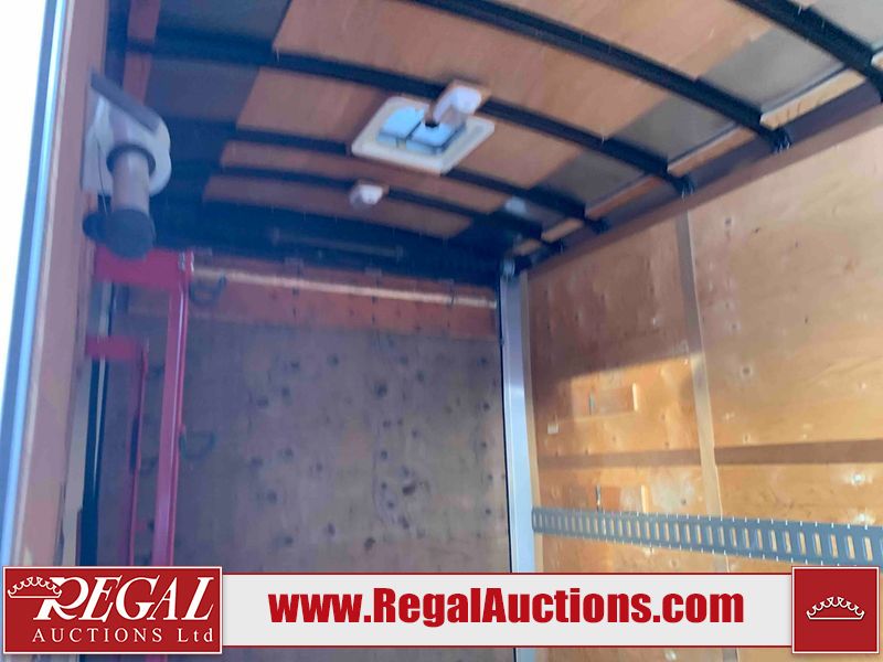 This unit is a 2019 Cargo Mate Blazer model tandem axle enclosed cargo trailer. The interior flooring and sidewalls are made of plywood. The ramp has scratches. The floor has scratches. The front checker plate has dents. The fenders are bent and have crackes. There are chips across the front end. Both sidewalls have scratches and dents. Steel rims are mounted, the tires have plenty of tread remaining. This unit is equipped with a rear ramp style door. The interior walls have mounting racks and E tracks. This unit is equipped with a pintle hitch.
