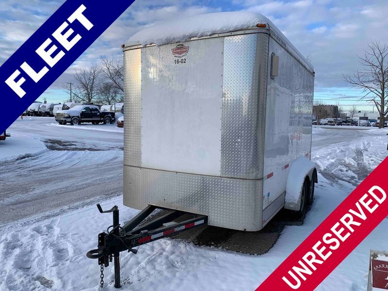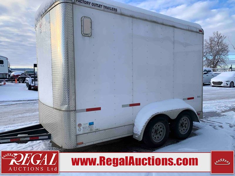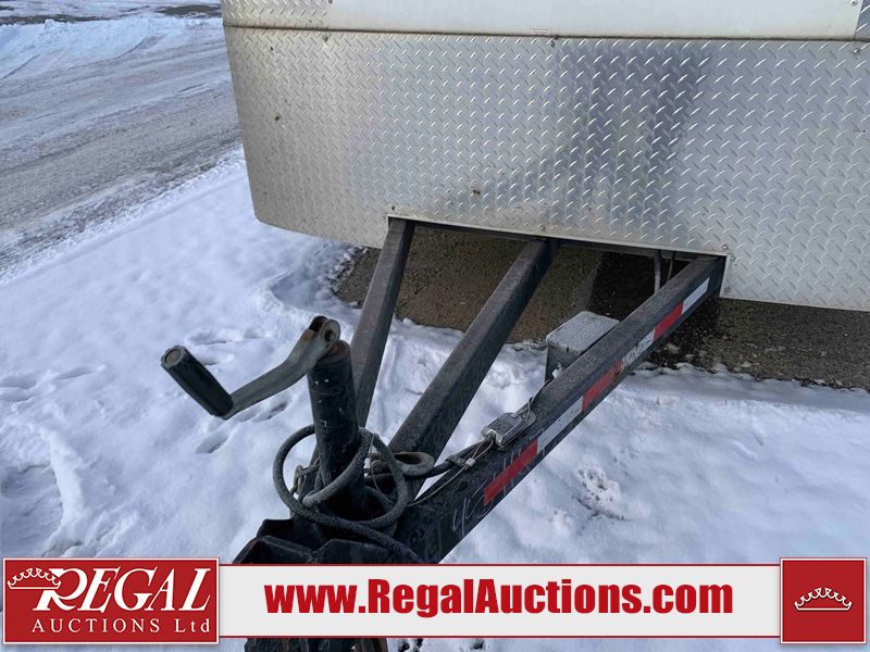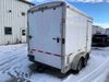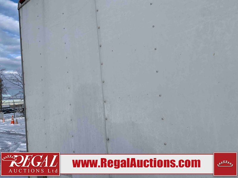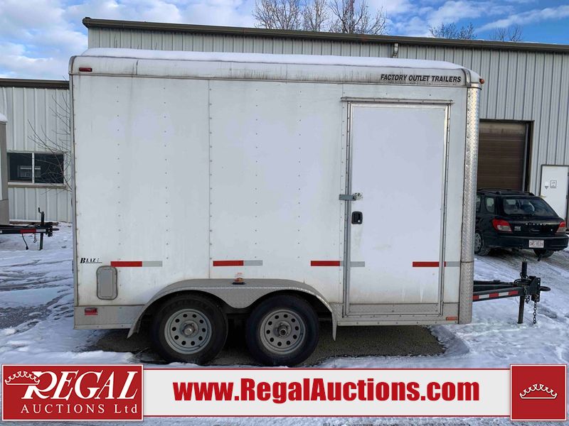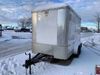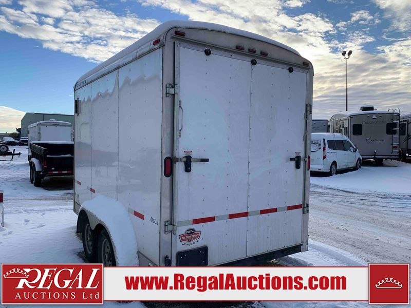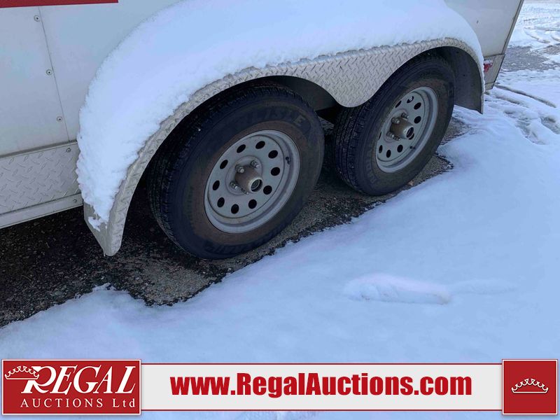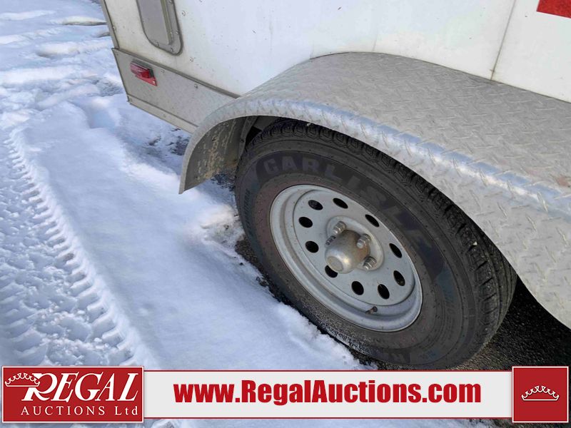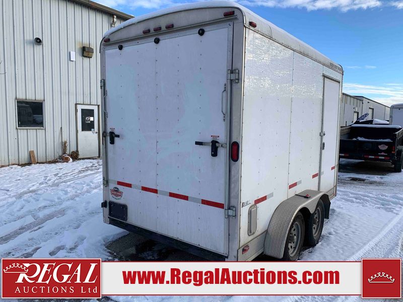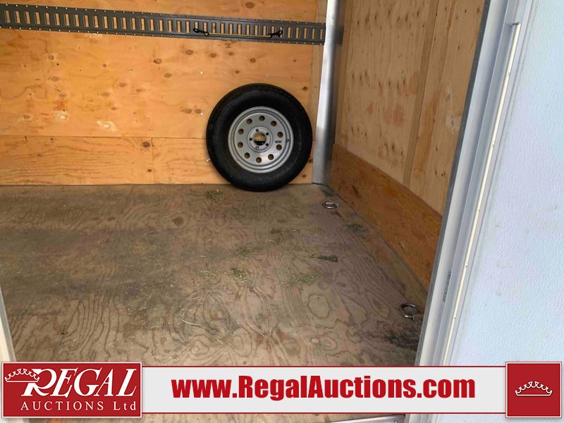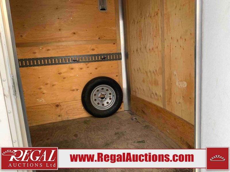 This unit is a 12' 2019 Cargomate Blazer model tandem axle enclosed cargo trailer. The interior flooring and sidewalls are made of plywood. The ramp has scratches. The floor has scratches. The front checker plate has dents. The fenders have cracks. There are chips across the front end. Both sidewalls have scratches and dents. Steel rims are mounted, the tires have plenty of tread remaining. This unit is equipped with a rear ramp style door. The interior walls have mounting racks and E tracks. This unit is equipped with a pintle hitch and comes with a spare tire.
