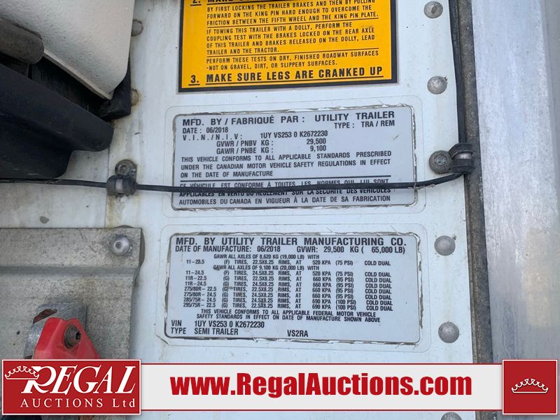 This unit is a 2019 Utility VS2RA 53ft tandem axle reefer trailer with a Carrier 7300X4 model refrigeration unit. The engine hours show 11931 hours and 22488 switch on hours. The CVIP expiry is 10/2025. This unit has a GVWR of 65,000LBS. The interior of this unit is equipped with ducted floors and an air chute. The ducted floors are broken. The rear door hinges and latch hooks are broken, the door mounts are bent so that the rear doors are unable to open. The reefer cover handles are rusted. This unit is equipped with a steel/aluminum composite frame. This unit has frame damage to the right rear corner. The metal is sheared and the rear crash bar is severely bent. The right side wall is warped and bent outwards. The unit starts and runs without a boost. The reefer unit appears operational. The tires appear to be in acceptable condition for use. This unit is equipped with alloy rims, sliding axles, air brakes, and ABS.