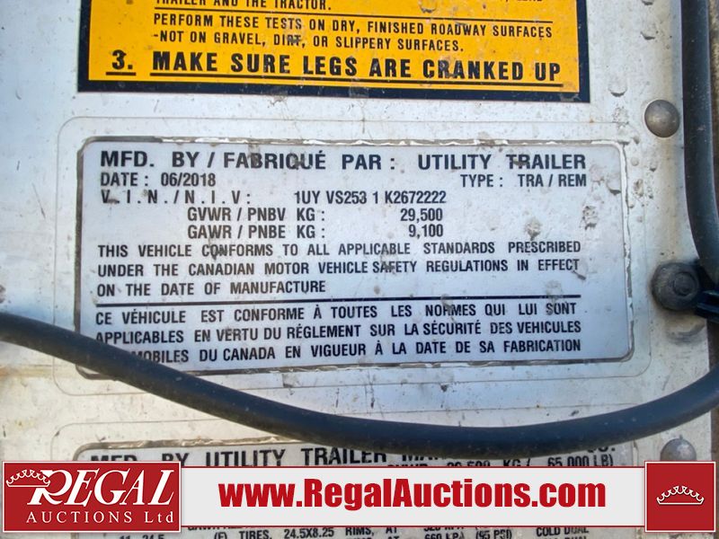 This unit is a 2019 Utility 53ft VS2RA tandem axle reefer trailer with a Carrier 7300X4 model refrigeration unit. The engine hours show 11057 hours and 20905 switch on hours. The CVIP expiry is 04/2026. This unit has a GVWR of 65,000LBS. The interior of this unit is equipped with ducted floors and an air chute. All walls are showing scratches and scuffs. This unit is equipped with a steel/aluminum composite frame. All walls are showing chips, scratches, and scuffs. The rear bumper is dented. The front right wall is dented and has been poorly resealed. The unit starts and runs without a boost. The reefer unit is operational. The tires appear to be in acceptable condition for use. This unit is equipped with alloy rims, air brakes, and ABS.