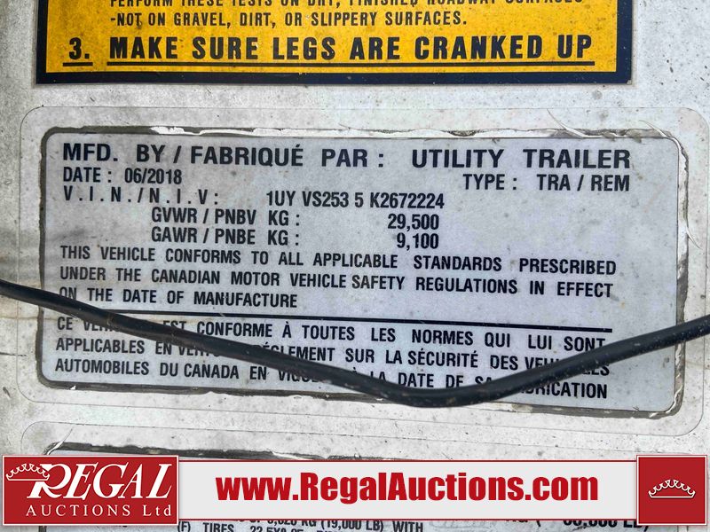 This unit is a 2019 utility VS 3RA model tandem axle reefer trailer. Batch an hour show 13,885 hours and 27,404 switch on hours. It is equipped with a 7300 X refrigerator unit. Its GVWR is 65,000 pounds. It has a CVP of 11/2026. The interior walls are showing scratches and scuffs. This unit is equipped with a steel/aluminum combination frame. All walls are showing scratches, scuffs, and dents. This unit starts and run without a boost. The tires are mounted to alloy rims and appear to bein good enough condition for use. This unit is equipped with air suspension, ABS, and an air duct.