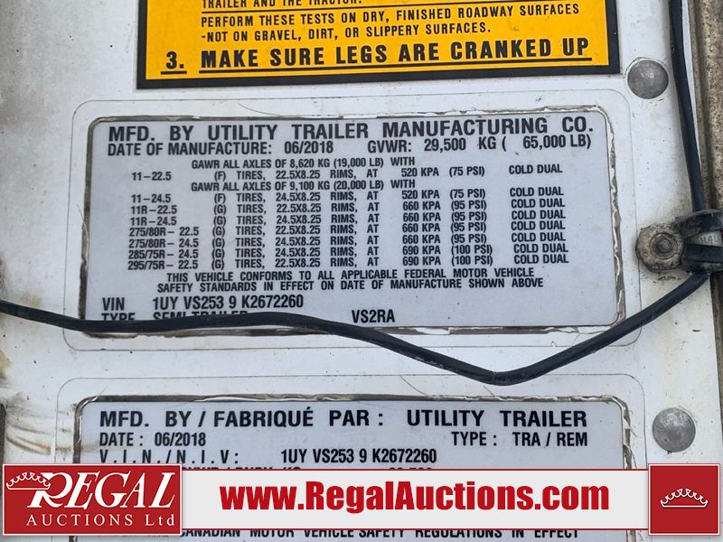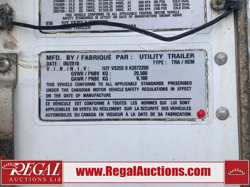 This unit is a 53 foot 2019 utility VS3RA model tandem axle reefer trailer. The our metre reads 11,852 engine hours and 22,646 switch on hours. This unit is equipped with a carrier 7300 X4 model refrigeration unit. This unit has a GVWR of 65,000 pounds. it has a OMOT of 12/25. The interior is equipped with an air shoot and ducted floors. The interior walls have scratches and scuffs. This unit is equipped with a steel/aluminum combination frame. Both sidewalls have scratches, scuffs, and dents. The left front corner has gouges and poorly repaired cuts in the metal. The reefer cover has peeling paint. The reefer starts and runs without a boost. The tires appear to be in good enough condition for use. The unit is equipped with an underneath air foil, aluminum rims air suspension and ABS.