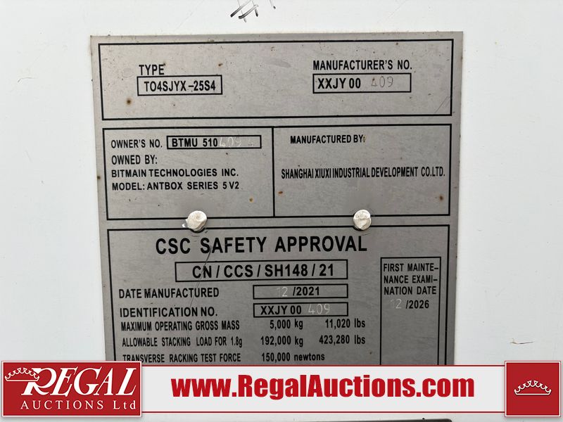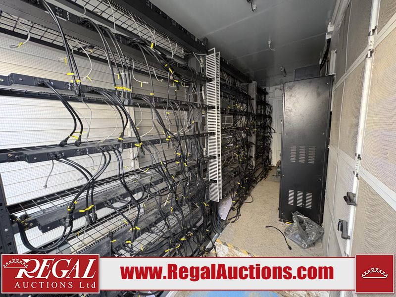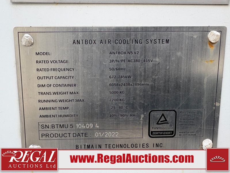 This asset is a BITMAIN ANTBOX N5 V2 model mobile mining container. The unit is 20ft long and 9.5ft tall. It is equipped with server racking and electrical for crypto mining operations. Interior of the unit looks to be in fair condition. The unit is equipped with breakers, server racks with supporting networking equipment, power cables and security system. The completeness and operation of the contents is unknown. Exterior is in fair overall condition. There are some minor scrapes and dents from moving the containers. Unit was believed to be operational prior to transport to auction. There is no guarantee regarding the function of any equipment.