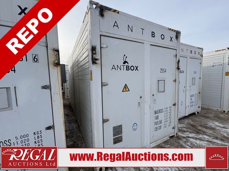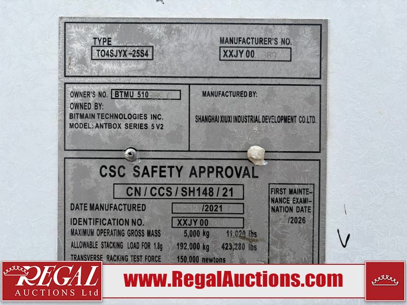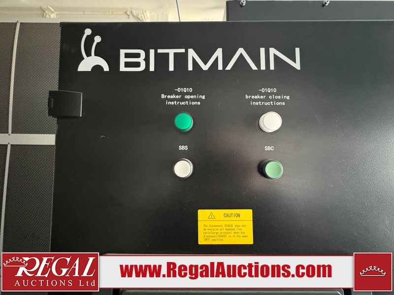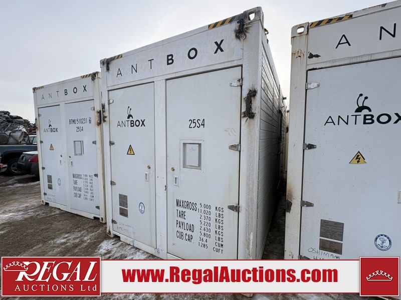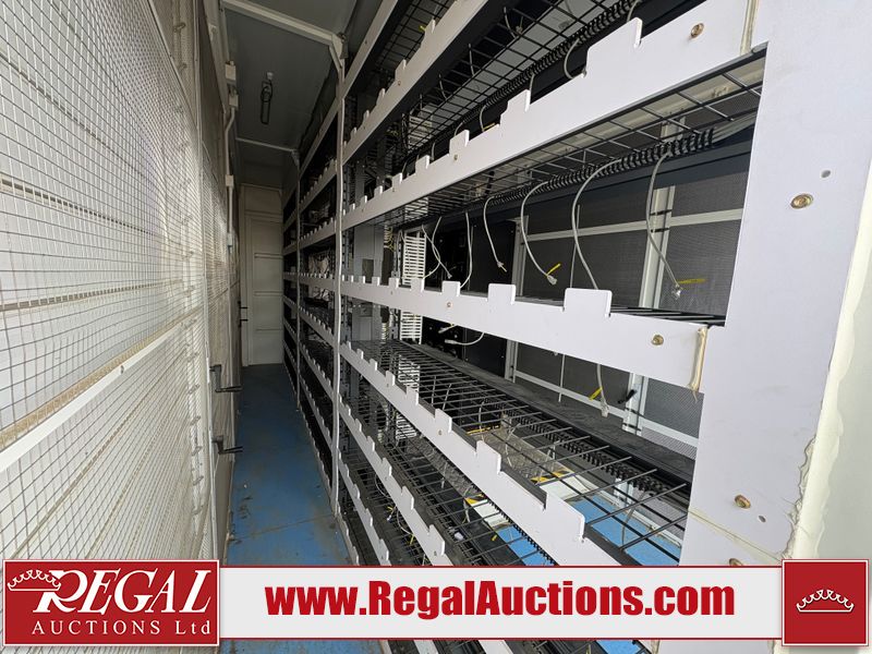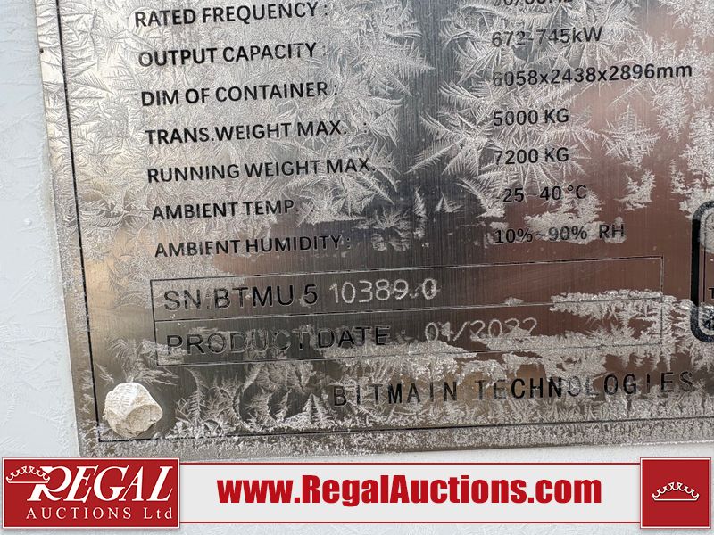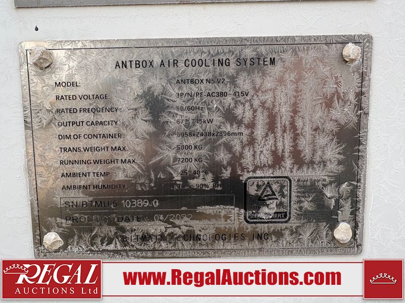 This asset is a BITMAIN ANTBOX N5 V2 model mobile mining container. The unit is 20ft long and 9.5ft tall. It is equipped with server racking and electrical for crypto mining operations. Interior of the unit looks to be in fair condition. The unit is equipped with breakers, server racks with supporting networking equipment, power cables and security system. The completeness and operation of the contents is unknown. Exterior is in fair overall condition. There are some minor scrapes and dents from moving the containers. Unit was believed to be operational prior to transport to auction. There is no guarantee regarding the function of any equipment.