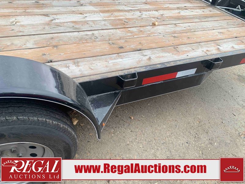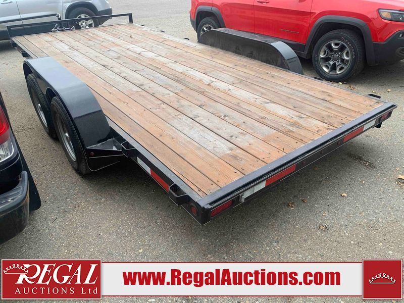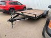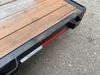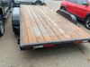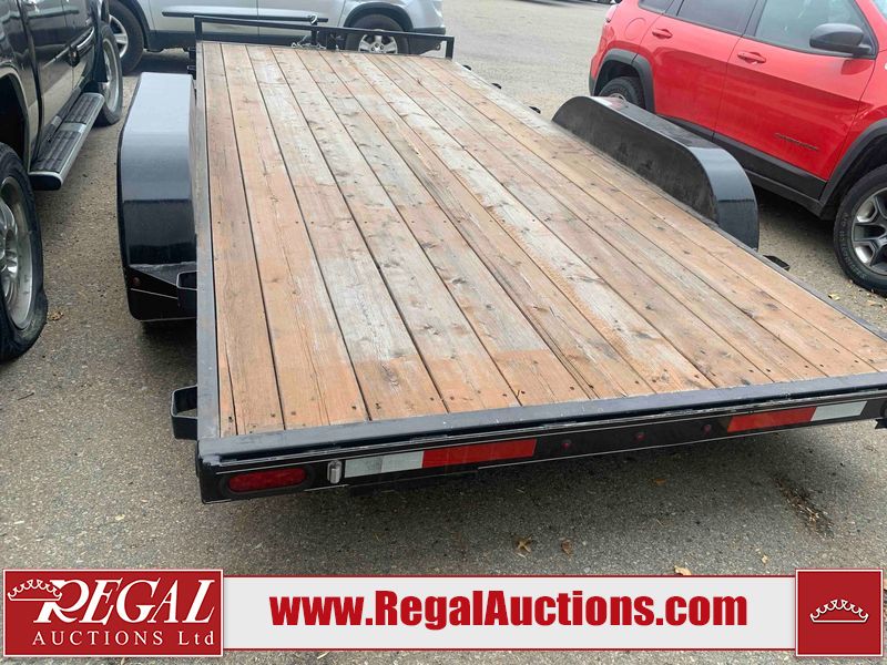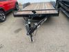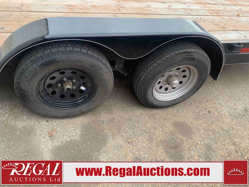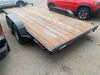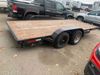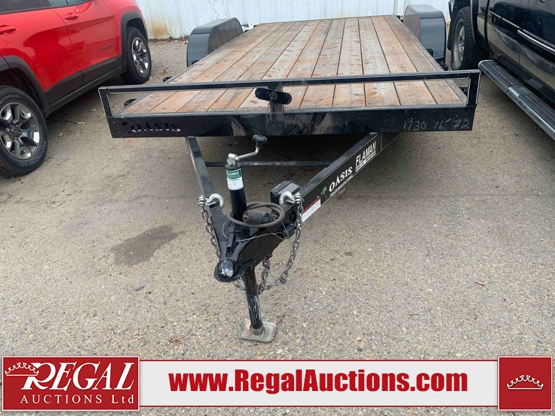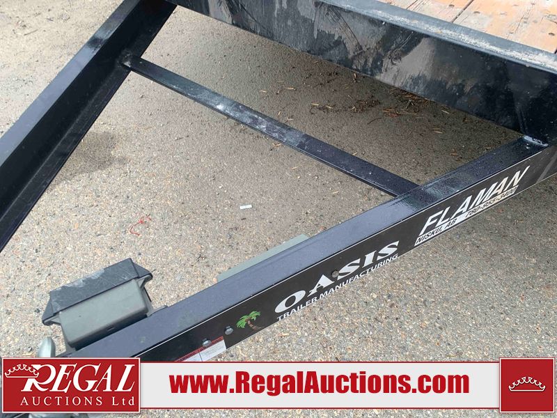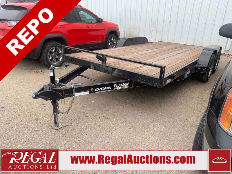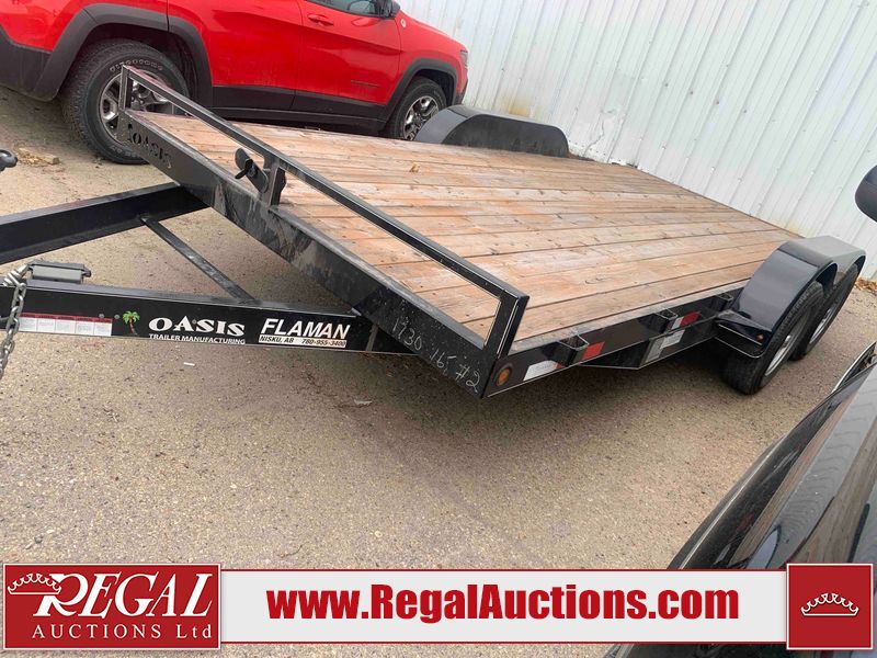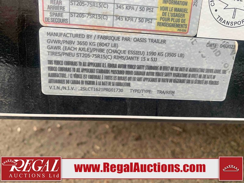 This unit is a 2023 oasis 16 foot lowboy tandem axle car hauler. The GVWR is 8047 pounds. The floors are made of plank decking. The plank is split. The frame is gouge and has peeling paint. All panels are showing scratches and scuffs. The right and left fender has dents. The tires are mounted to steel rims and appear to be in good enough condition for use. This unit is equipped with two ramps.
