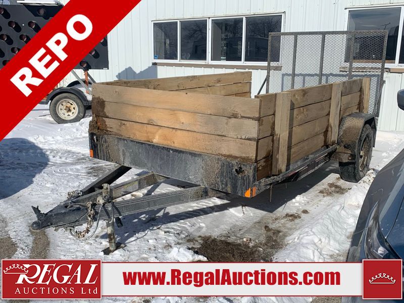 This unit is a 2025 Double A EQS36 single axle flat deck utility trailer. This unit has a GVWR of 1537 KG. The front end has light chips. Some of the wooden siding is deteriorated and has cracks. This unit is equipped with removable wood siding, a wood deck and a rear fold down ramp. Steel rims are mounted, the left tire has bald spots and will need to be replaced.