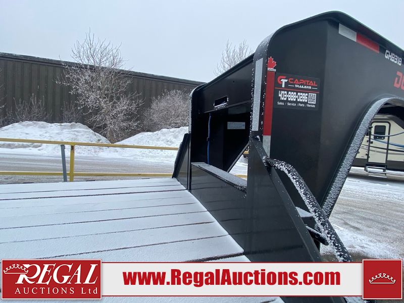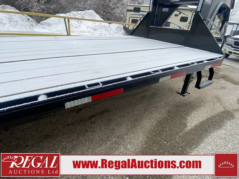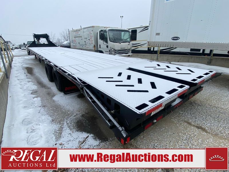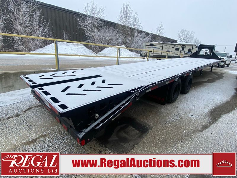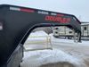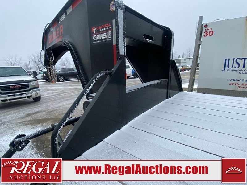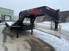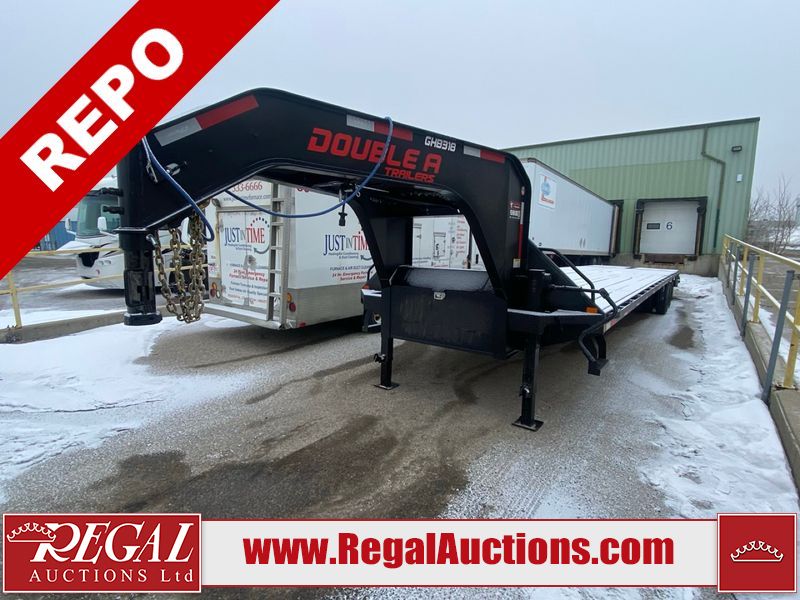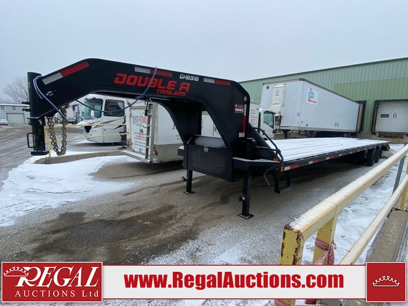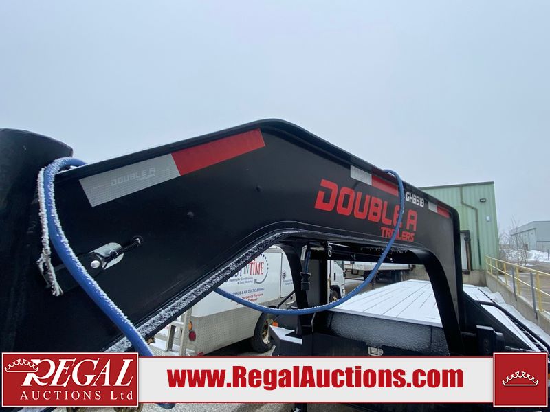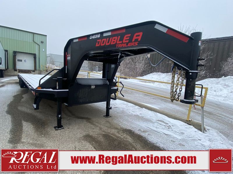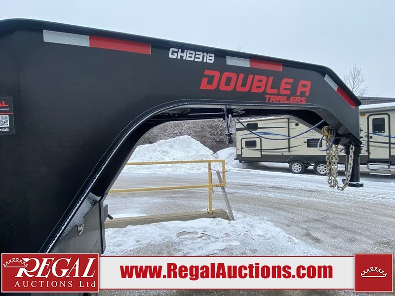 This unit is a 2025 Double A GHB318–40 gooseneck flat deck trailer. Its GVWR is 30,000 pounds. The front panels are showing minor chips, scratches, and scuffs. The deck is made of wood planks and is showing in good overall condition. This unit is equipped with leaf spring suspension. The tires are mounted to alloy rims in, appear to be in good enough condition for use. This unit is equipped with fold down beaver tail ramps.
