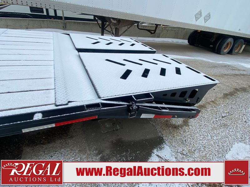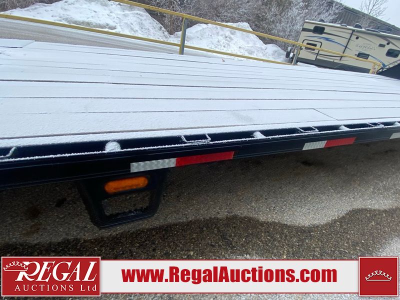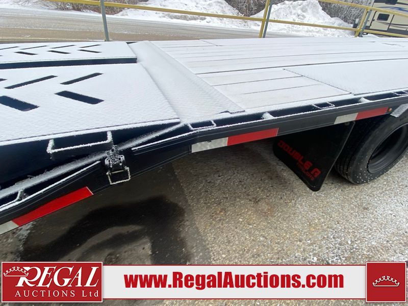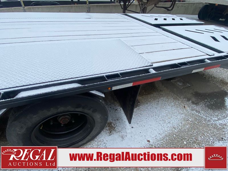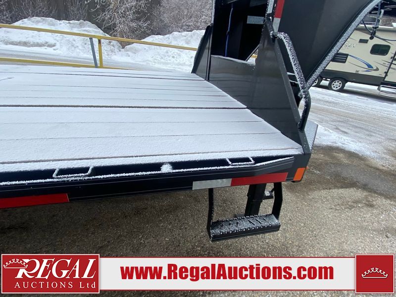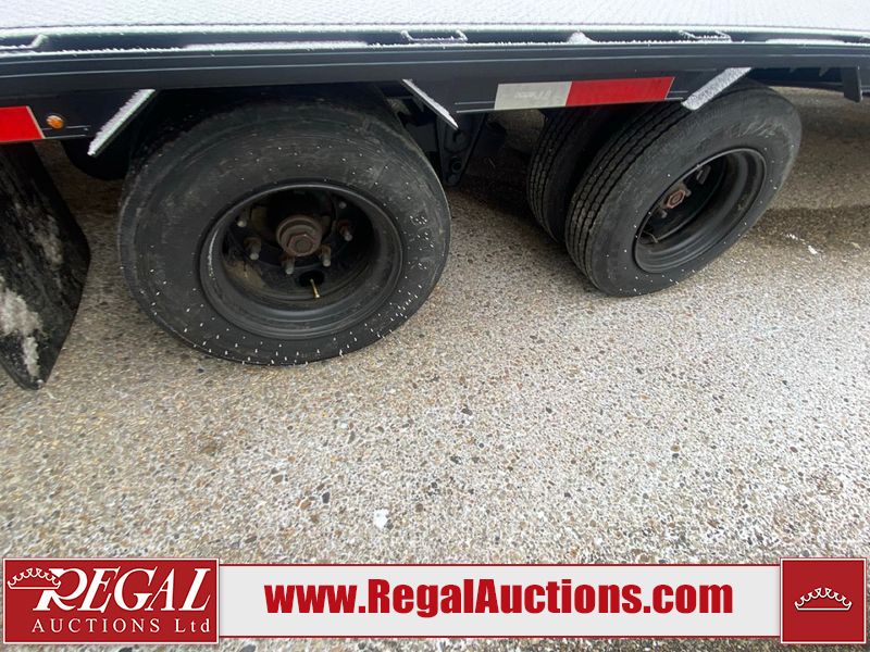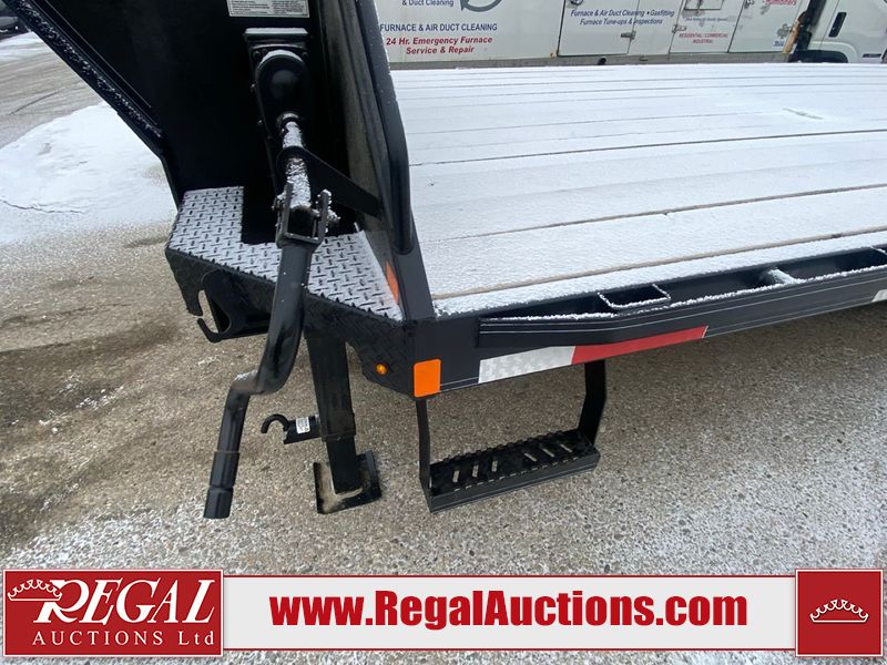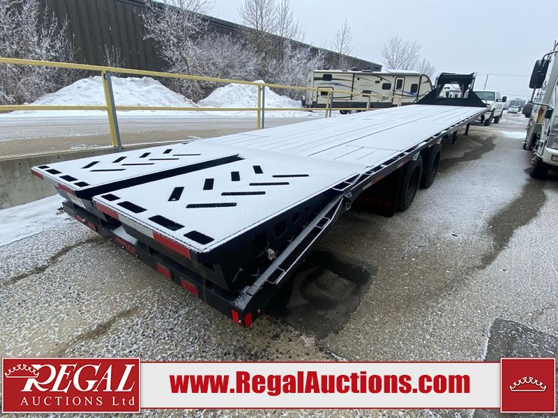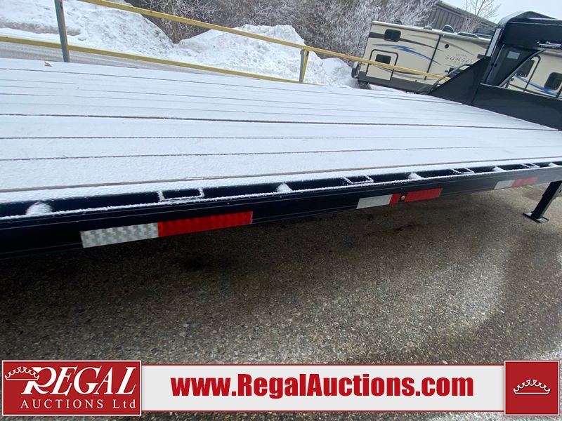 This unit is a 2025 Double A GHB318–40 gooseneck flat deck trailer. Its GVWR is 30,000 pounds. The front panels are showing minor chips, scratches, and scuffs. The deck is made of wood planks and is showing in good overall condition. This unit is equipped with leaf spring suspension. The tires are mounted to alloy rims in, appear to be in good enough condition for use. This unit is equipped with fold down beaver tail ramps.
