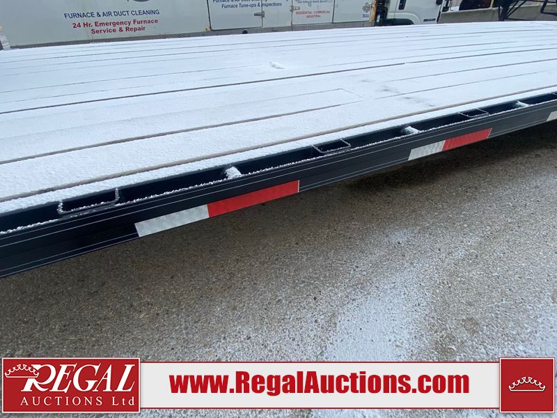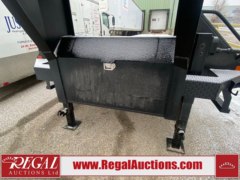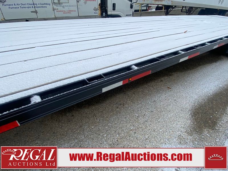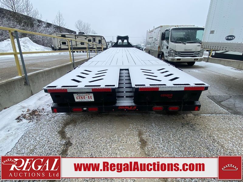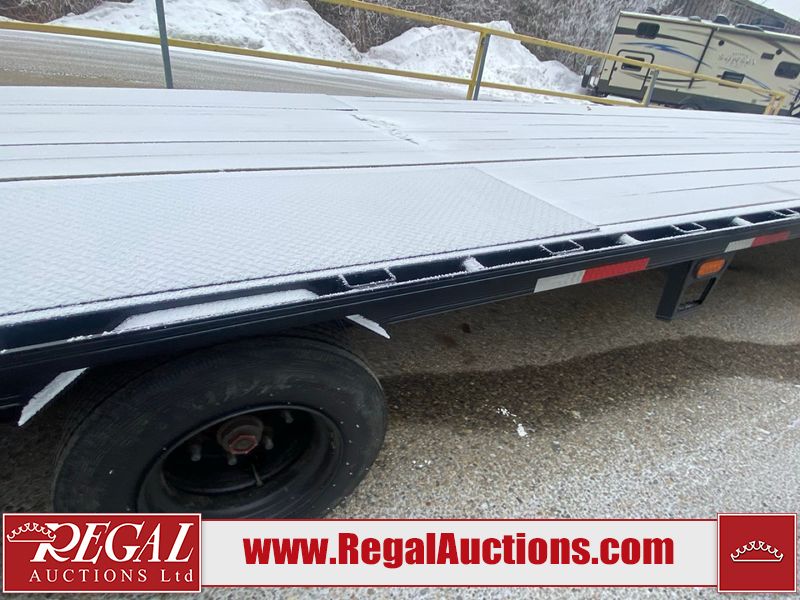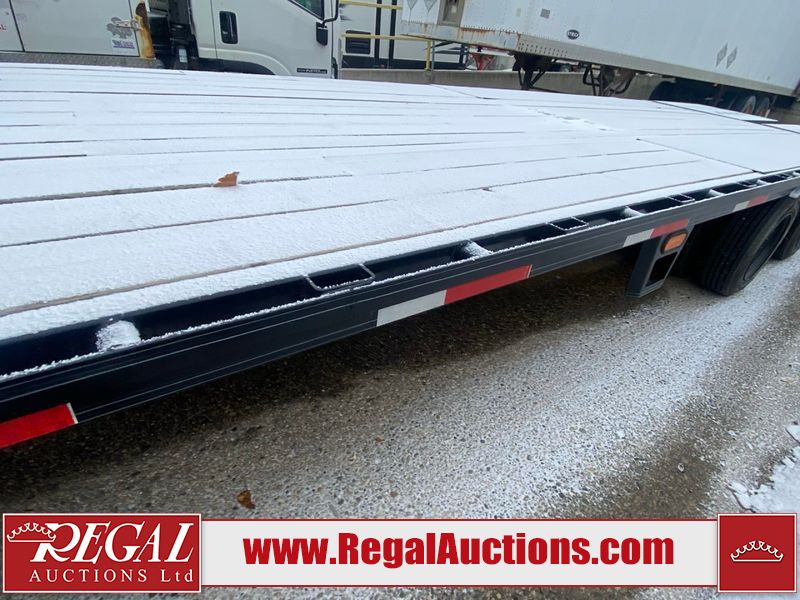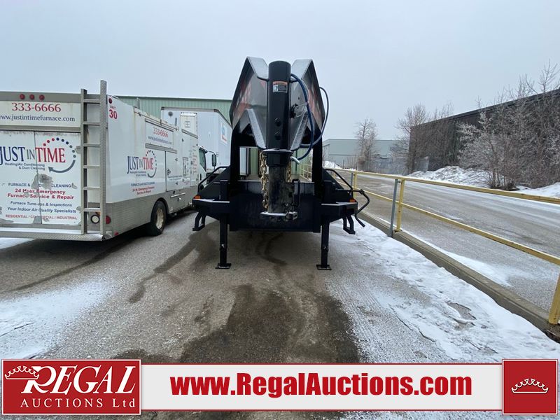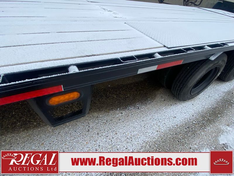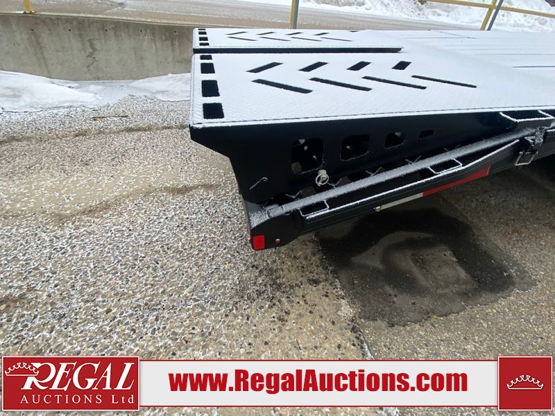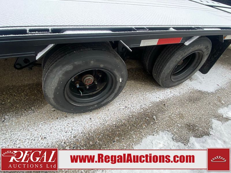 This unit is a 2025 Double A GHB318–40 gooseneck flat deck trailer. Its GVWR is 30,000 pounds. The front panels are showing minor chips, scratches, and scuffs. The deck is made of wood planks and is showing in good overall condition. This unit is equipped with leaf spring suspension. The tires are mounted to alloy rims in, appear to be in good enough condition for use. This unit is equipped with fold down beaver tail ramps.