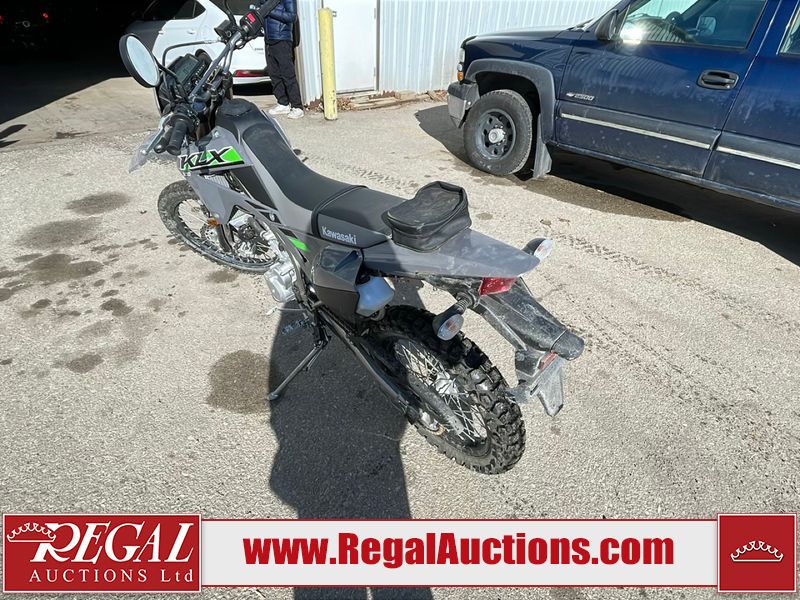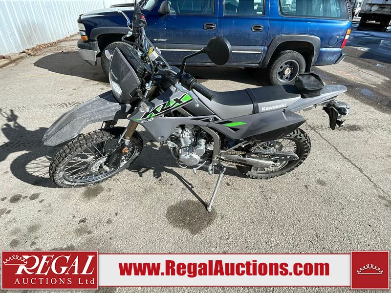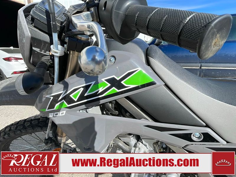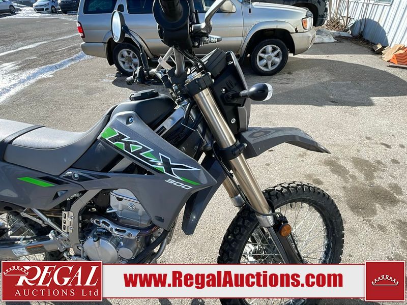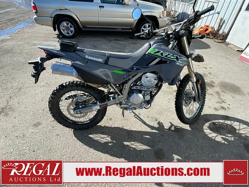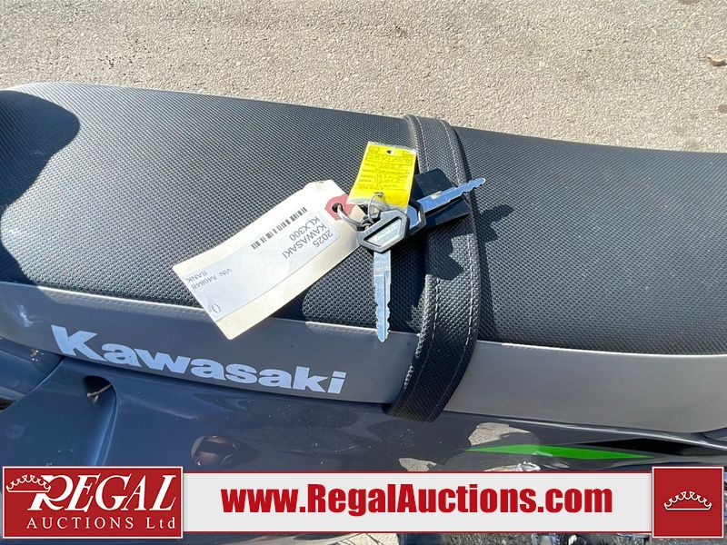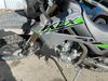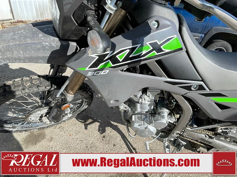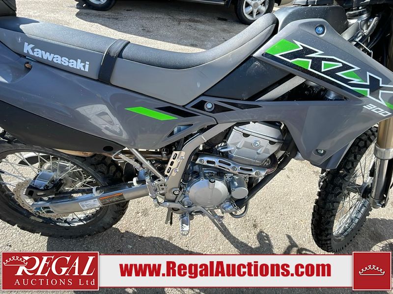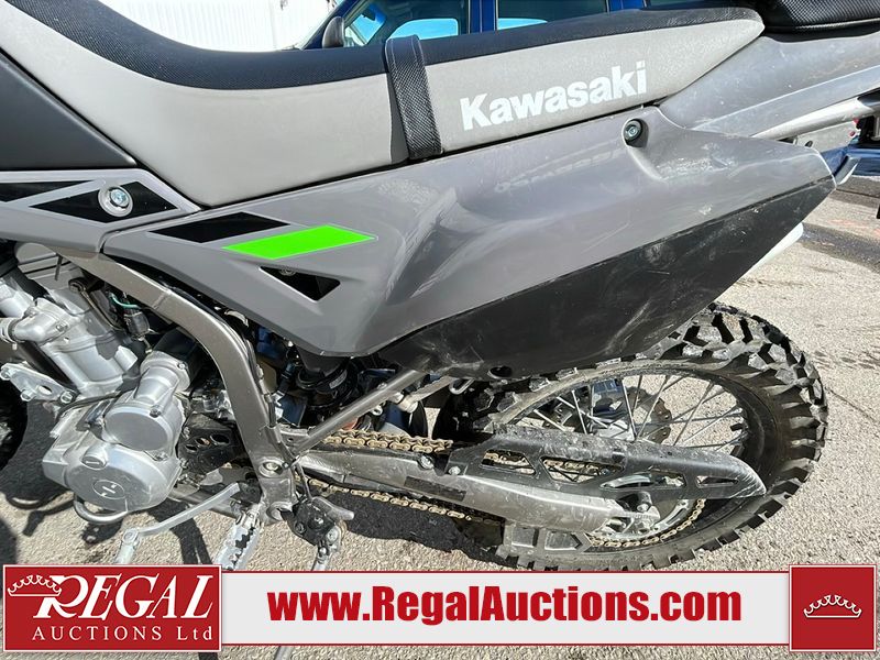 This dirt bike is a 2025 Kawasaki KLX300FSFN KLX300 model. The odometer shows 354 km. This unit is showing signs of being dropped. The clutch handle is scratched. The left grip is torn. The gear selector is bent and has peeling paint. The kick stand is misaligned. This unit starts and runs without a boost. This unit is powered by a 292cc one cylinder two stroke liquid cooled engine with a six speed transmission and a chain final drive. The tires are mounted to alloy rims and appear to be in good enough condition for use.