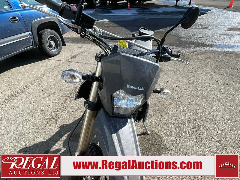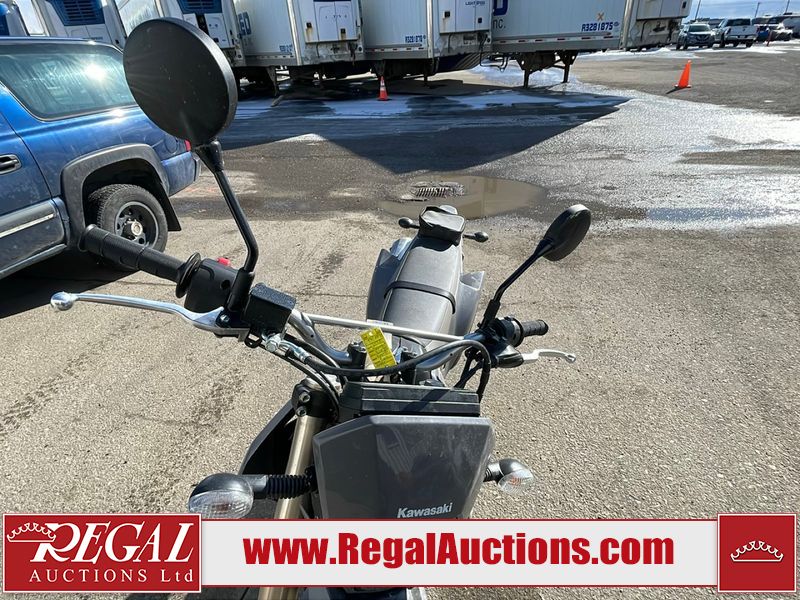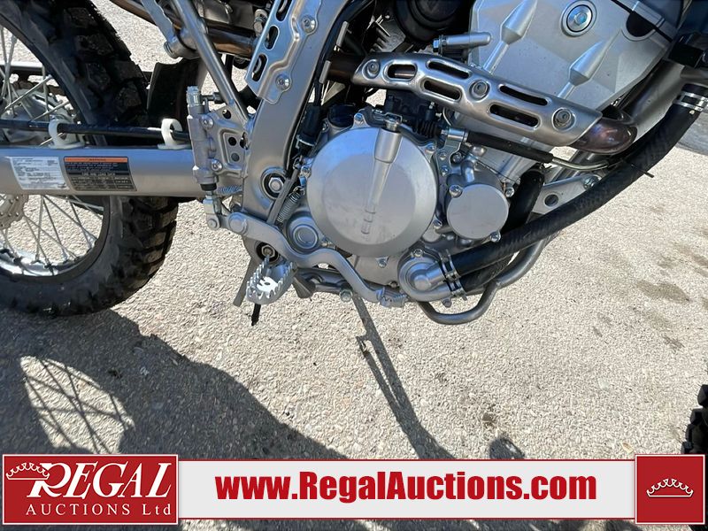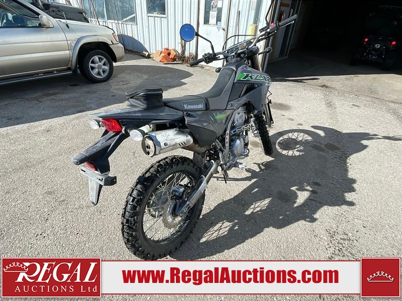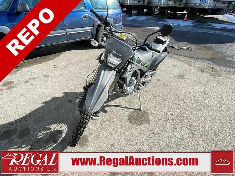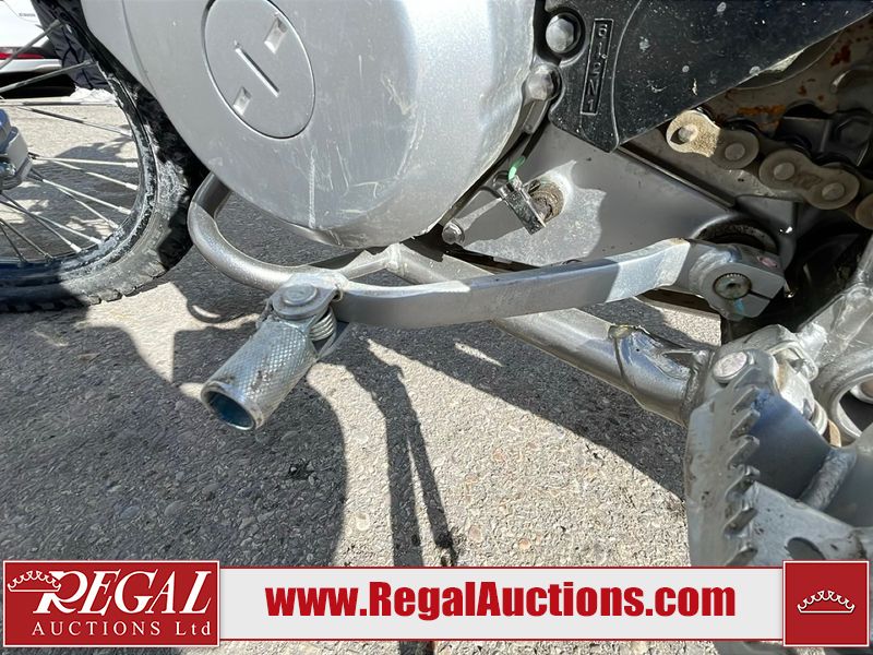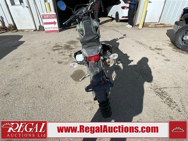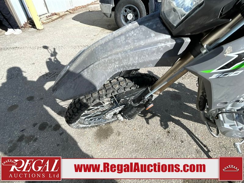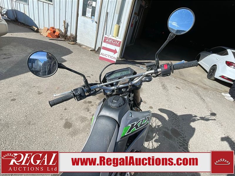 This dirt bike is a 2025 Kawasaki KLX300FSFN KLX300 model. The odometer shows 354 km. This unit is showing signs of being dropped. The clutch handle is scratched. The left grip is torn. The gear selector is bent and has peeling paint. The kick stand is misaligned. This unit starts and runs without a boost. This unit is powered by a 292cc one cylinder two stroke liquid cooled engine with a six speed transmission and a chain final drive. The tires are mounted to alloy rims and appear to be in good enough condition for use.