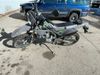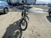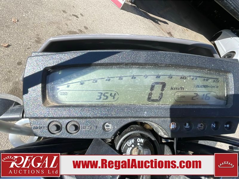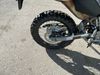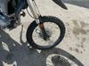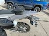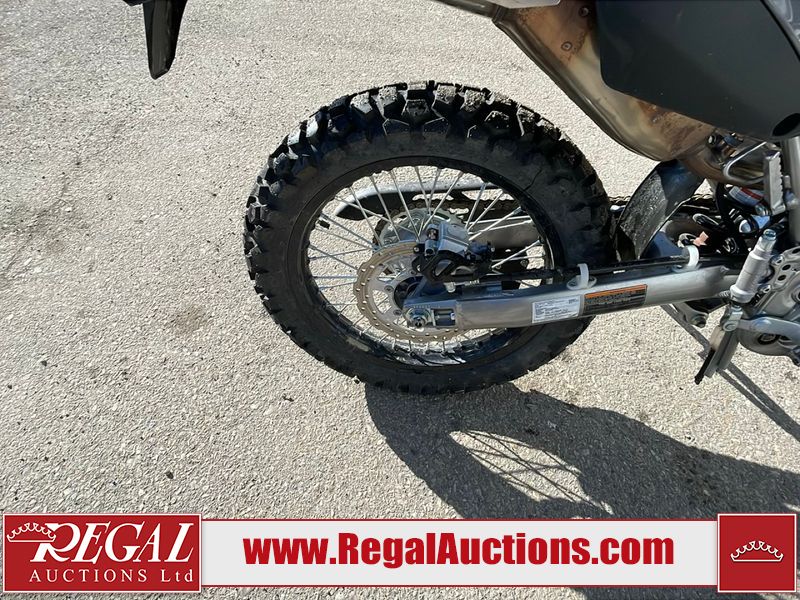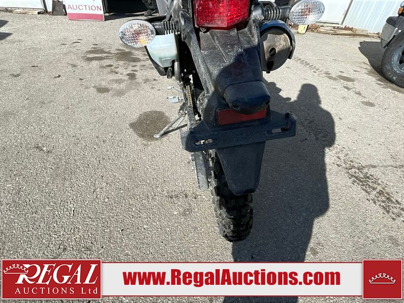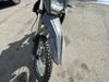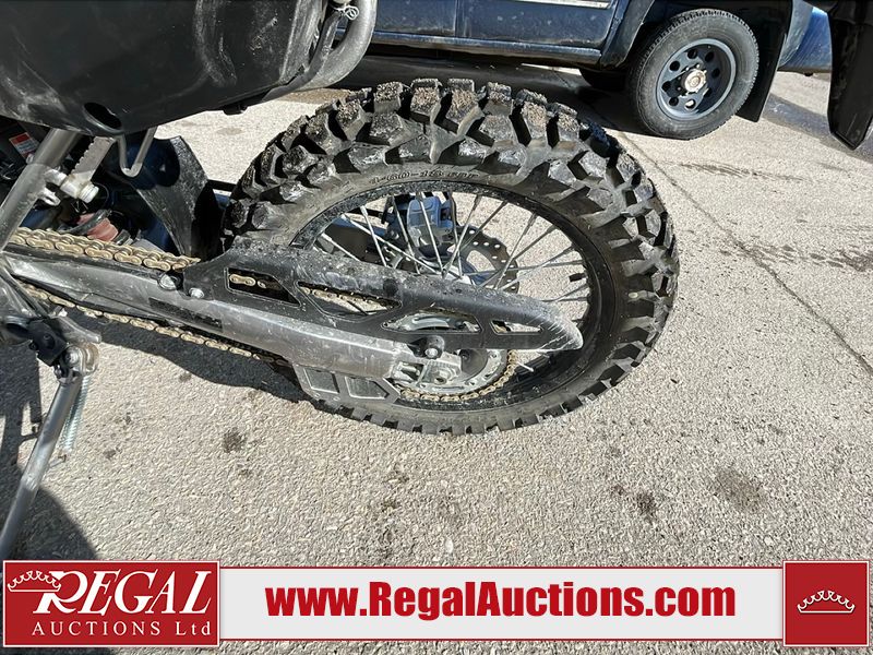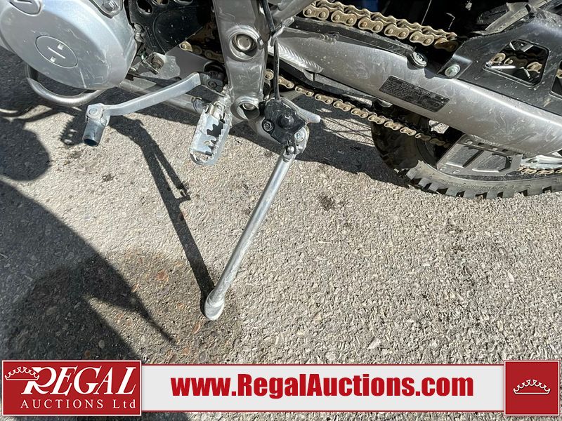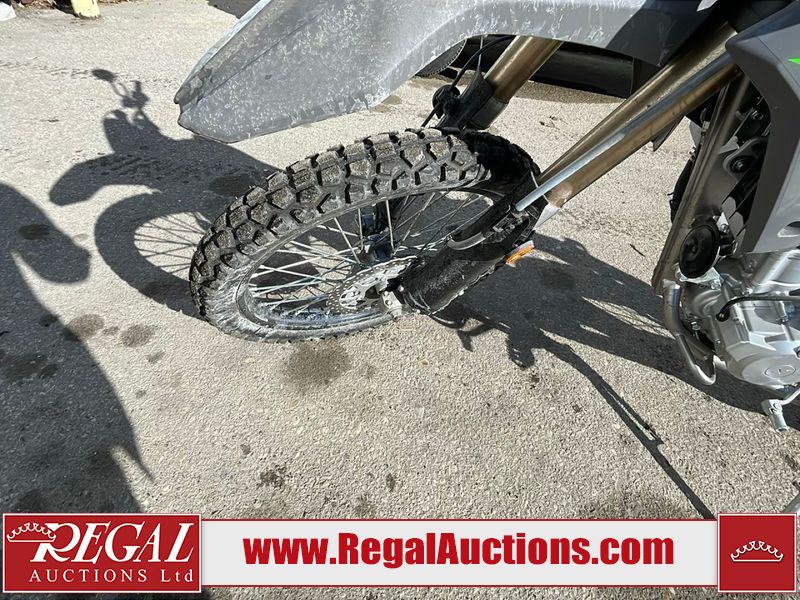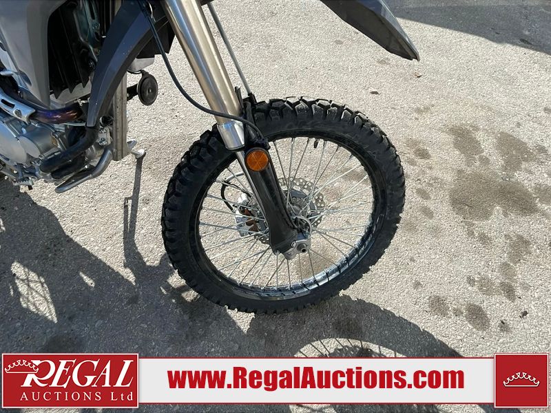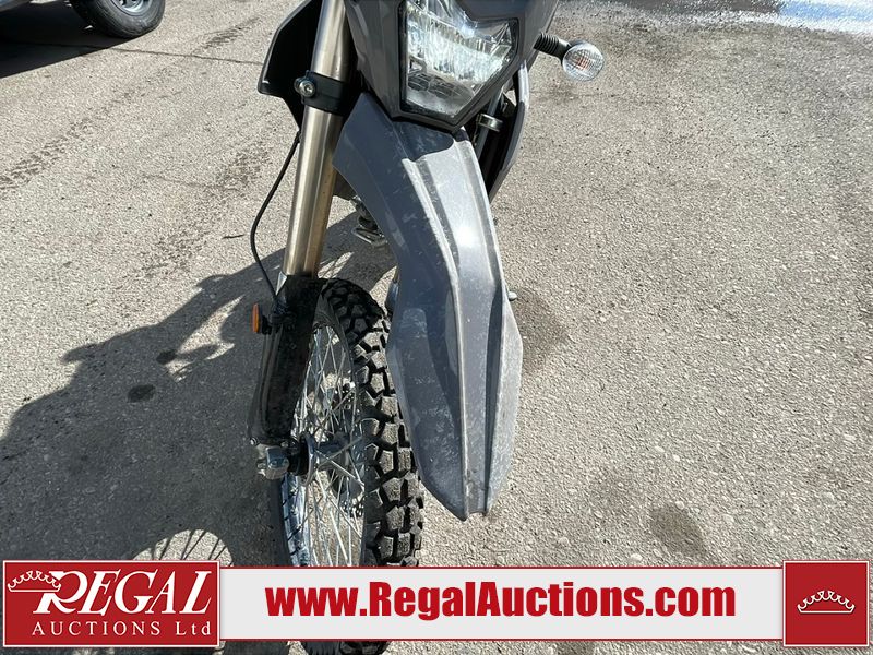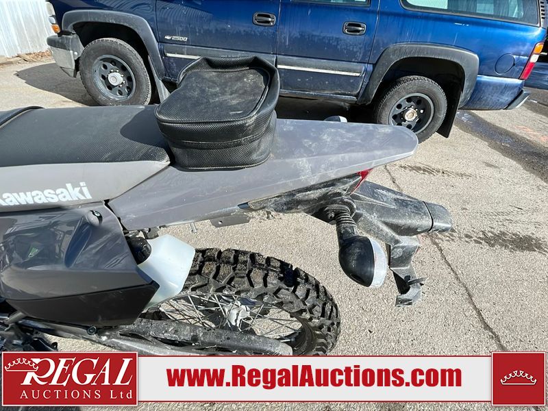 This dirt bike is a 2025 Kawasaki KLX300FSFN KLX300 model. The odometer shows 354 km. This unit is showing signs of being dropped. The clutch handle is scratched. The left grip is torn. The gear selector is bent and has peeling paint. The kick stand is misaligned. This unit starts and runs without a boost. This unit is powered by a 292cc one cylinder two stroke liquid cooled engine with a six speed transmission and a chain final drive. The tires are mounted to alloy rims and appear to be in good enough condition for use.