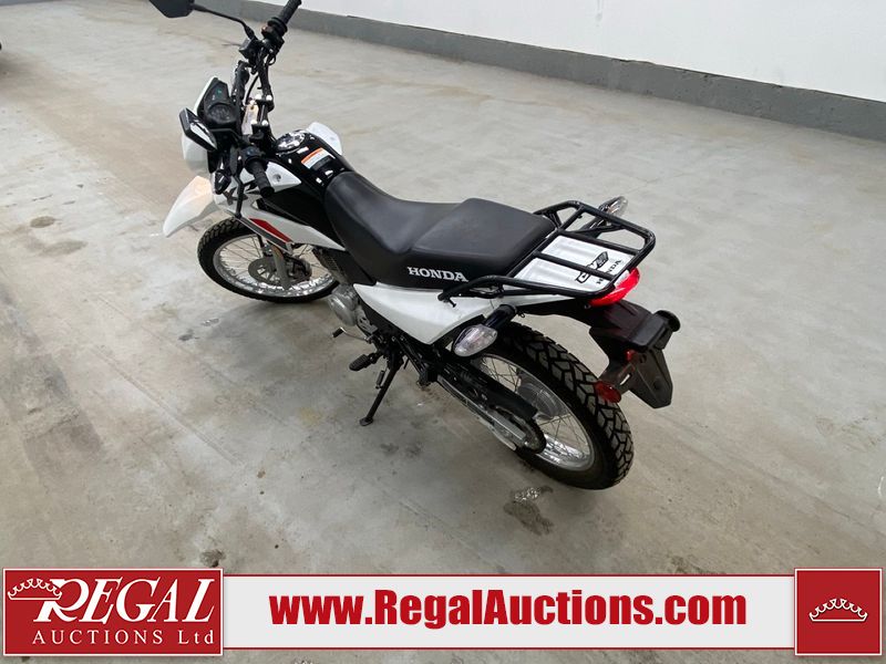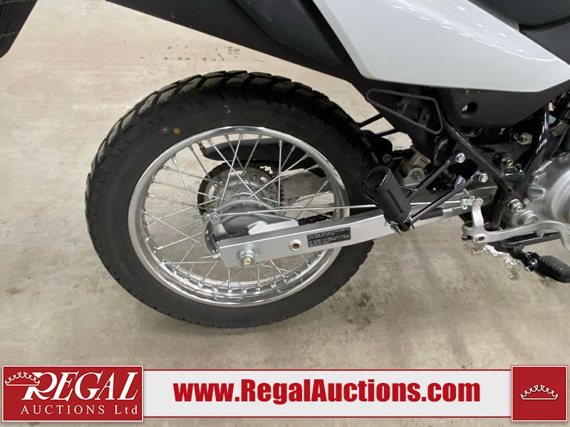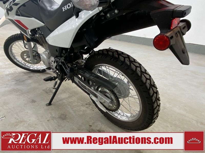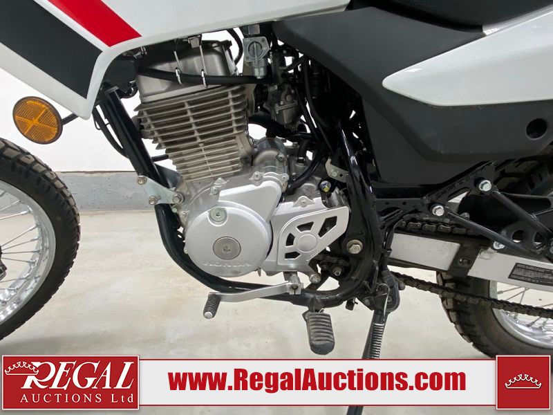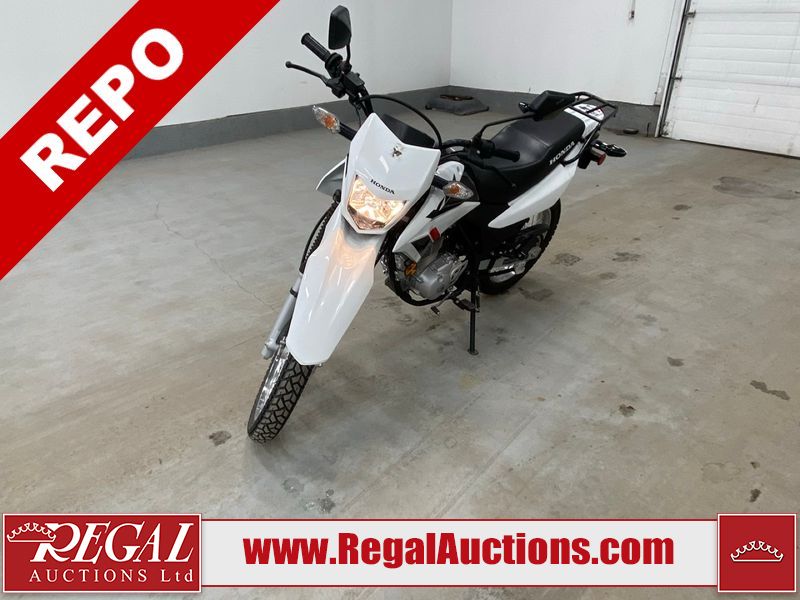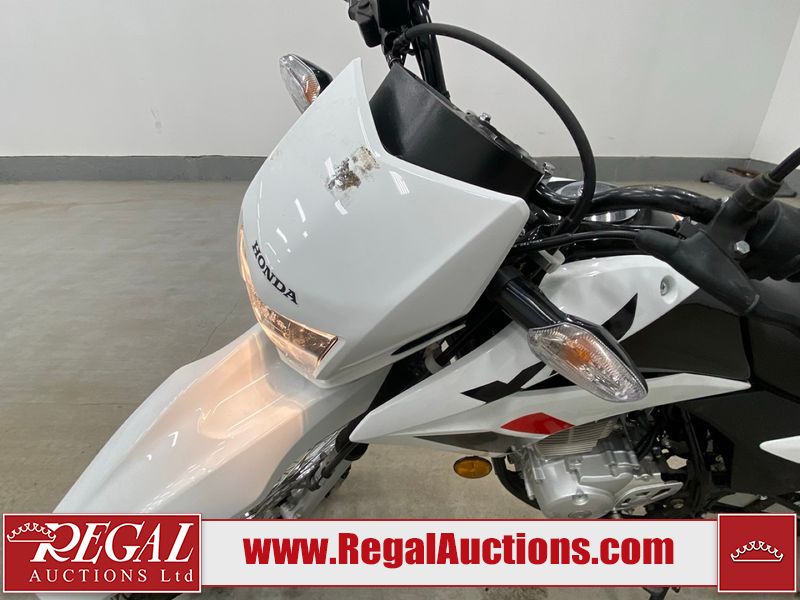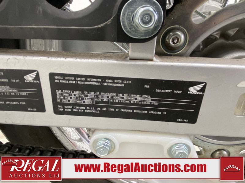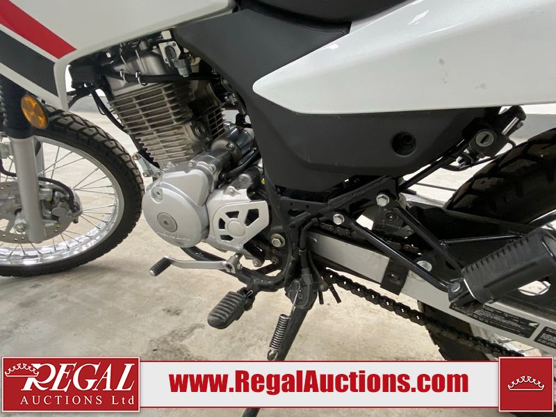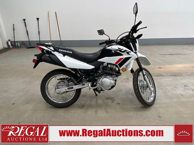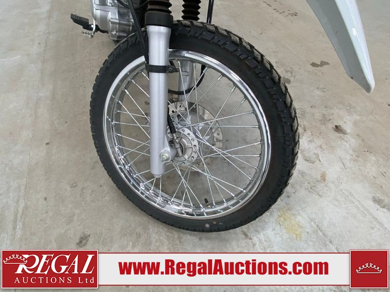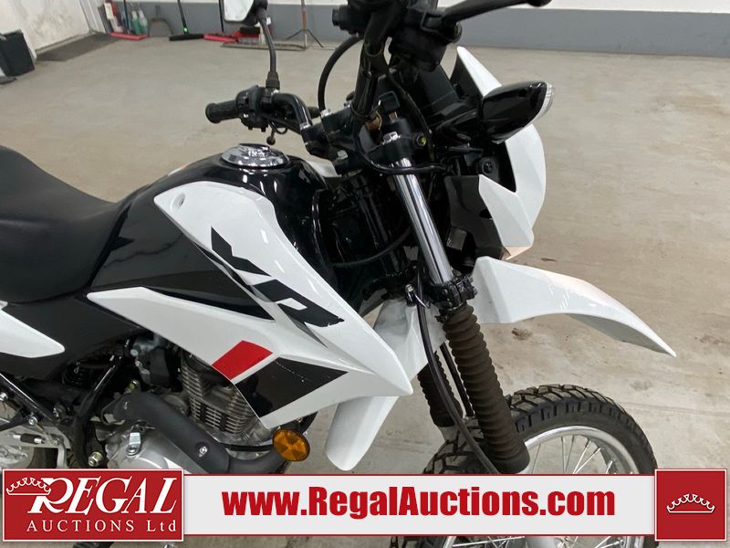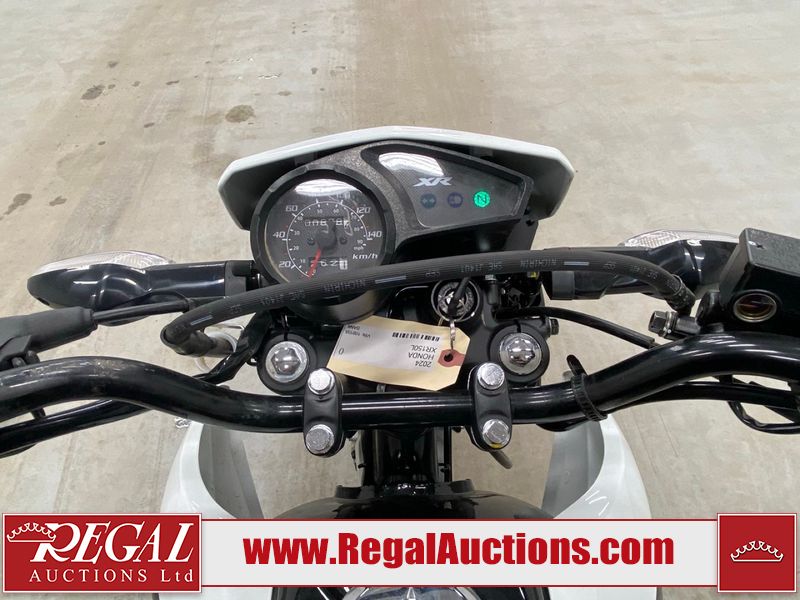 This motorcycle is a 2024 Honda XR150L. The odometer reads 6744 kms and 261 engine hours. The front plastics shows minor scratches and residue on the head light housing. The battery is dead and will require a boost. It is powered by a 149cc air-cooled single cylinder, four stroke engine paired with a five speed-manual transmission. The tires have been mounted to alloy rims and appear to be in good enough condition for use. This unit is equipped with a rear cargo rack, lighting instruments, analog speedometer, electric starter and folding passenger foot pegs.