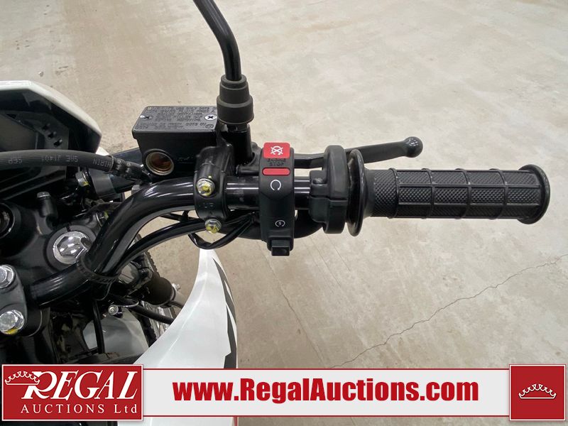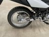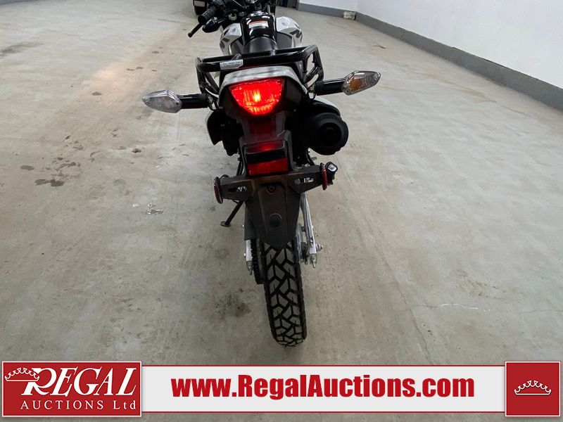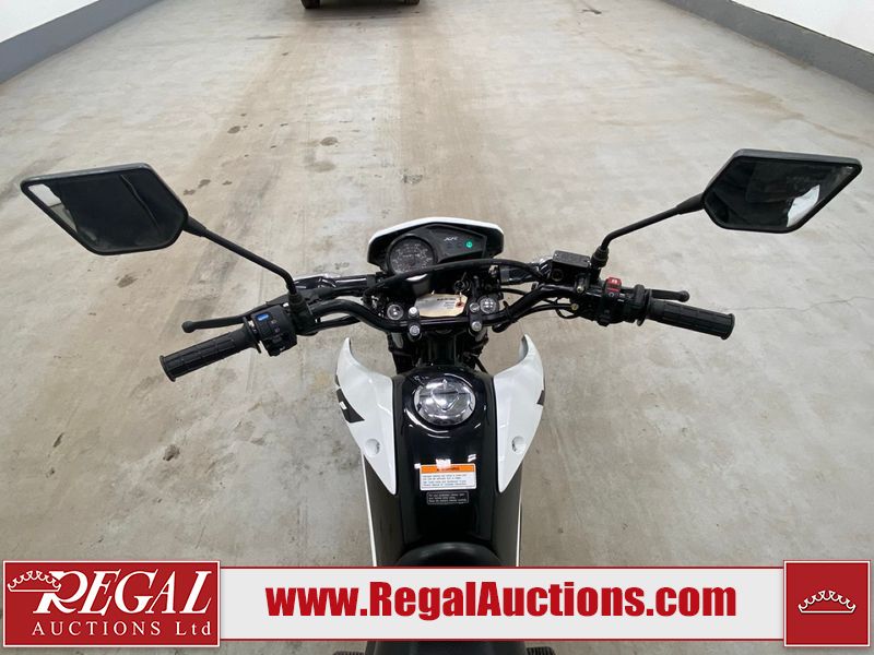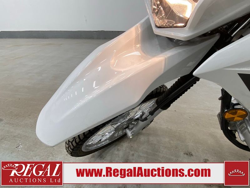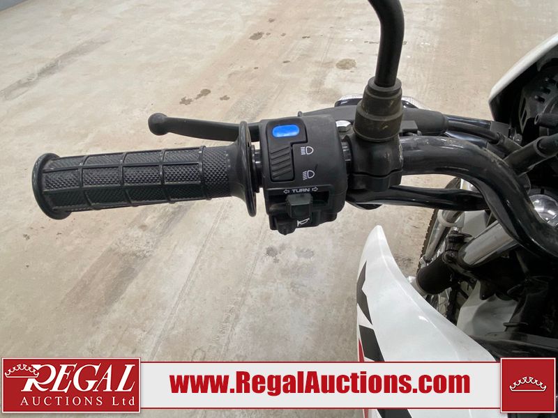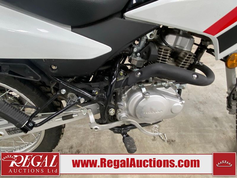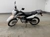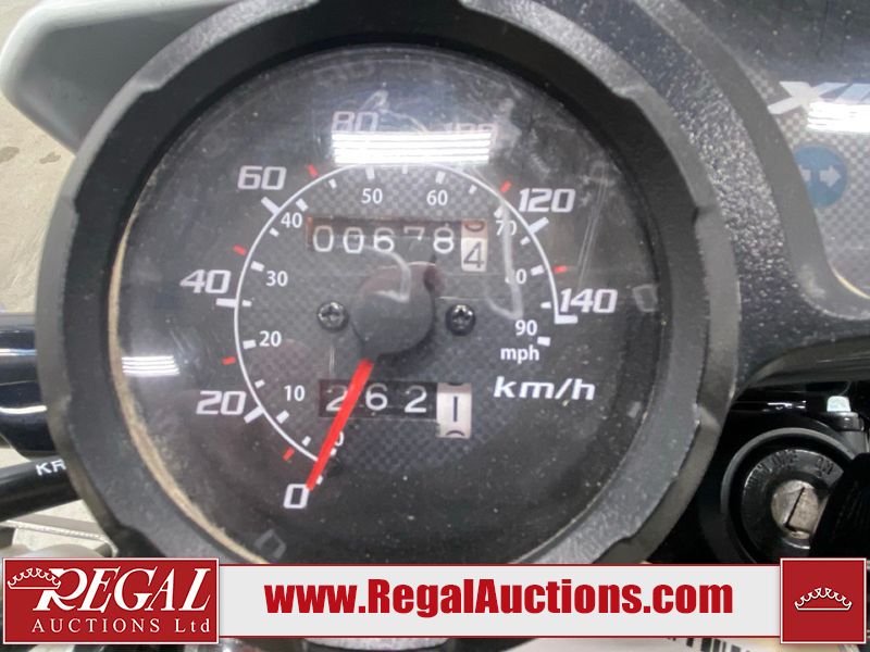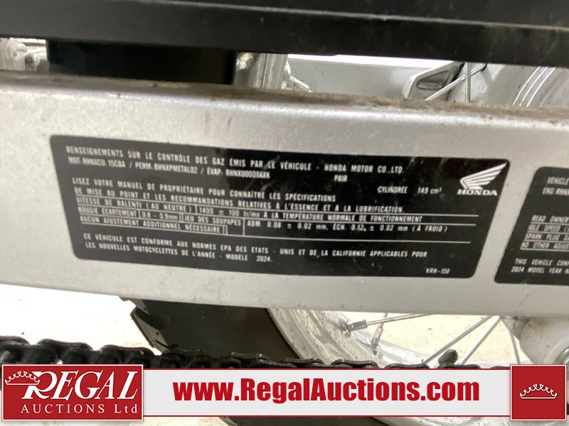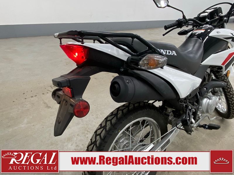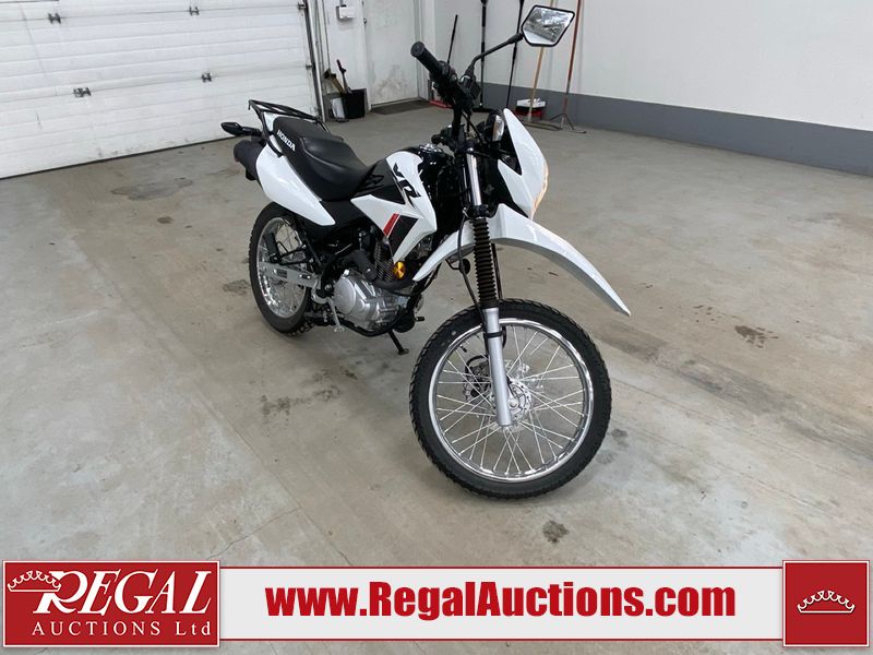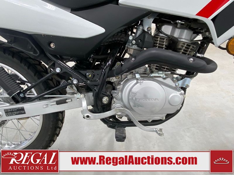 This motorcycle is a 2024 Honda XR150L. The odometer reads 6744 kms and 261 engine hours. The front plastics shows minor scratches and residue on the head light housing. The battery is dead and will require a boost. It is powered by a 149cc air-cooled single cylinder, four stroke engine paired with a five speed-manual transmission. The tires have been mounted to alloy rims and appear to be in good enough condition for use. This unit is equipped with a rear cargo rack, lighting instruments, analog speedometer, electric starter and folding passenger foot pegs.