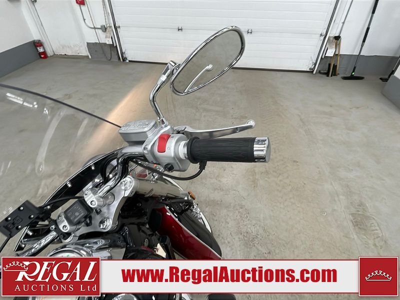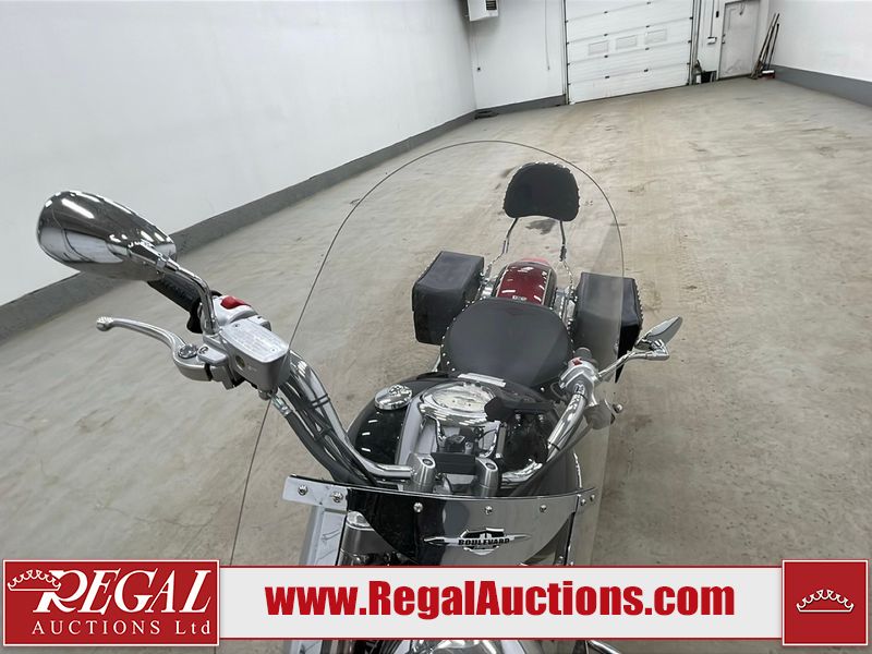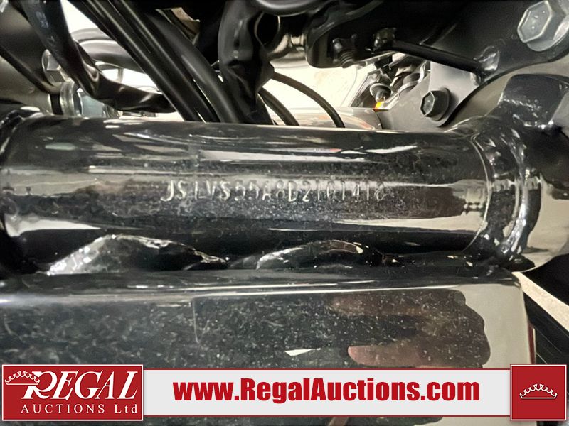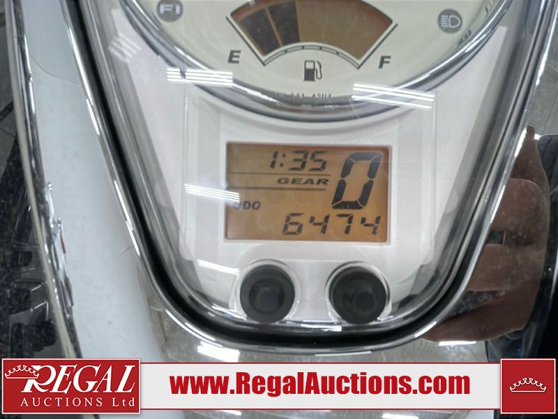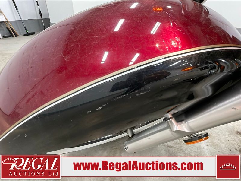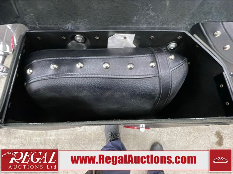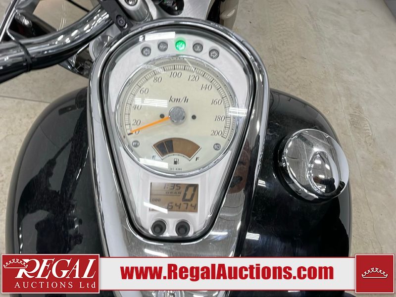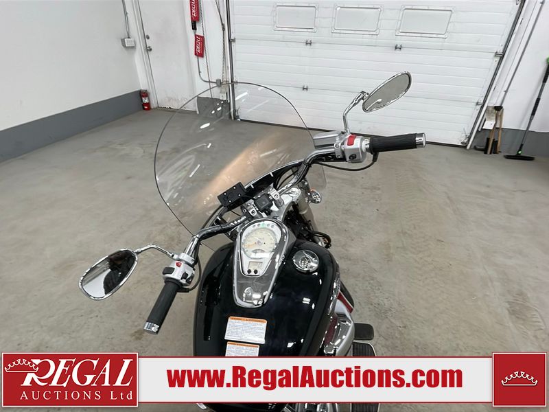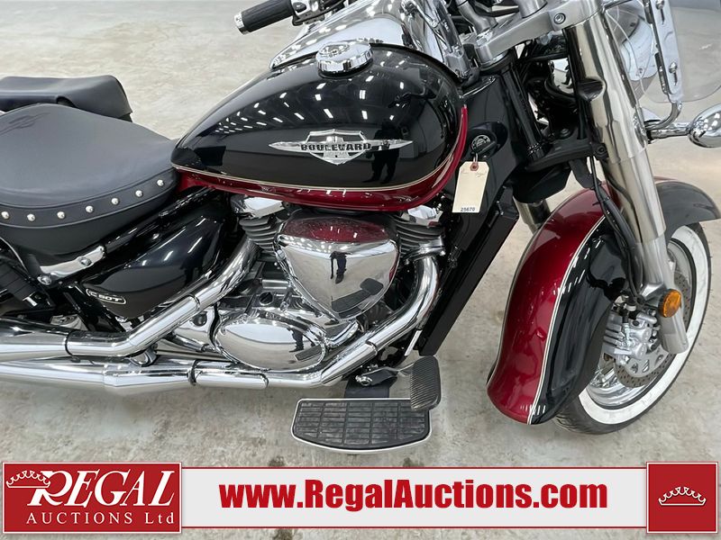 This cruiser style motorcycle is a 2013 Suzuki VL800TL3 BOULEVARD C50T model. The odometer shows 6474 km. The seat is scuffed. The passenger seat bolt is missing. The seat is inside the saddlebag. The front fender is chipped. The windshield is scratched. The left saddle bag flap is worn. The rear fender is chipped. This unit starts and runs with a boost. The battery is dead. This unit is powered by a 805CC Vtwin two cylinder four stroke liquid cooled engine and a six speed manual transmission with a shaft final drive. The tires appear to be in good enough condition for use. This unit is equipped with aftermarket Hot grips.