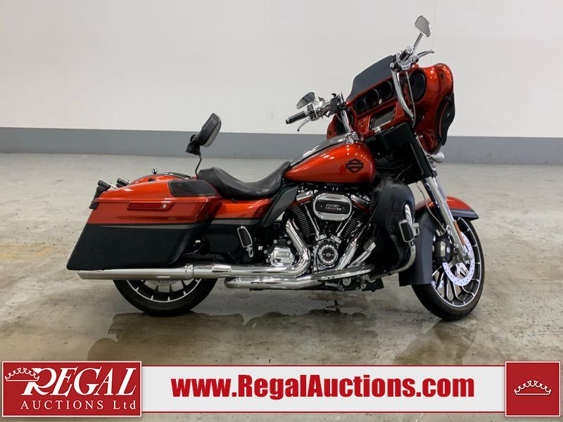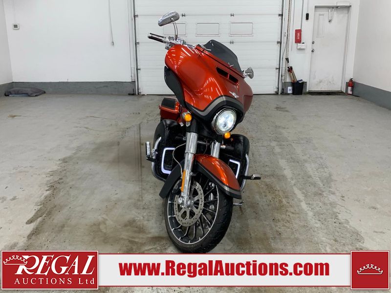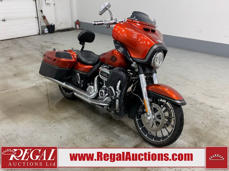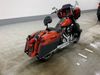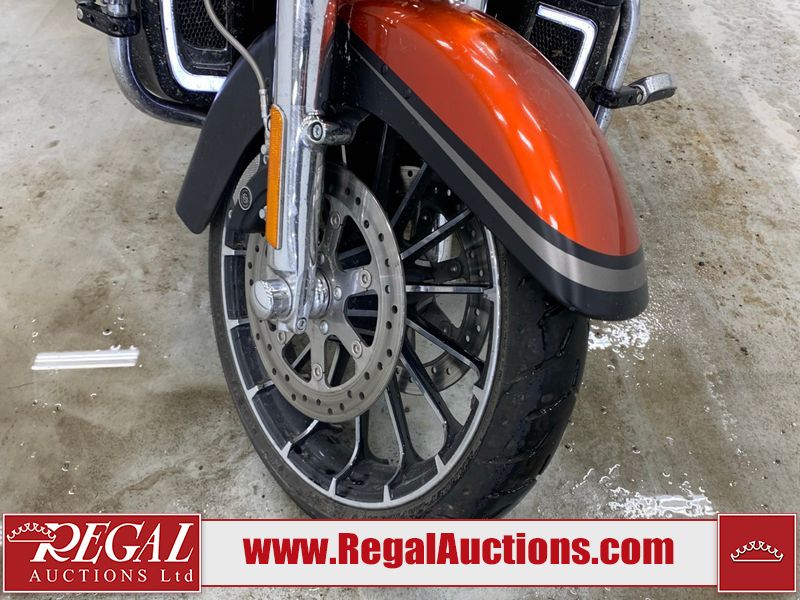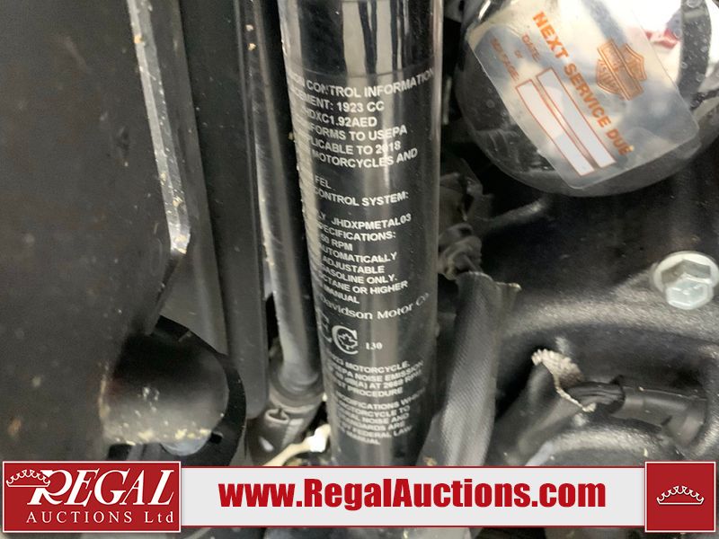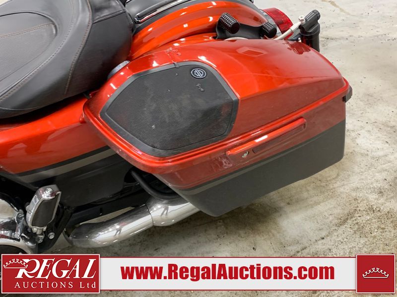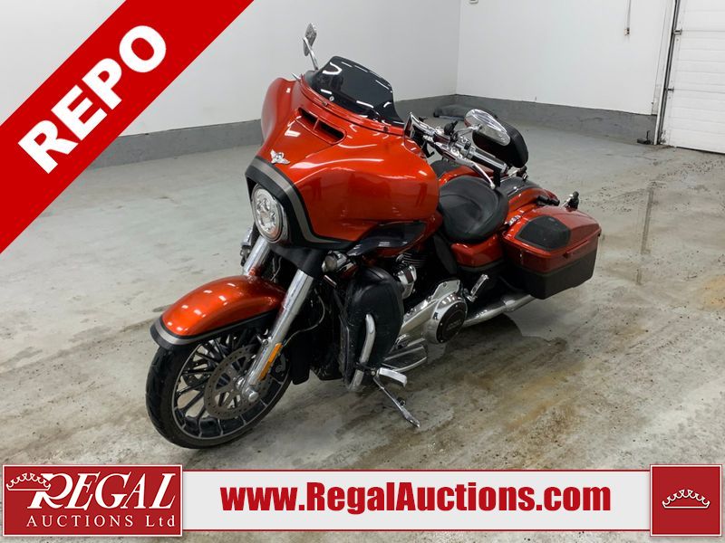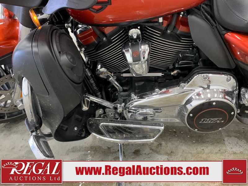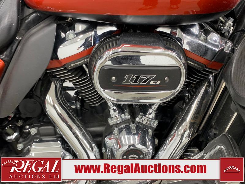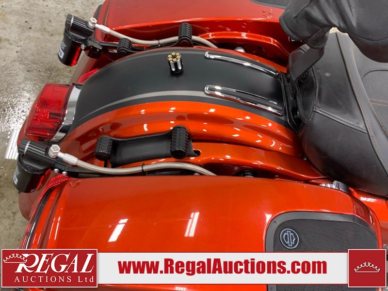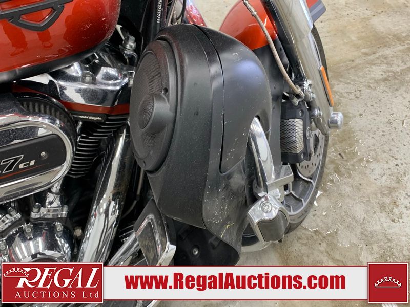This unit is a 2018 Harley Davidson CVO Street Glide model. The odometre reads 113,689 Kilometres. The front fender and front fairing have chips. There are scratches on the gas tank and saddlebags. The rear seat is missing. Aftermarket suspension has been installed. An aftermarket fuel cap has been installed. The engine starts and runs without a boost. This motorcycle is powered by a 1923cc V-Twin cylinder Oil & air cooled engine with a six-speed manual transmission with a belt final drive. And aftermarket exhaust has been installed. The tires appear to be in good enough condition for use. This unit is equipped with a stereo system and a navigation system.