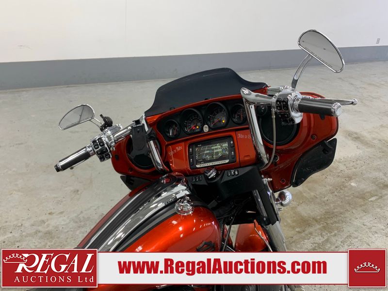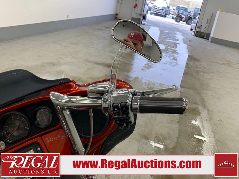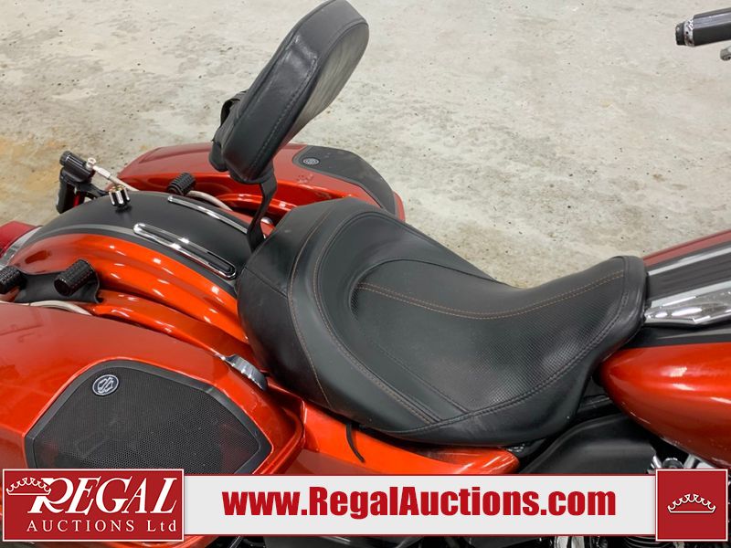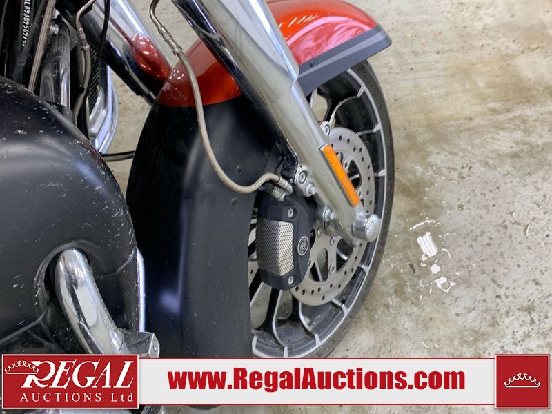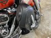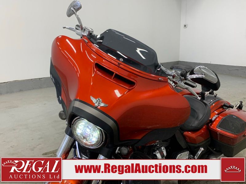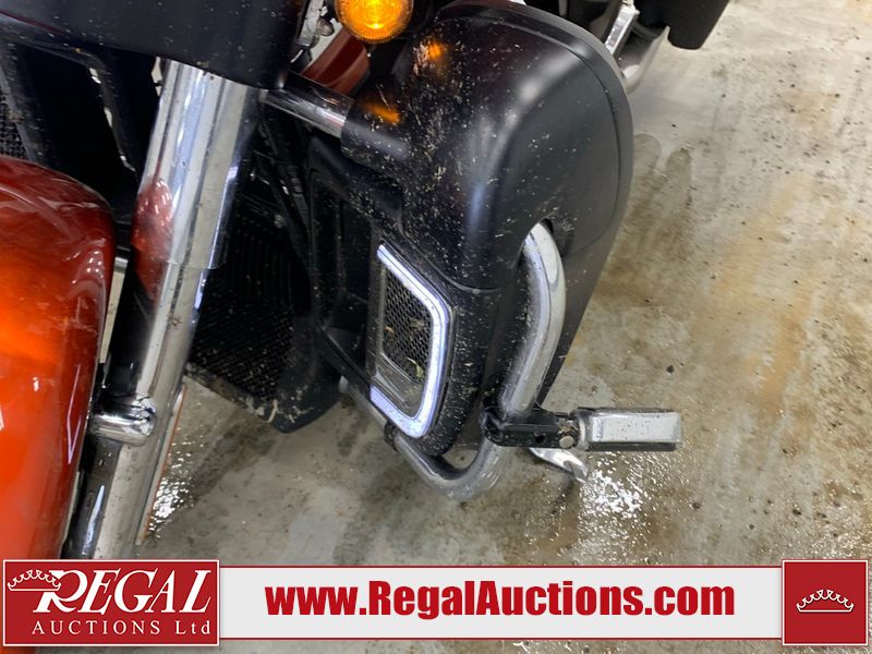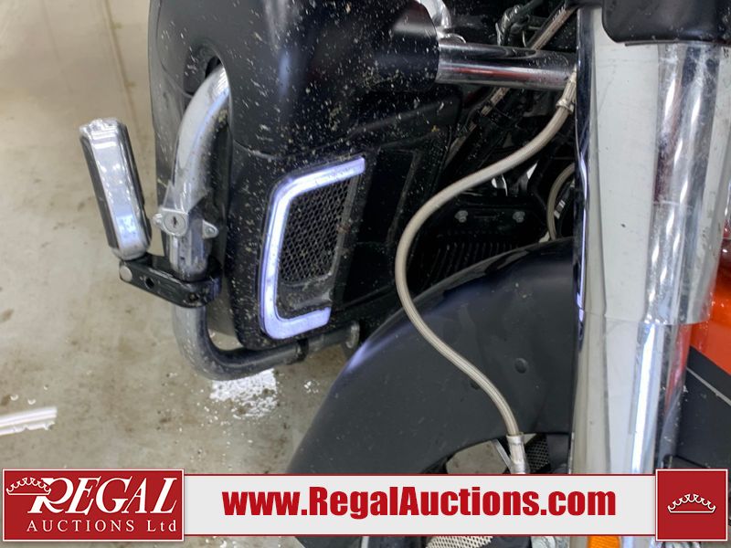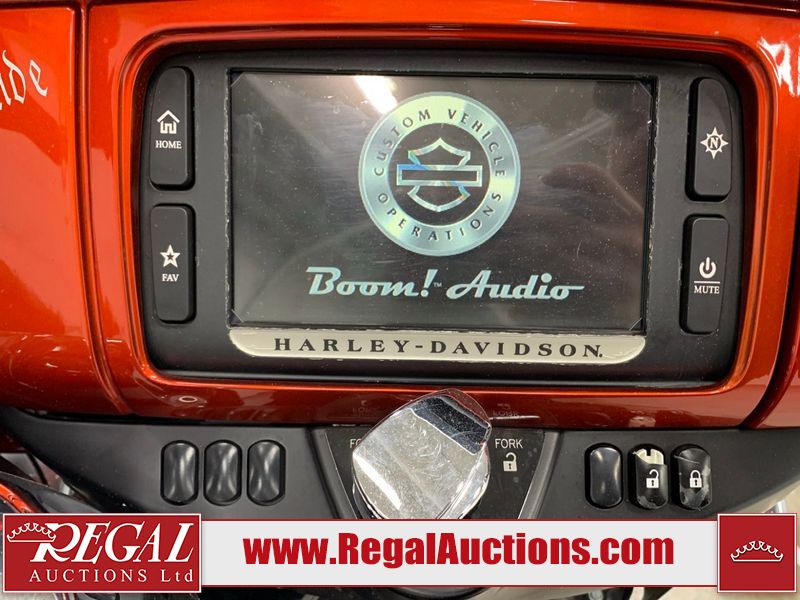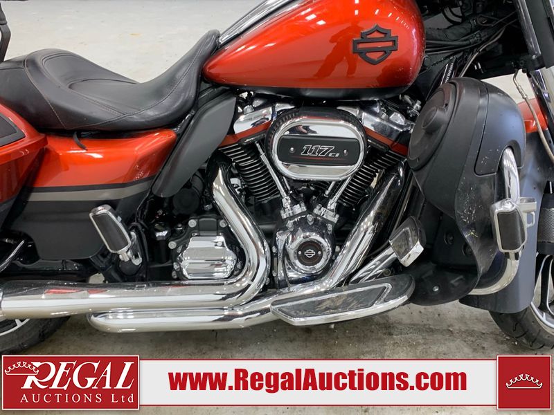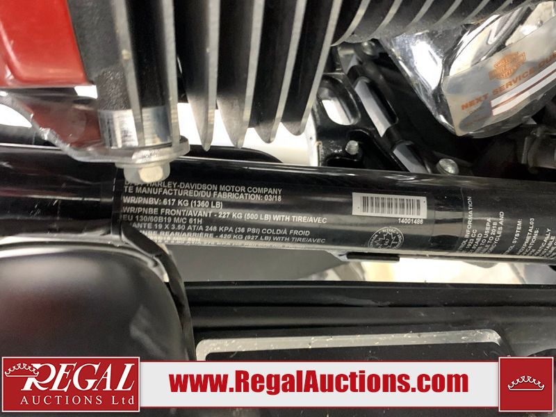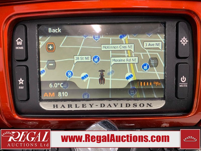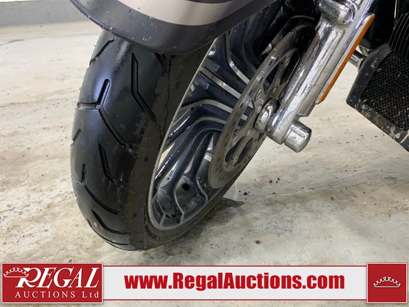 This unit is a 2018 Harley Davidson CVO Street Glide model. The odometre reads 113,689 Kilometres. The front fender and front fairing have chips. There are scratches on the gas tank and saddlebags. The rear seat is missing. Aftermarket suspension has been installed. An aftermarket fuel cap has been installed. The engine starts and runs without a boost. This motorcycle is powered by a 1923cc V-Twin cylinder Oil & air cooled engine with a six-speed manual transmission with a belt final drive. And aftermarket exhaust has been installed. The tires appear to be in good enough condition for use. This unit is equipped with a stereo system and a navigation system.