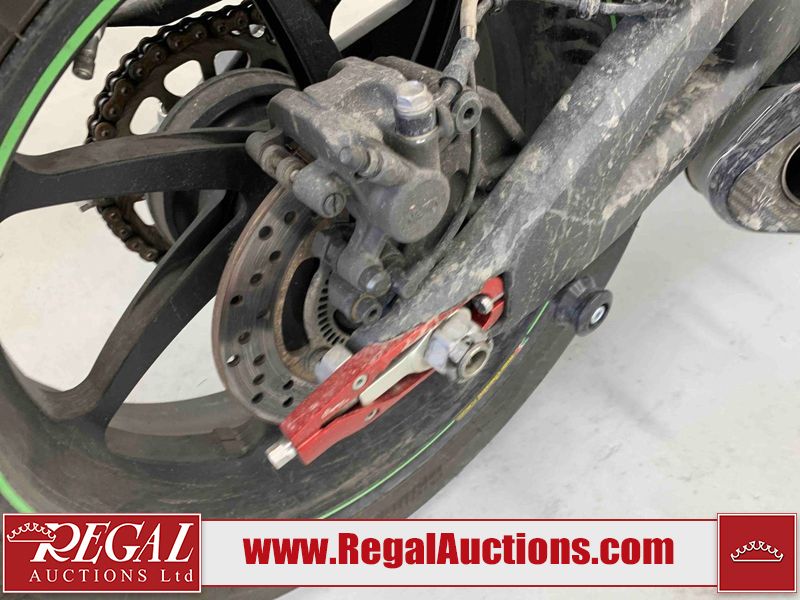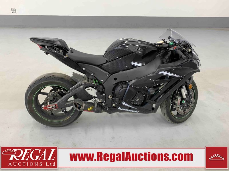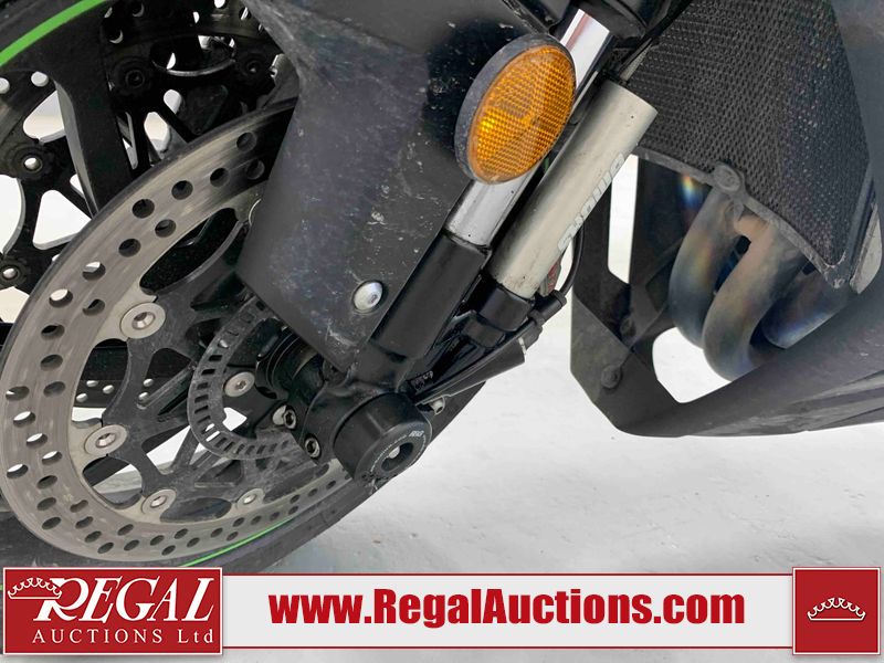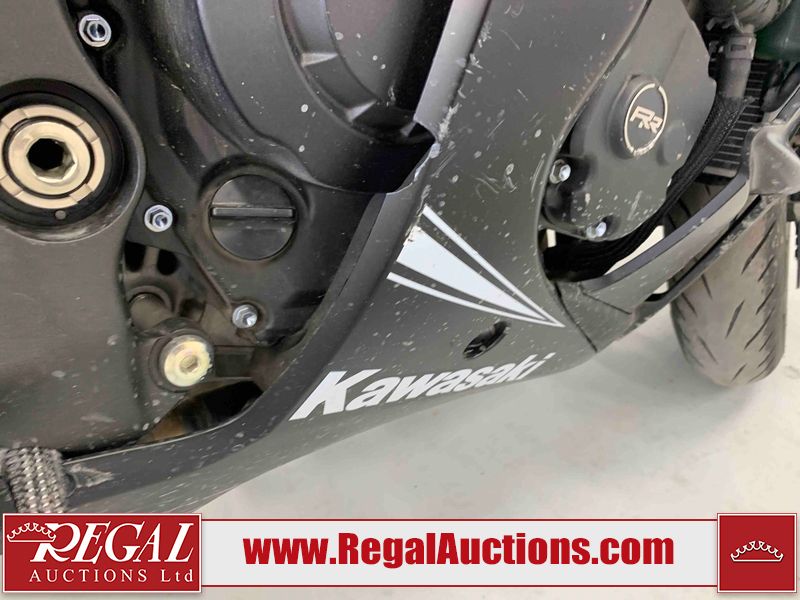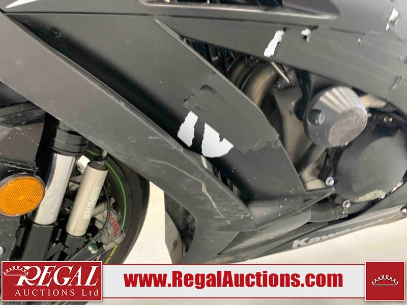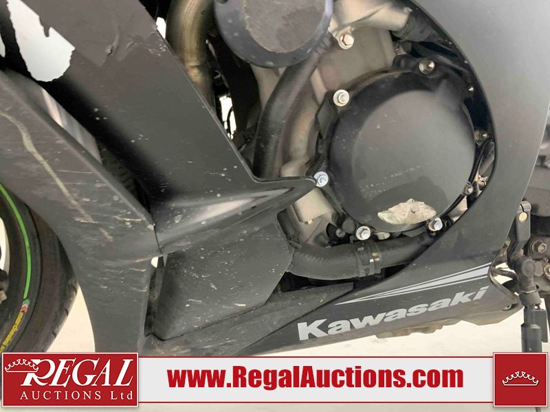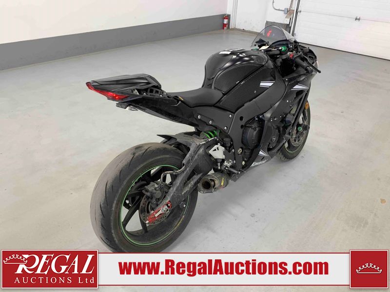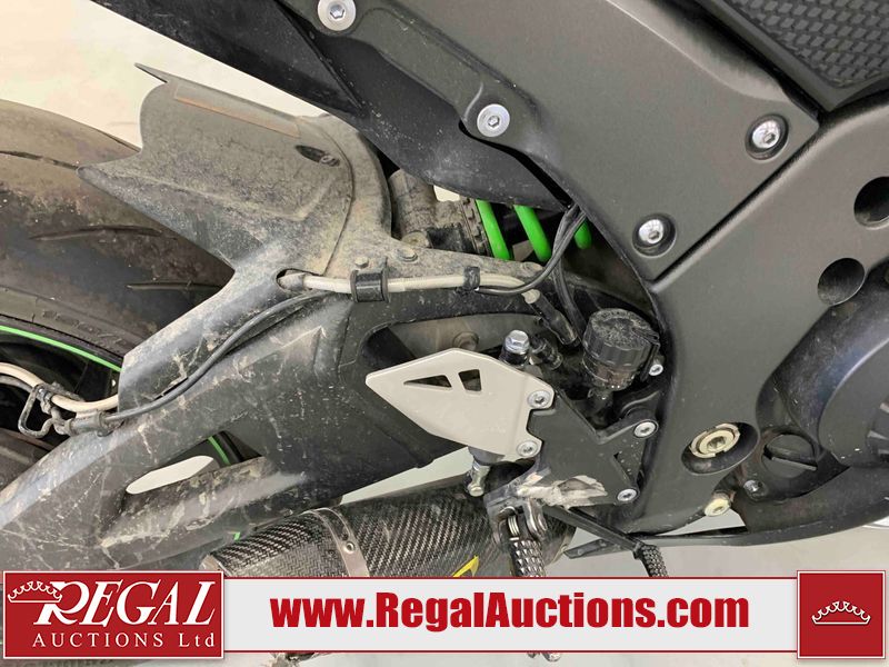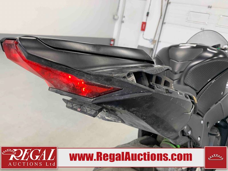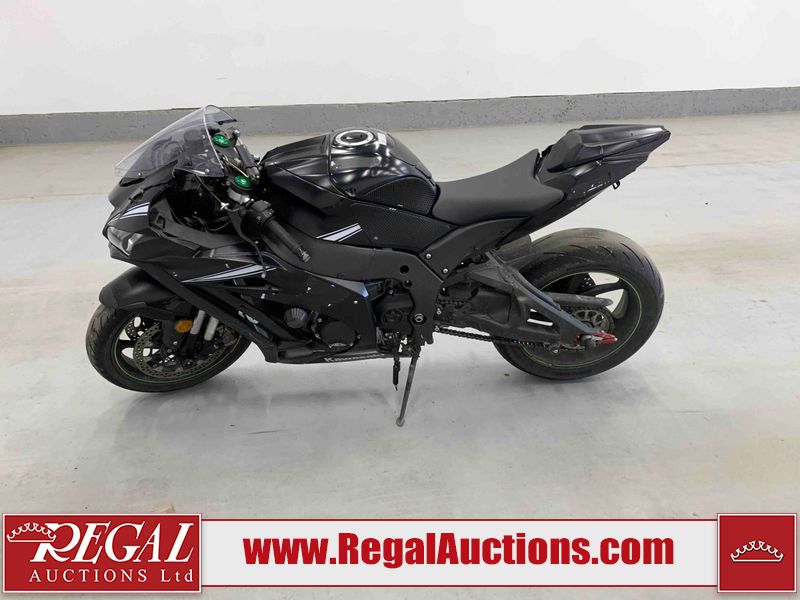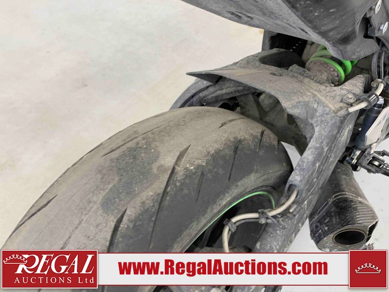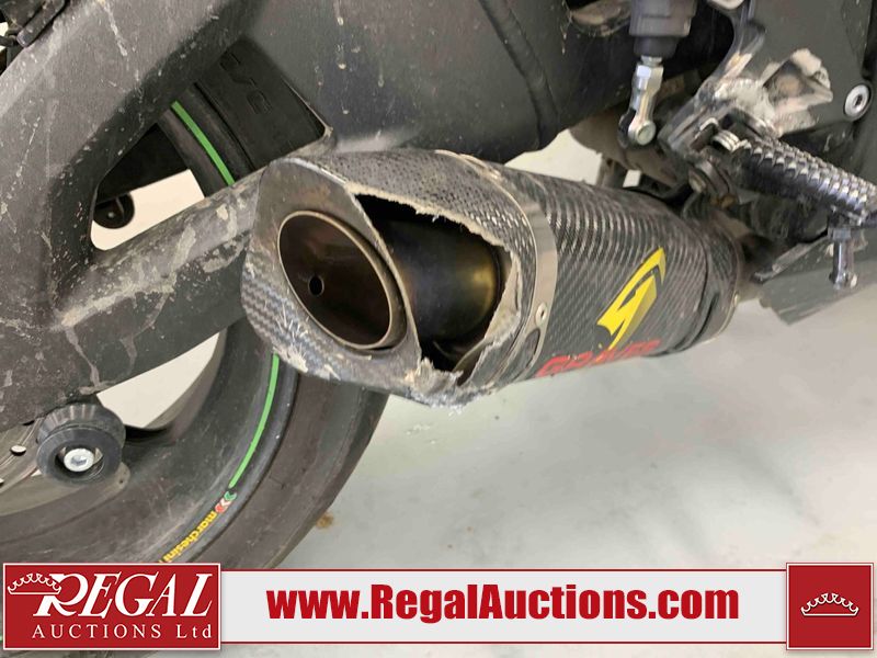 This sports style motorcycle is a 2018 Kawasaki ZX1000ZJF NINJA ZX10RR ABS model. The odometer reads 15,815 km. This unit has been dropped. Most plastics are broken and scraped. The mirrors are missing. The handlebar ends and brake levers have scrapes. The braking clutch lever are bent. The forks are bent. There are scrapes all along the left and right side of the motorcycle. The exhaust is broken. The shift lever and foot peg are missing. And aftermarket exhaust, and a swing arm extension kit have been installed. The seat is torn. The gas tank has dents. The rear mudflap and license plate bracket have been replaced. The signal lights are missing. This unit will need to be towed through the auction, the side engine plate has a punctured a hole and leaks oil. The engine starts and runs. This unit is powered by a 998 cc in-line four-cylinder liquid cooled engine with a six speed manual transmission. Sprocket and chain appears to be in OK condition for you. The rear tire is worn and will need to be replaced. Due to the missing shift lever, the condition of the transmission cannot be confirmed.