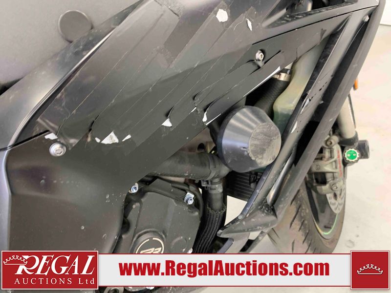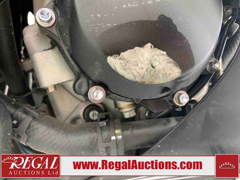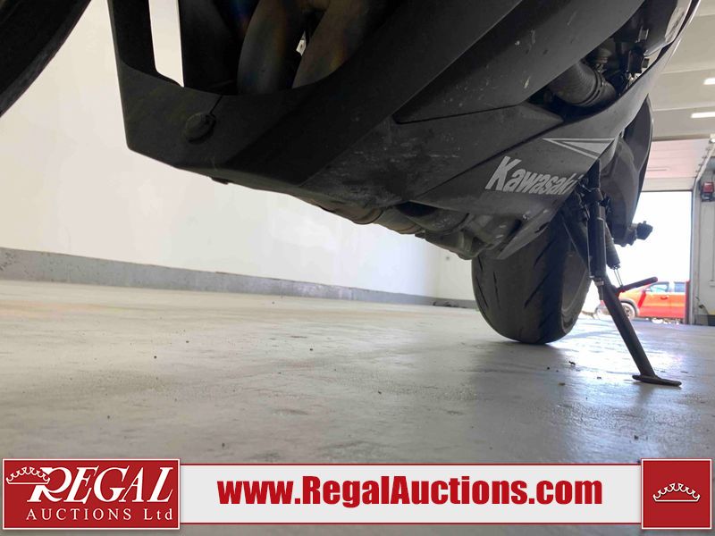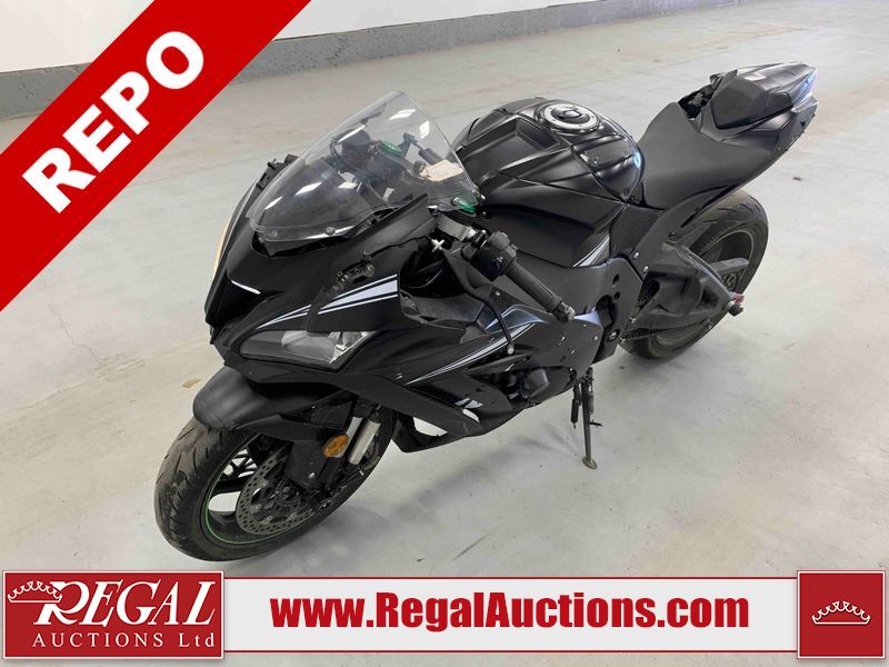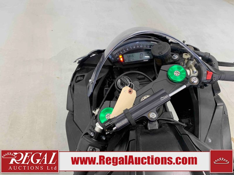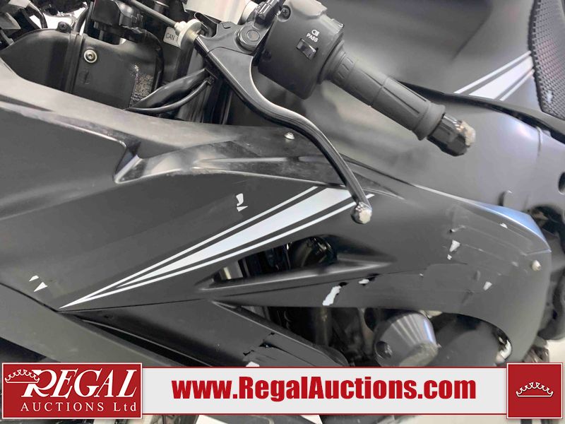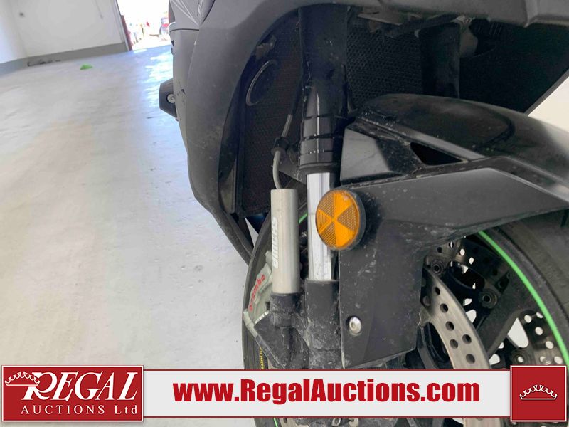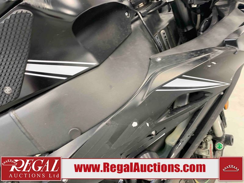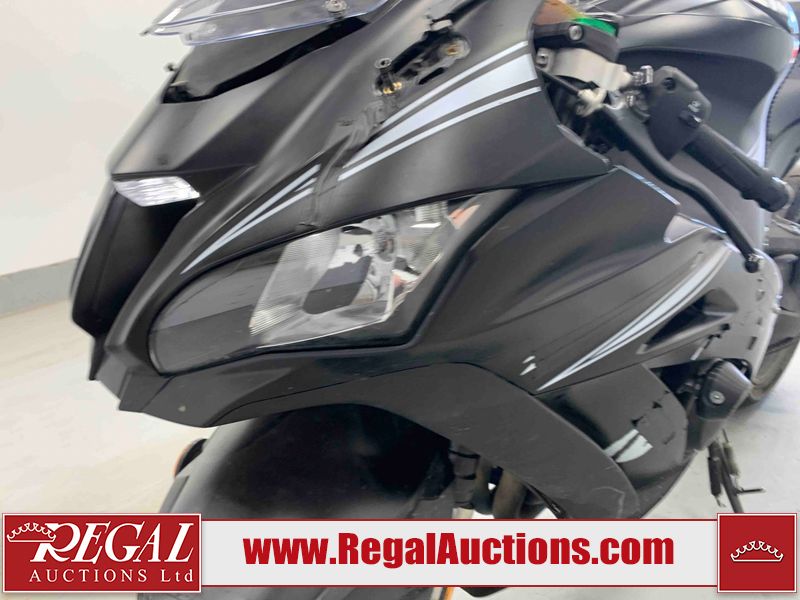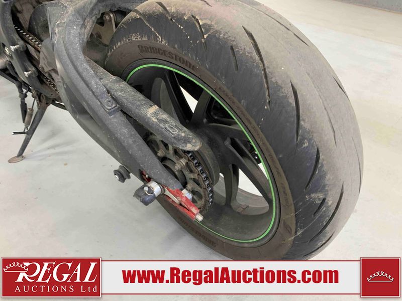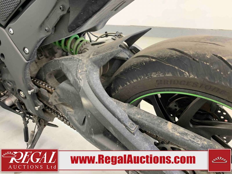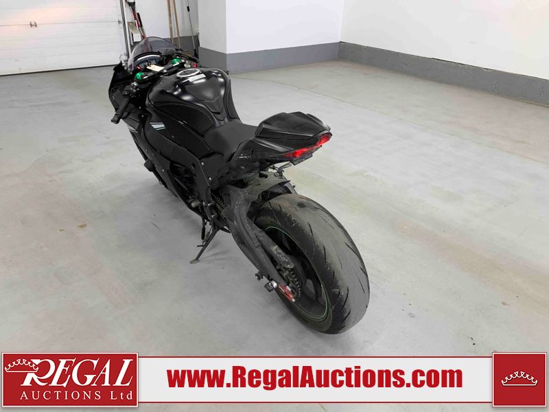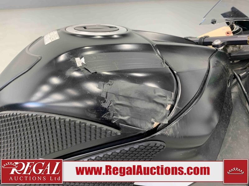 This sports style motorcycle is a 2018 Kawasaki ZX1000ZJF NINJA ZX10RR ABS model. The odometer reads 15,815 km. This unit has been dropped. Most plastics are broken and scraped. The mirrors are missing. The handlebar ends and brake levers have scrapes. The braking clutch lever are bent. The forks are bent. There are scrapes all along the left and right side of the motorcycle. The exhaust is broken. The shift lever and foot peg are missing. And aftermarket exhaust, and a swing arm extension kit have been installed. The seat is torn. The gas tank has dents. The rear mudflap and license plate bracket have been replaced. The signal lights are missing. This unit will need to be towed through the auction, the side engine plate has a punctured a hole and leaks oil. The engine starts and runs. This unit is powered by a 998 cc in-line four-cylinder liquid cooled engine with a six speed manual transmission. Sprocket and chain appears to be in OK condition for you. The rear tire is worn and will need to be replaced. Due to the missing shift lever, the condition of the transmission cannot be confirmed.