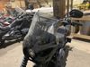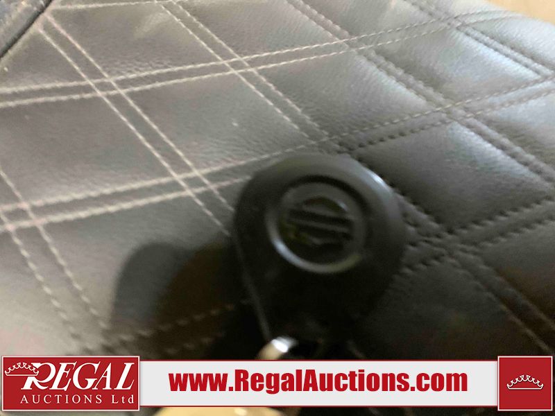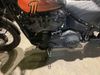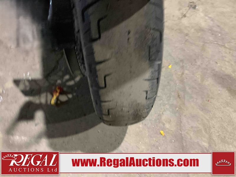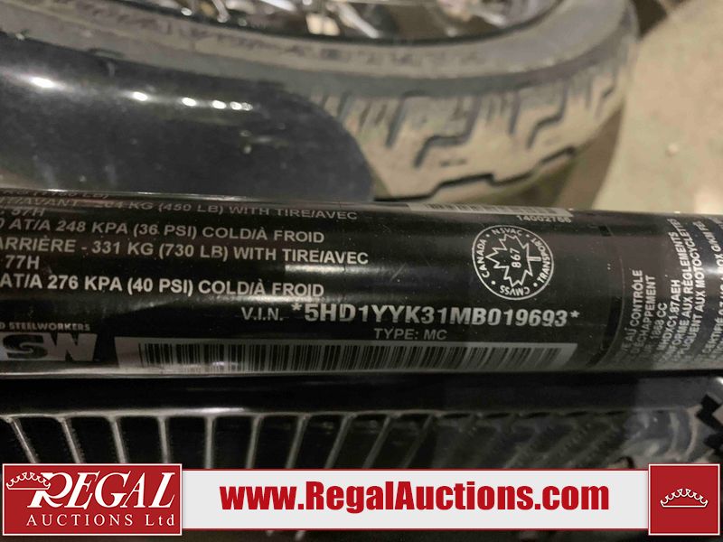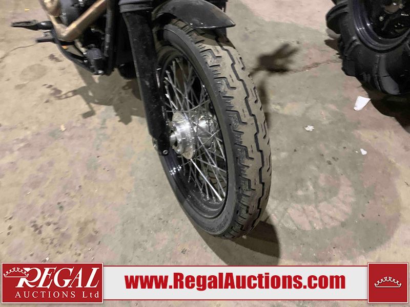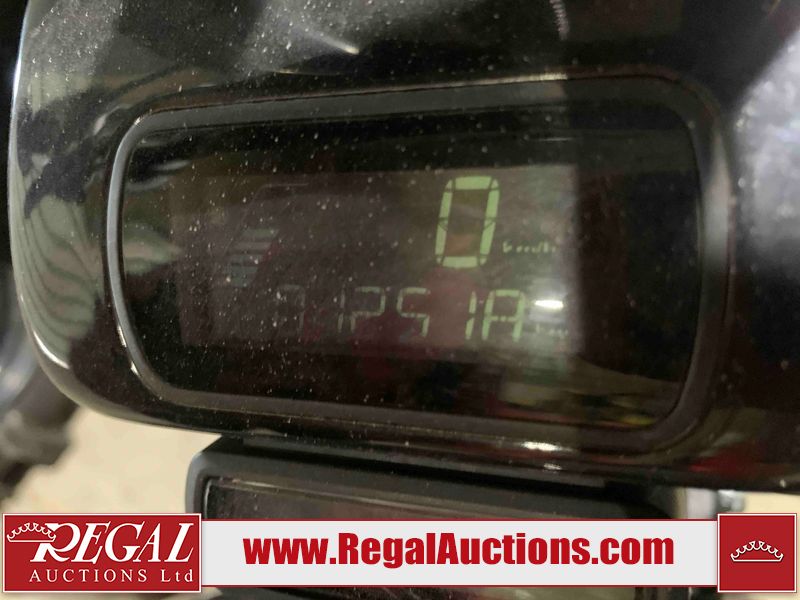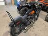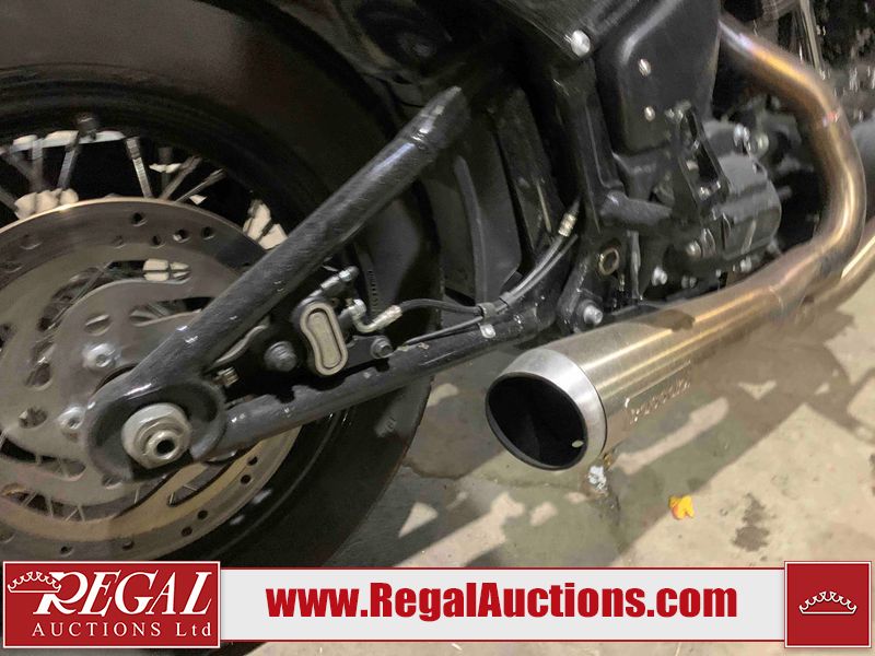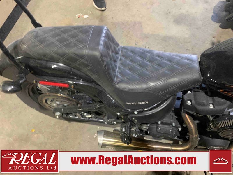 This cruiser style motorcycle is a 2021 Harley Davidson FXBBS Street Bob 114 1,868cc model. The odometer reads 12,518 km. There are chips on the front fender, front fairing, and both side plastics. The tank, front fairing and both fenders have scratches. An aftermarket exhaust, seat, handlebars, and pegs have been installed. The rear tire is showing low tread and will need to be replaced. The engine requires a boost to start. This unit is powered by a 1868cc twin cylinder liquid cooled engine and a six speed manual transmission with a belt final drive.