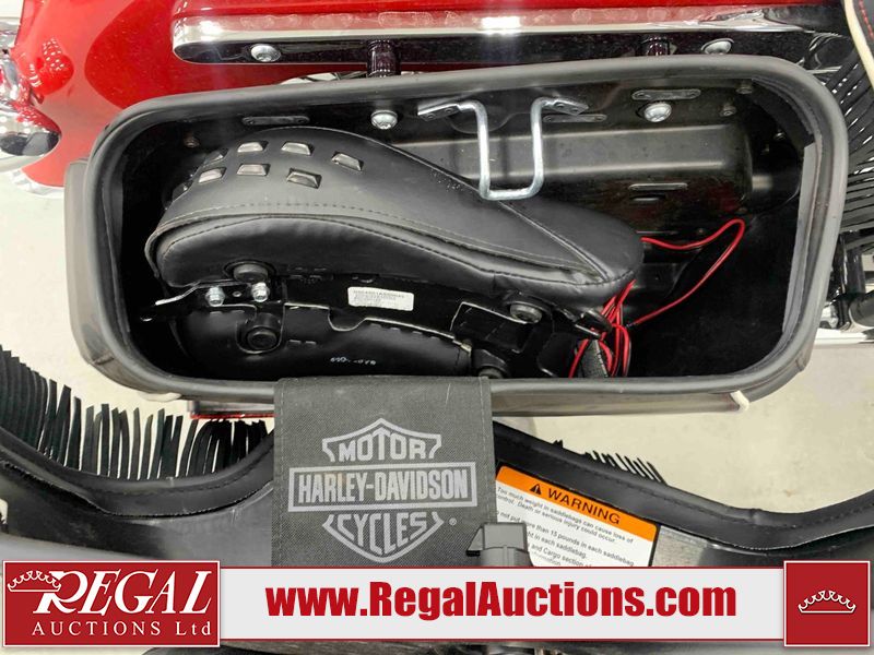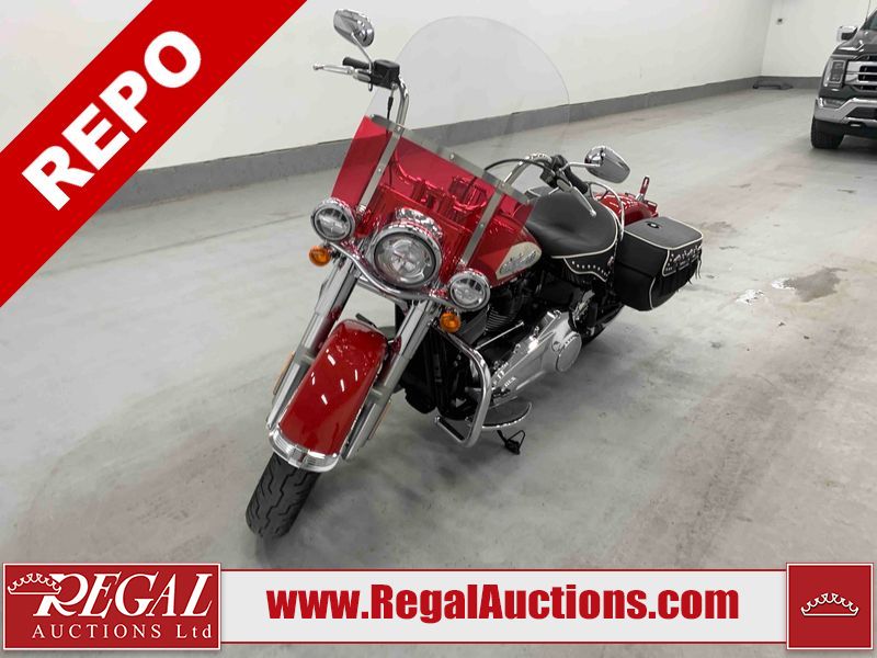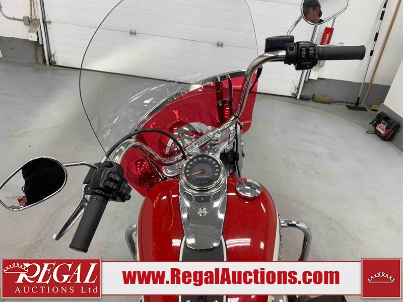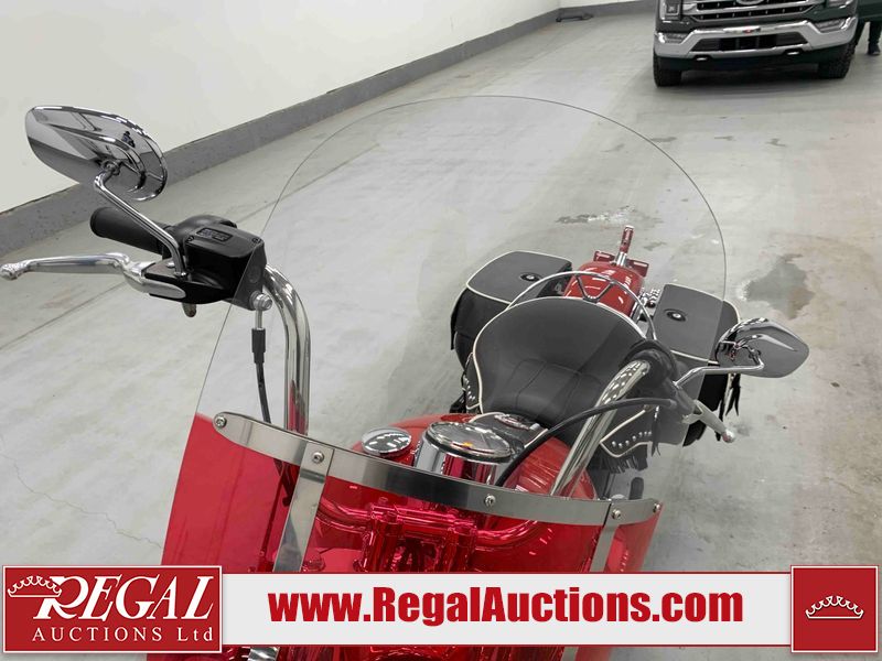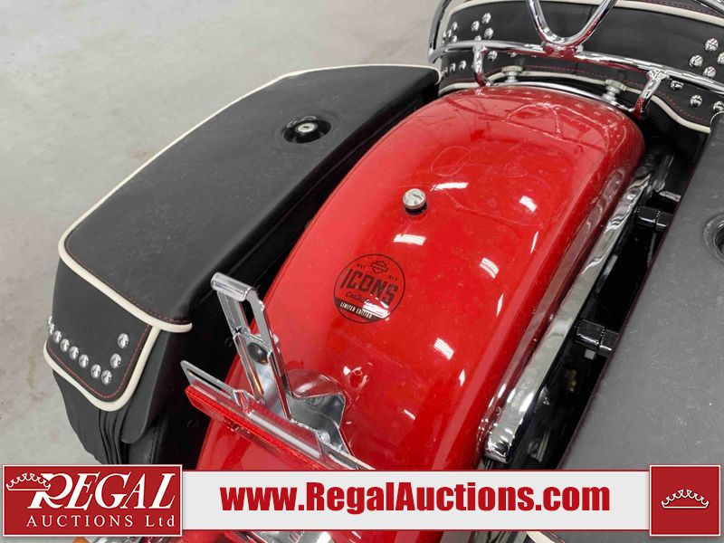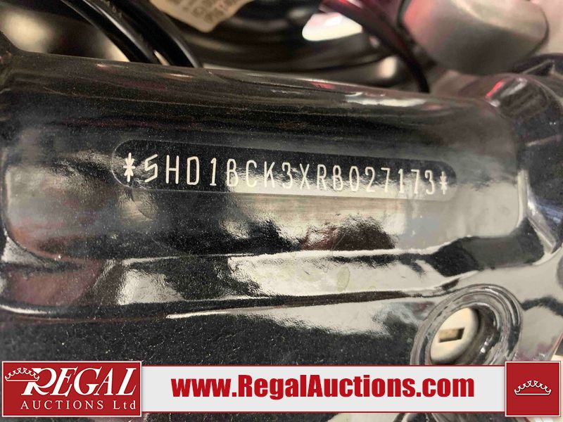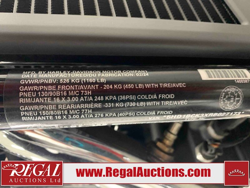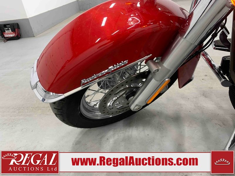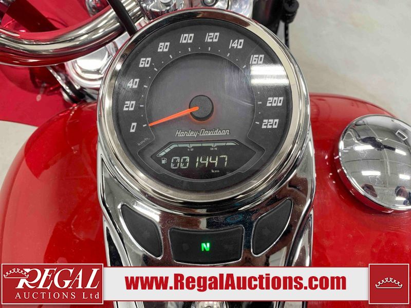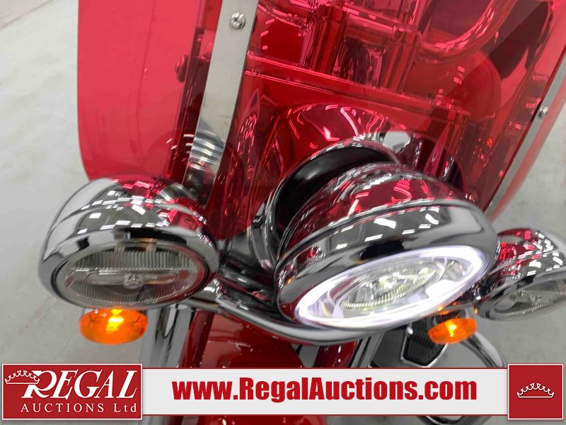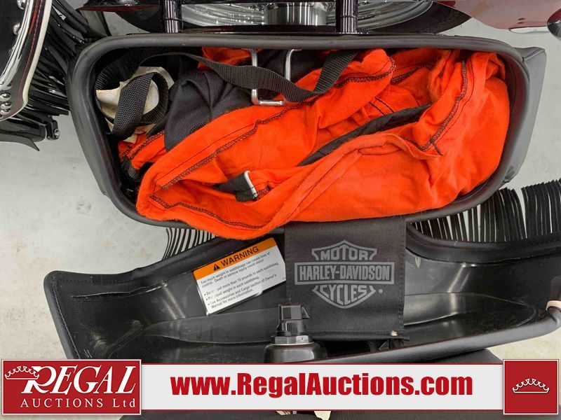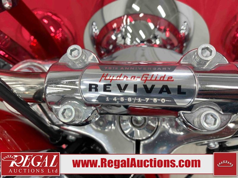 This cruise style motorcycle is a Harley Davidson FLI hydra glide revival model. The odometer reads 1446 km. The gas tank has minor scuffs. This unit starts and runs without a boost. This unit is powered by a 1868 cc air/oil cooled the V twin engine and a six speed manual transmission with a chain final drive. This unit is equipped with cruise control, a second seat, trickle charger, and a cover.