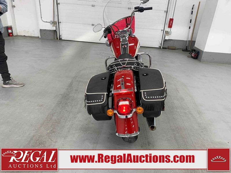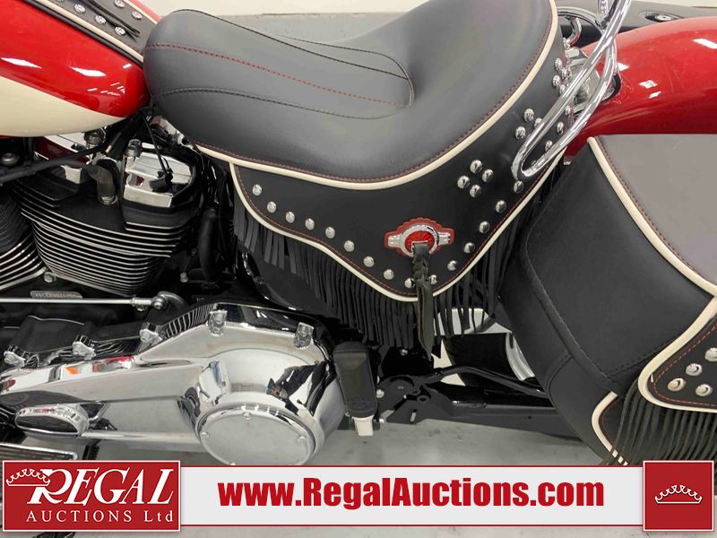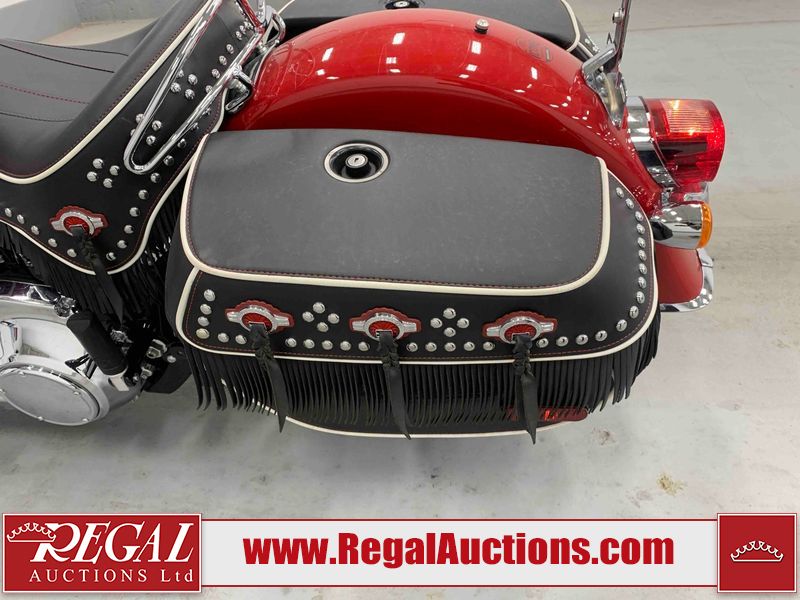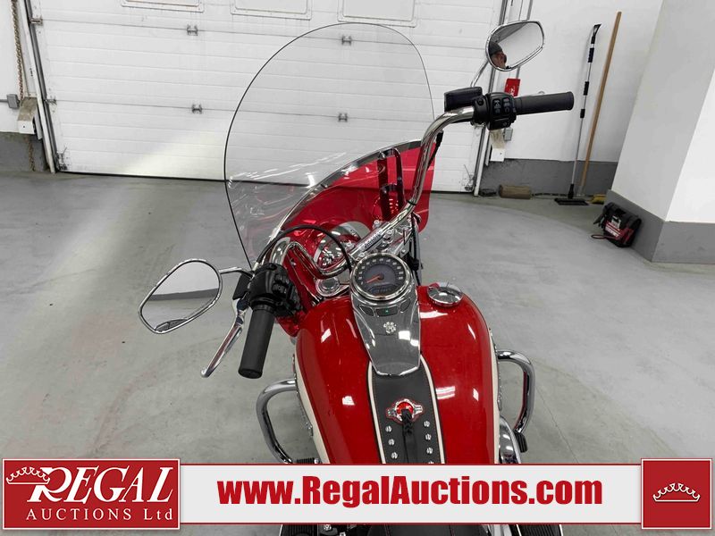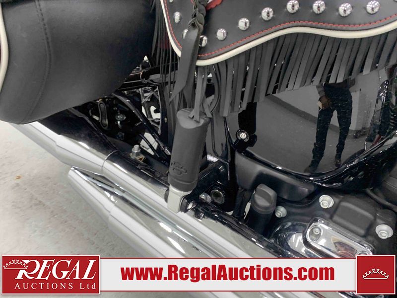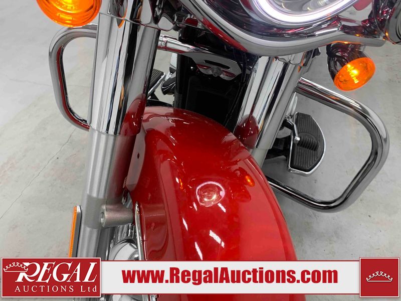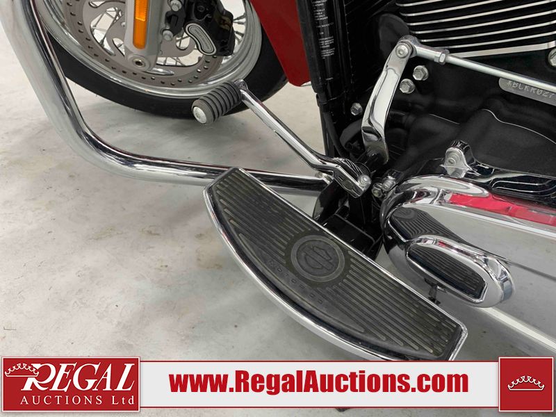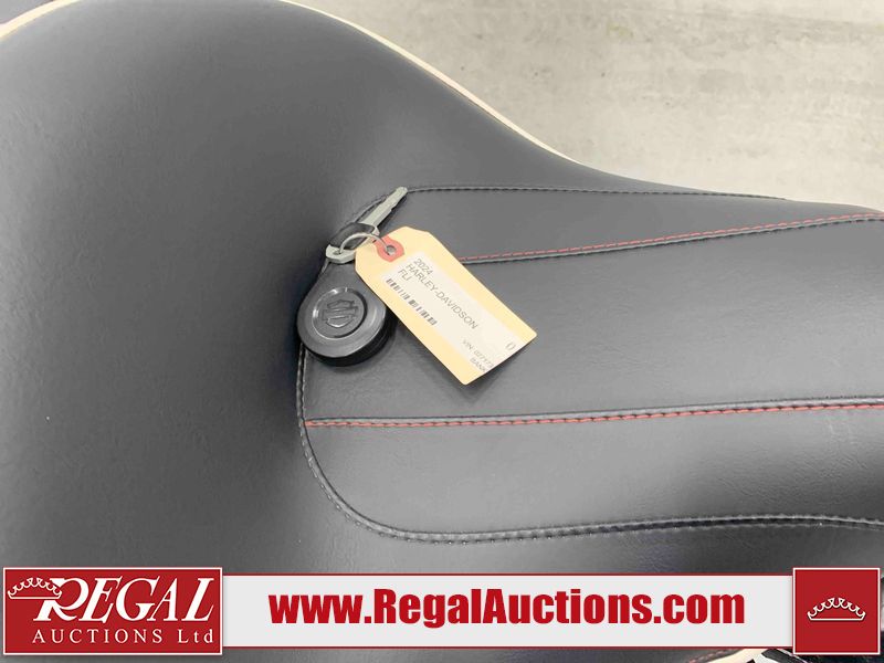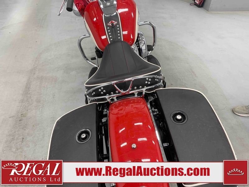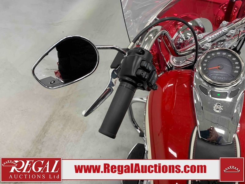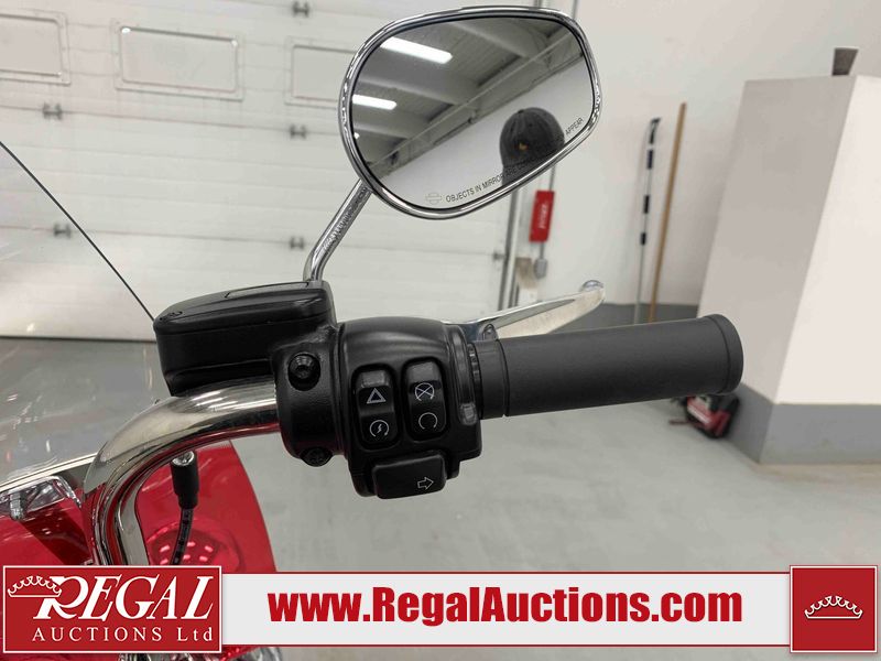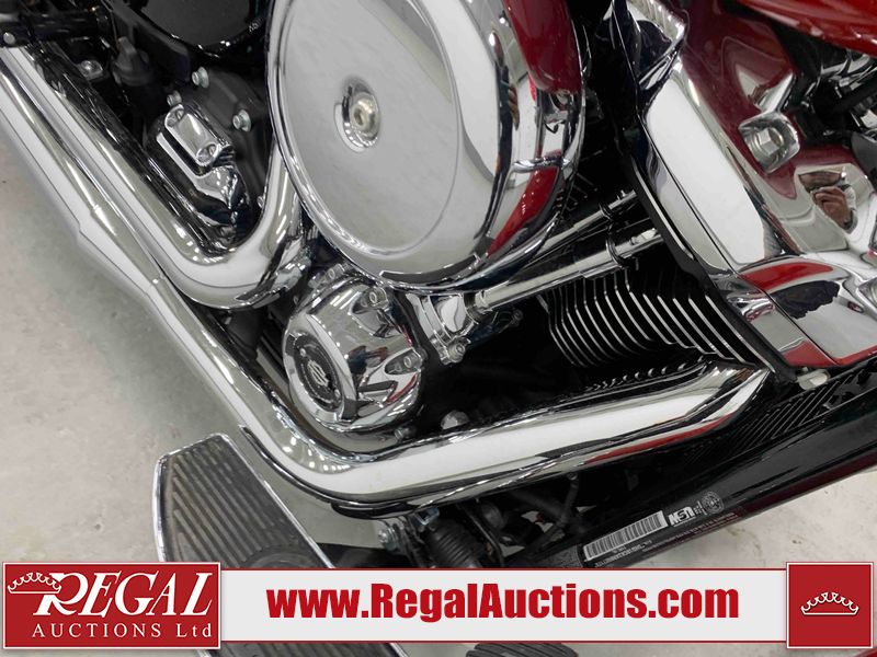 This cruise style motorcycle is a Harley Davidson FLI hydra glide revival model. The odometer reads 1446 km. The gas tank has minor scuffs. This unit starts and runs without a boost. This unit is powered by a 1868 cc air/oil cooled the V twin engine and a six speed manual transmission with a chain final drive. This unit is equipped with cruise control, a second seat, trickle charger, and a cover.