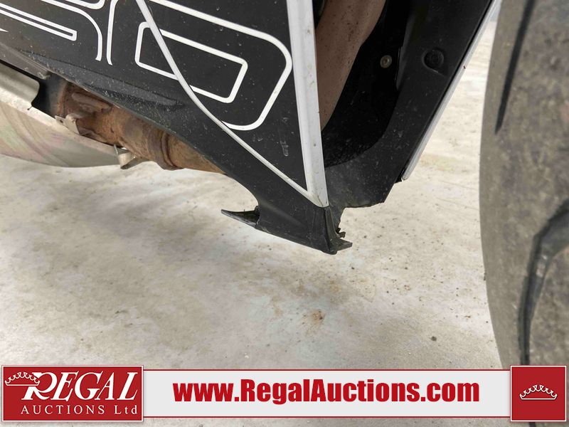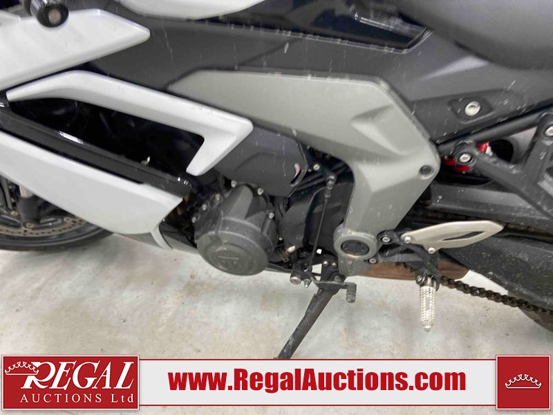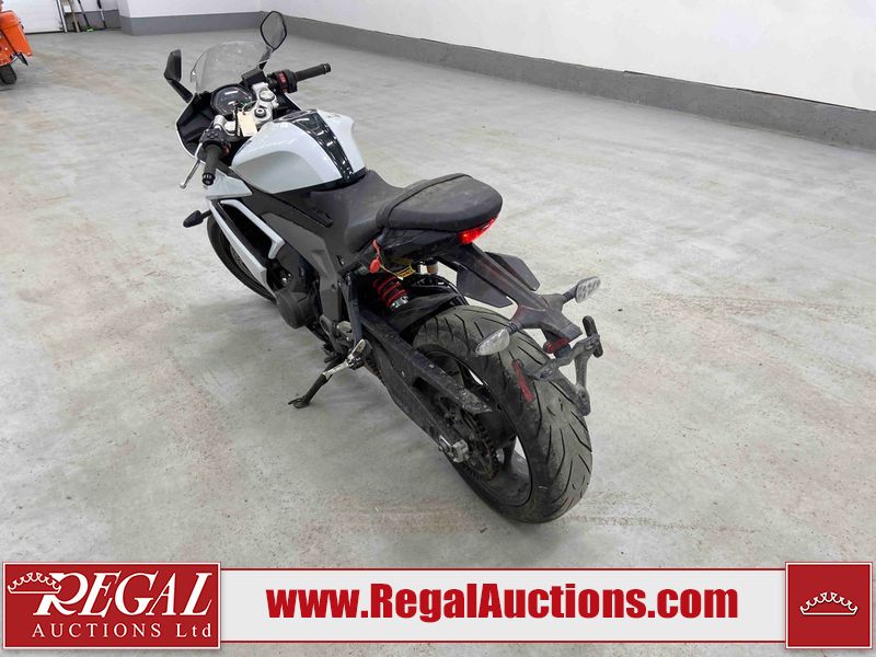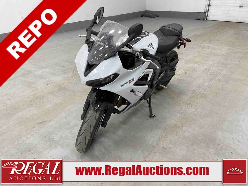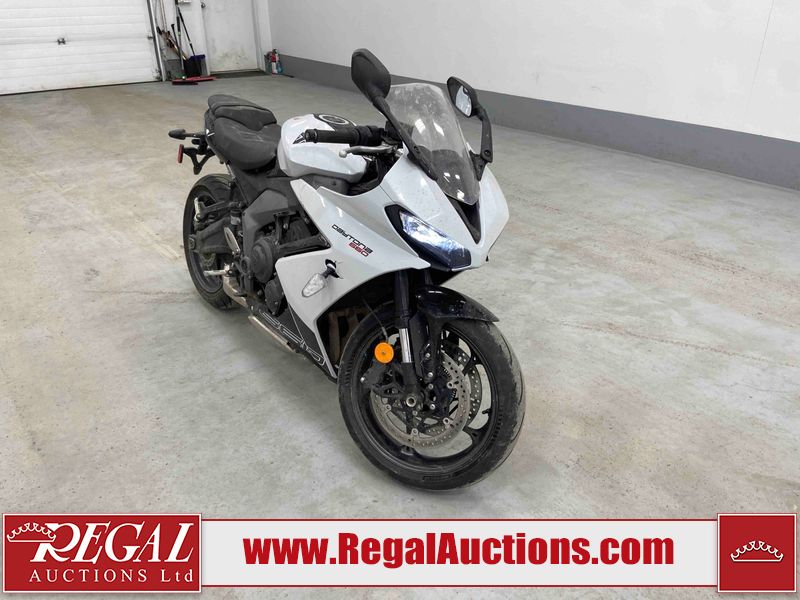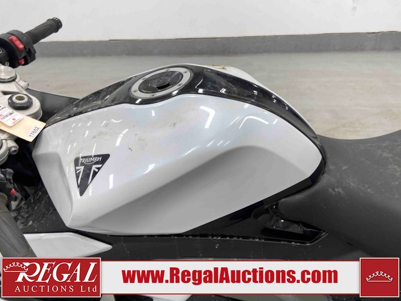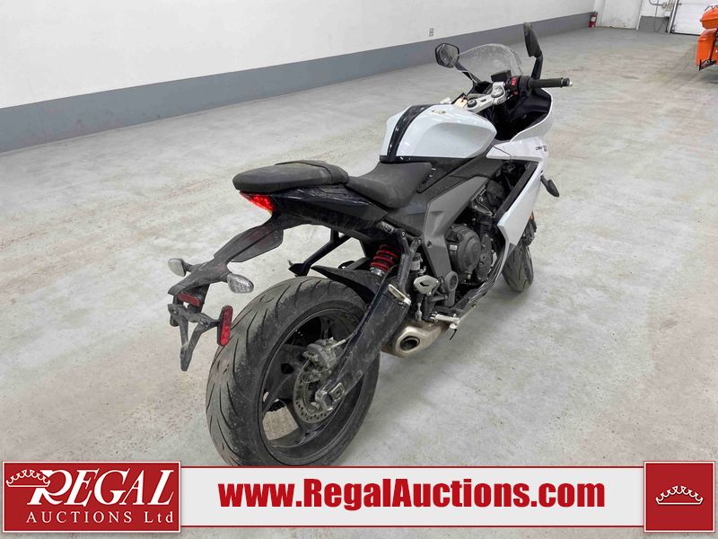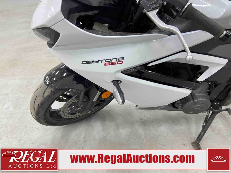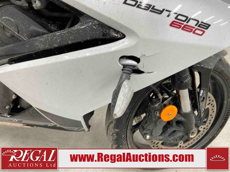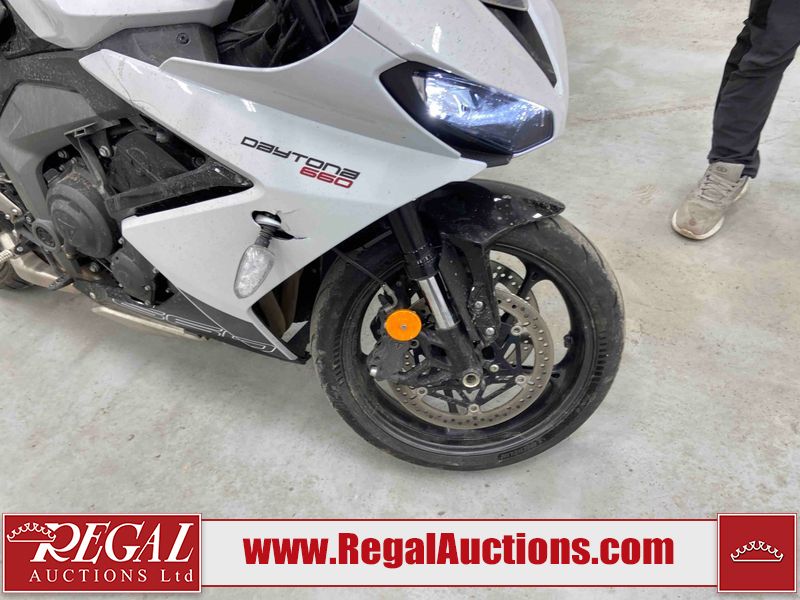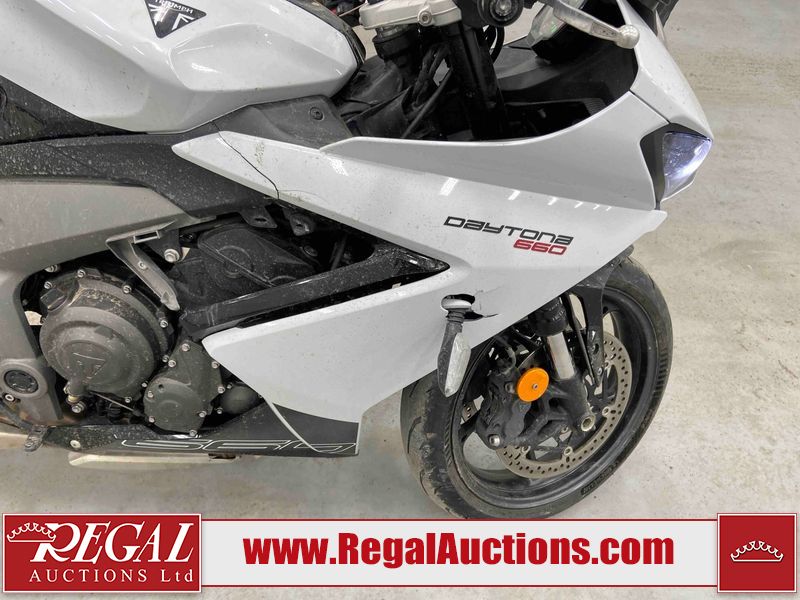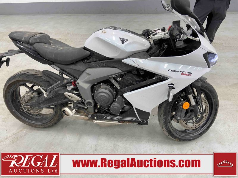 This sports style motorcycle is a 2025 triumph Daytona 660 model. The odometer reads 11,621 km. The front fender and front fairing has light chips. The gas tank has scuffs. The foot pegs have scuffs. The lower plastic fairing is broken. The exhaust heat shield is broken and bent. The right signal light is broken off of the side plastics. Both side plastics are cracked. One of the right side plastics are missing. This unit is powered by a liquid cooled four stroke in three cylinder 600 cc engine and a six speed manual transmission with a chain final drive. The chain and sprockets are showing rust. The tires have plenty of tread remaining.