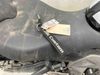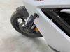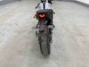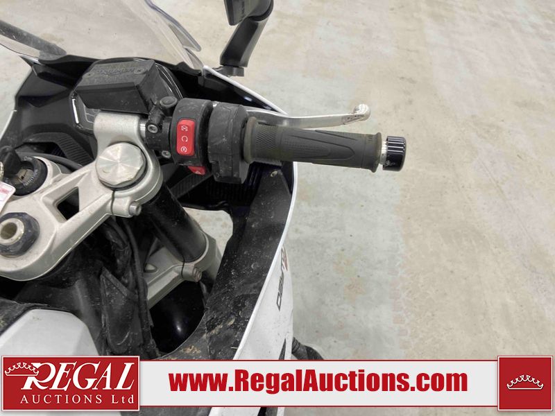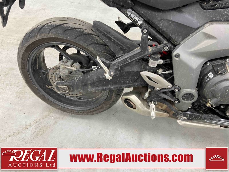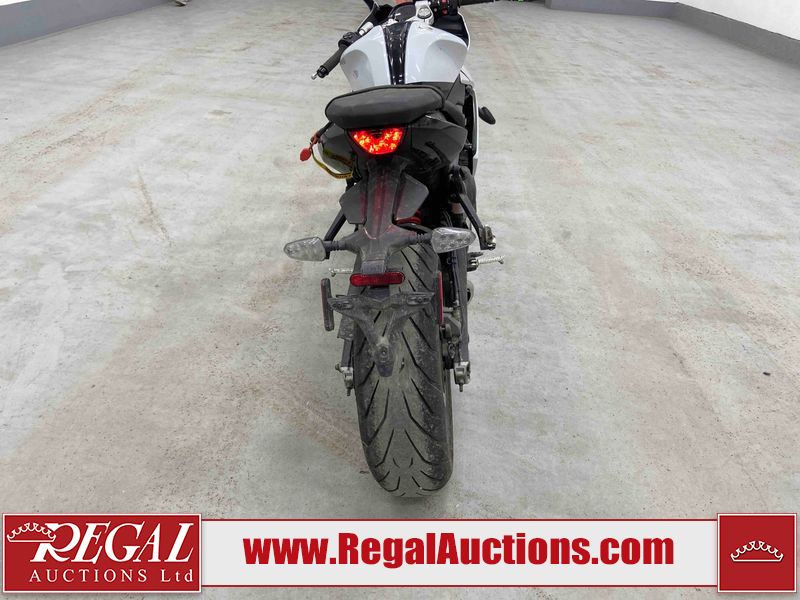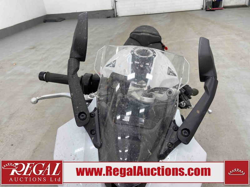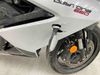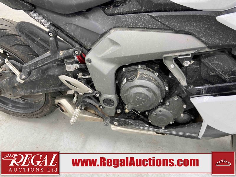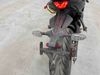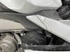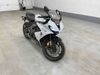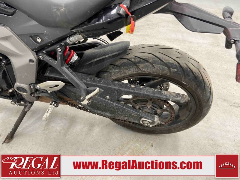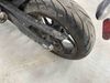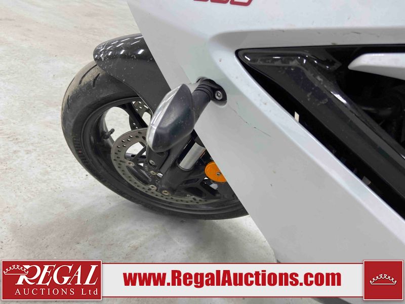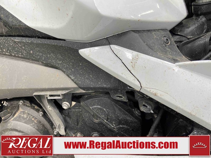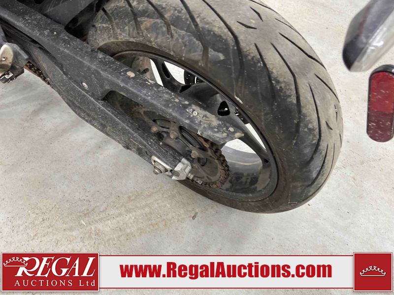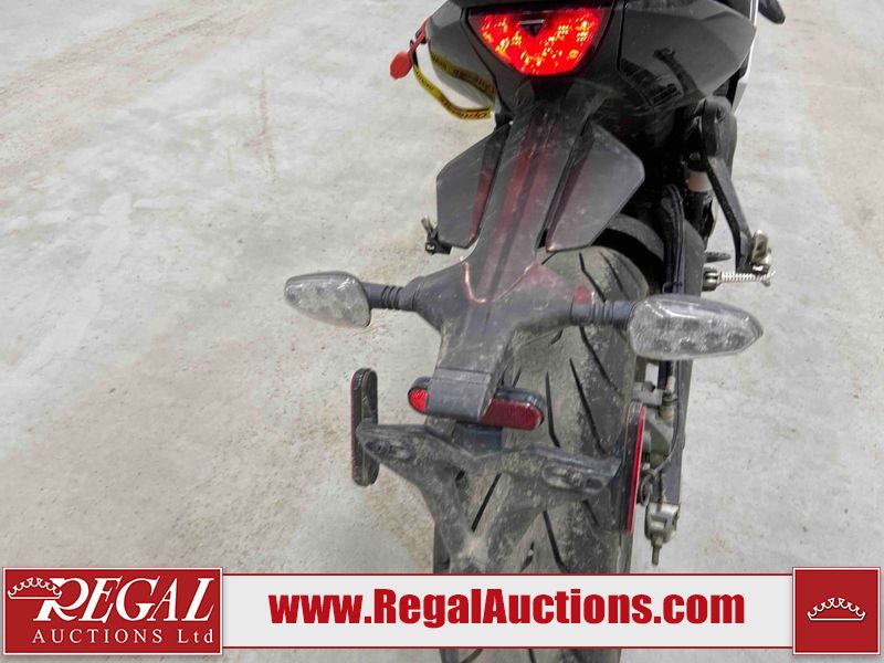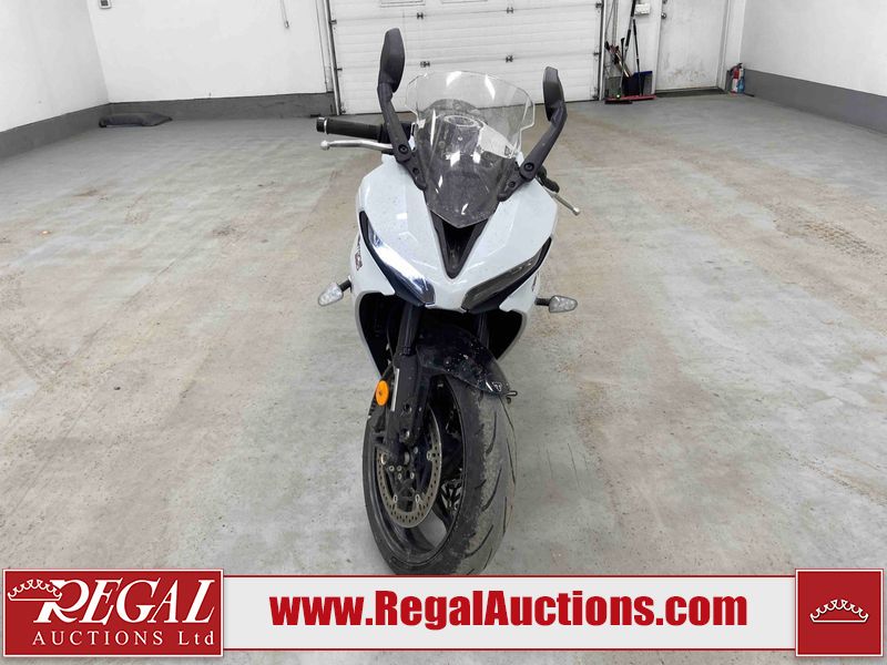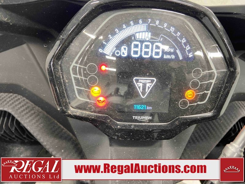This sports style motorcycle is a 2025 triumph Daytona 660 model. The odometer reads 11,621 km. The front fender and front fairing has light chips. The gas tank has scuffs. The foot pegs have scuffs. The lower plastic fairing is broken. The exhaust heat shield is broken and bent. The right signal light is broken off of the side plastics. Both side plastics are cracked. One of the right side plastics are missing. This unit is powered by a liquid cooled four stroke in three cylinder 600 cc engine and a six speed manual transmission with a chain final drive. The chain and sprockets are showing rust. The tires have plenty of tread remaining.